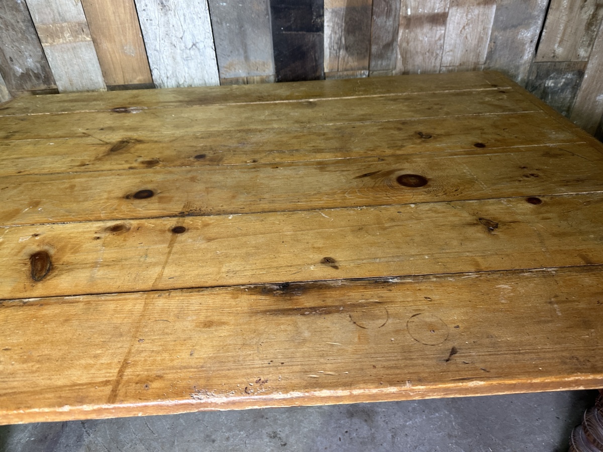 Good genuine example of a solid pine Victorian rectangular Pine Dining Table, dating from the mid 19th century. Excellent colour to the thick pine plank top with cleated ends. Tapered pitch pine leg base. Solid and sturdy piece.