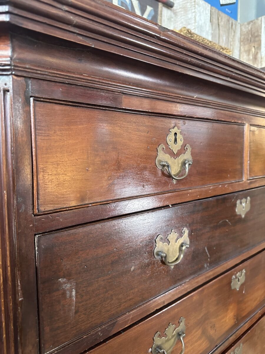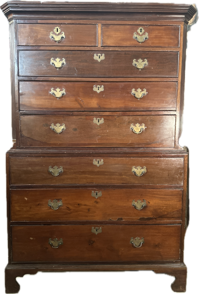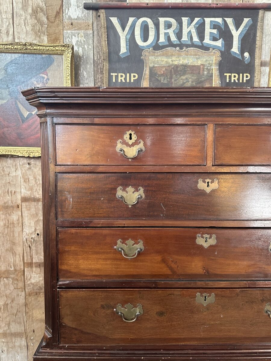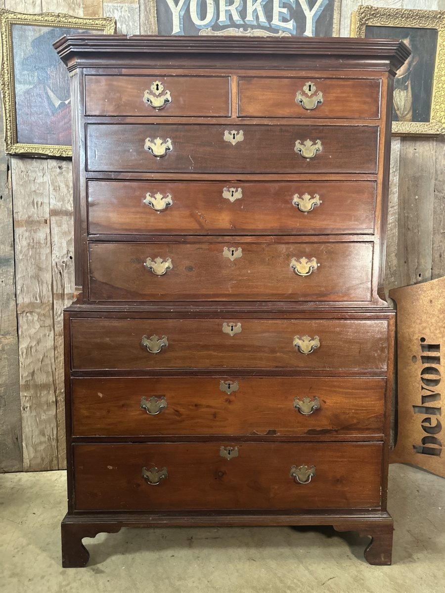George III mahogany chest on chest, the upper part with a moulded cornice and cut corners, containing two short and three long frieze drawers, between fluted canted angles. Lower section with three long graduated frieze drawers, on bracket feet. Brass handles. Good solid order throughout.
