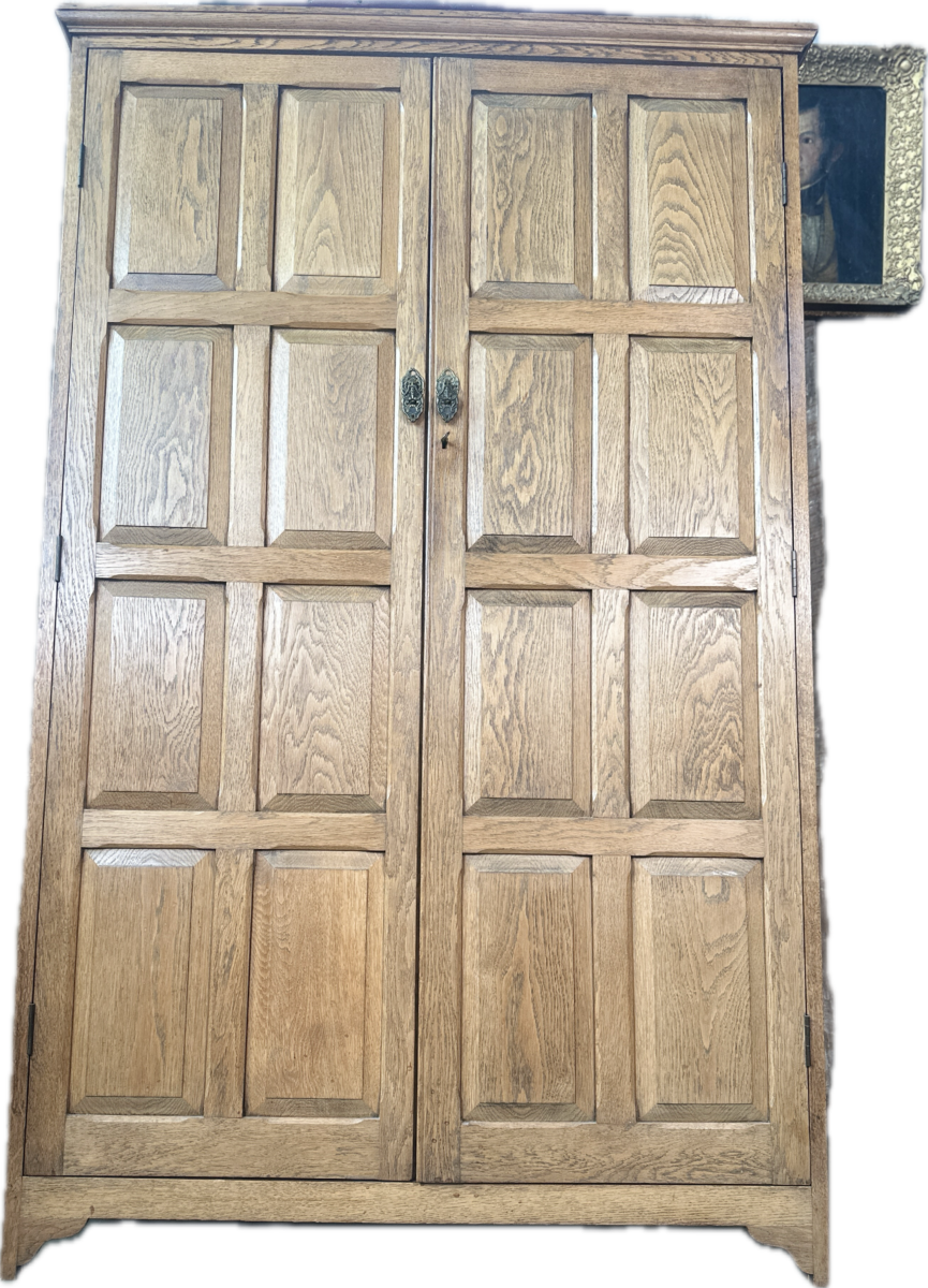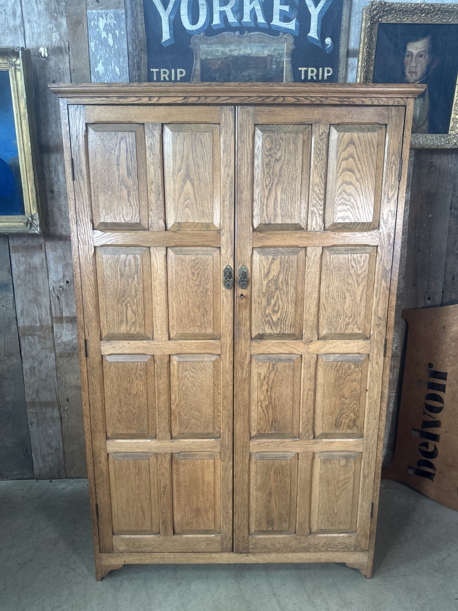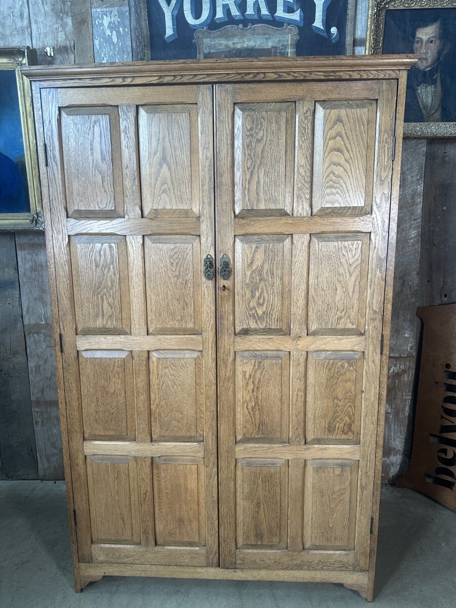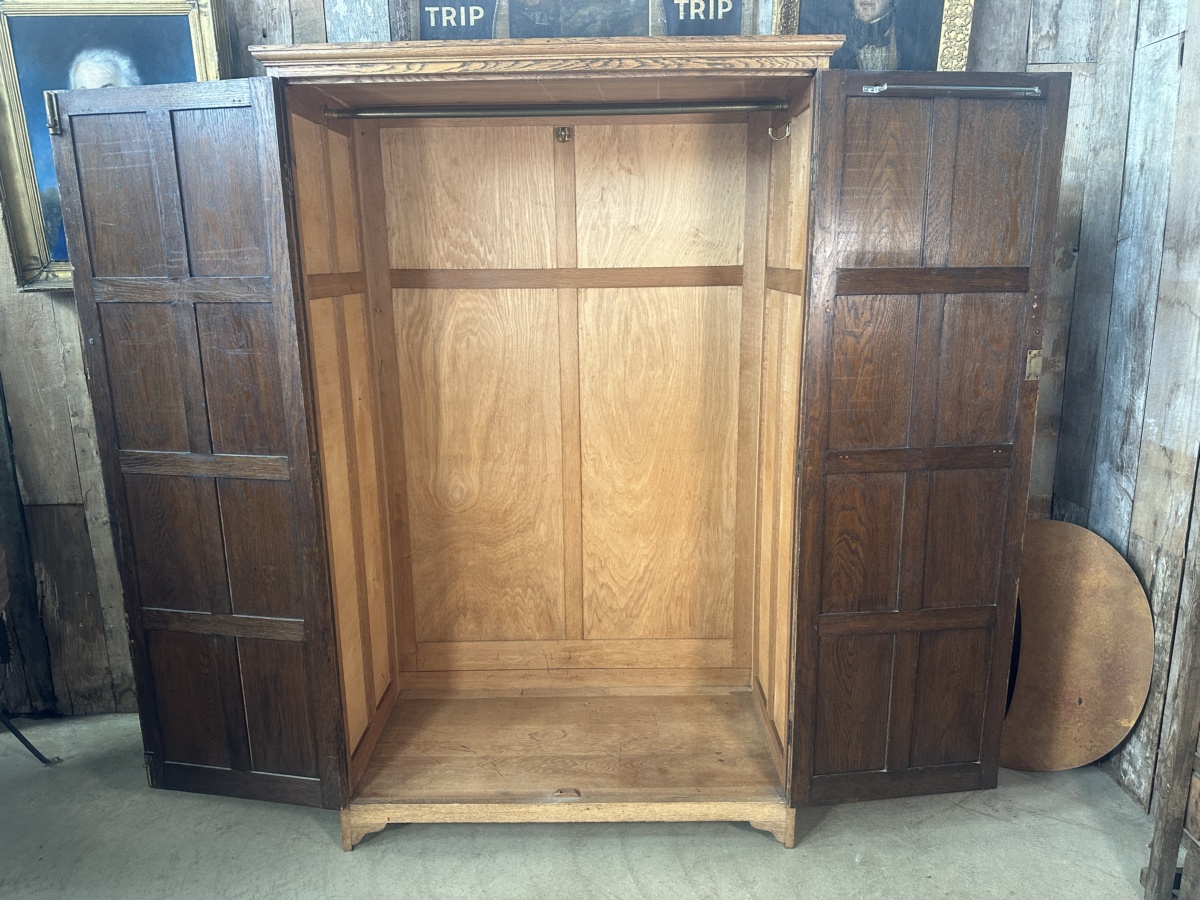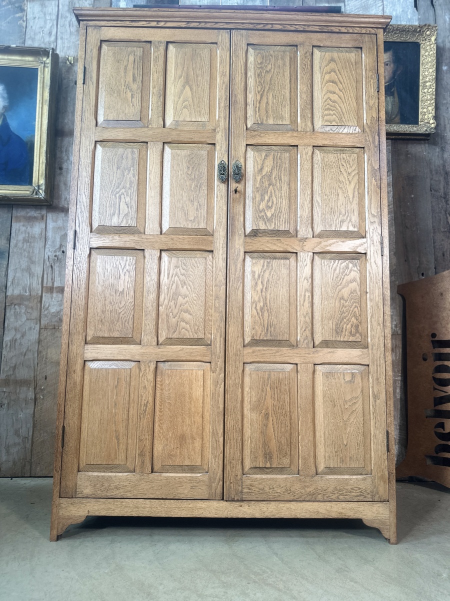 Antique Arts and Crafts Oak Panelled Double Wardrobe Armoire, c 1930