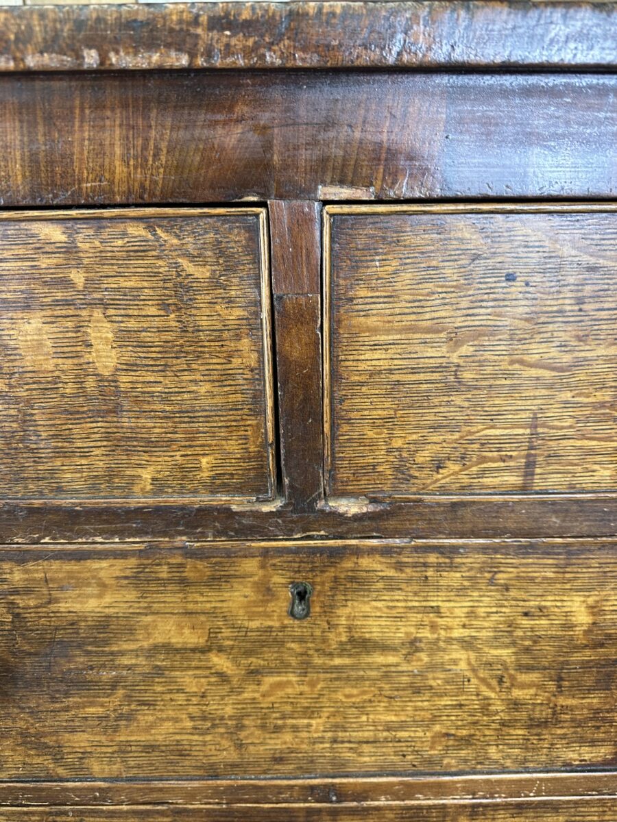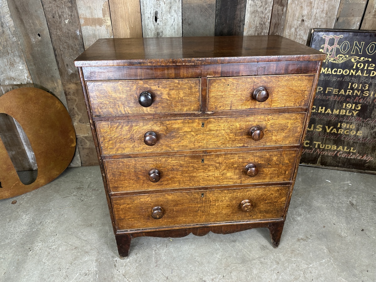 An original Georgian Chest of Drawers 2 over 3, datong from circa 1820. In mahogany and oak. Solid Oak with mahogany veneers. Turned sycamore knobs. Brass escutcheons, bracket feet, caddy top.