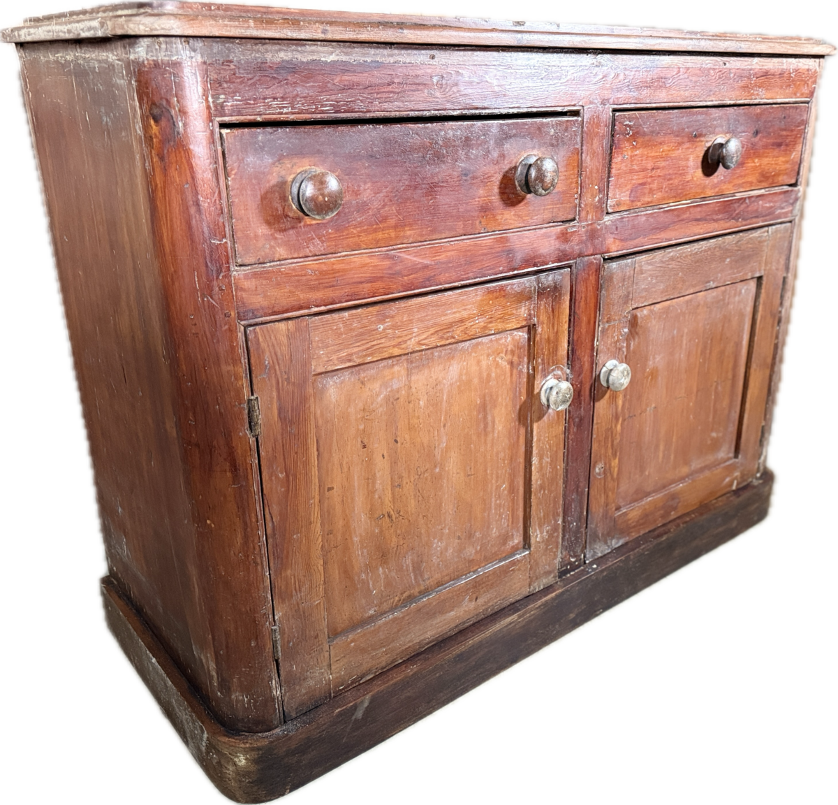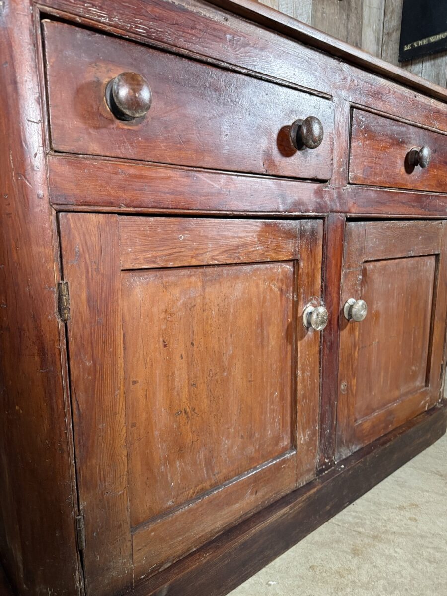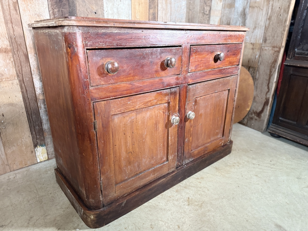 A well patinated and coloured solid pine mid-Victorian Housekeeper Base Cupboard Dresser, dating from the early nineteenth century. Shaped top with plate rack bevel to rear, over two large frieze drawers, over two panelled cupboard doors. The interior with fitted shelved interior. Plinth base. Good solid order throughout