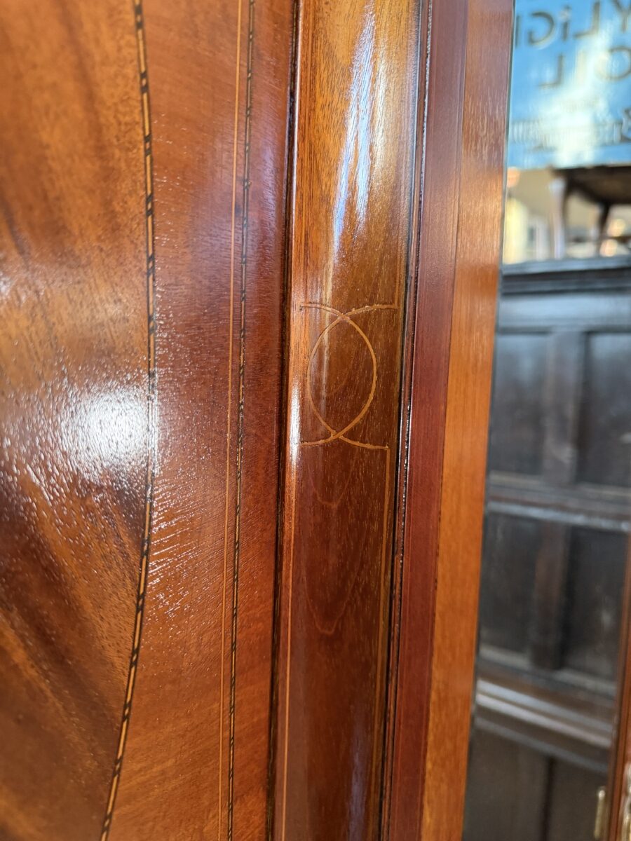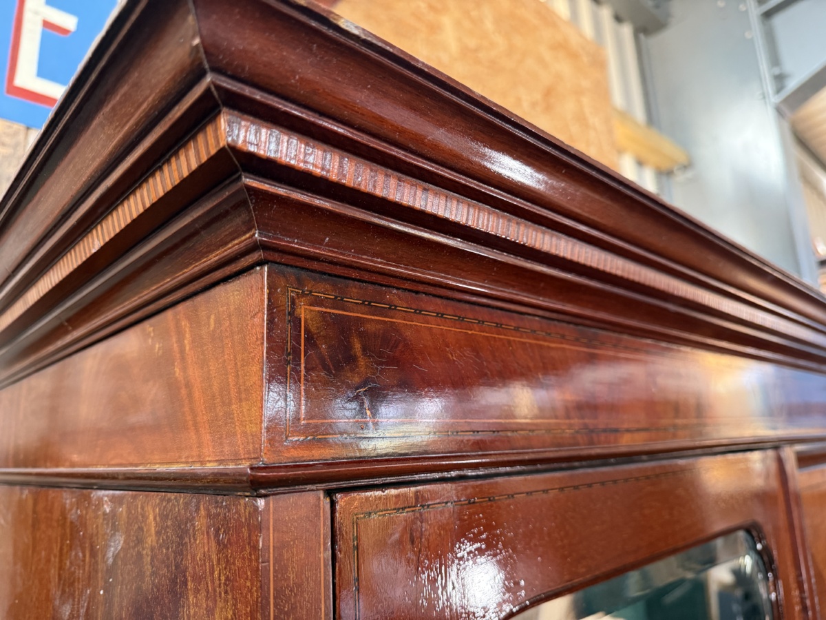 A superb example solid mahogany triple compactum wardrobe, dating from the early 1900s. Flush moulded cornice with extensive boxwood and fruitwood inlay. Central inlaid section with panelled cupboard door, opening to reveal fitted shelved interior. Over a series of four frieze graduated drawers. Flanked by two full length bevelled mirror cupboard doors, opening to reveal fitted shelf with hanging rail and hooks. Maker’s label present. Surmounted on by plinth base. Disassembles into several sections for ease of installation.