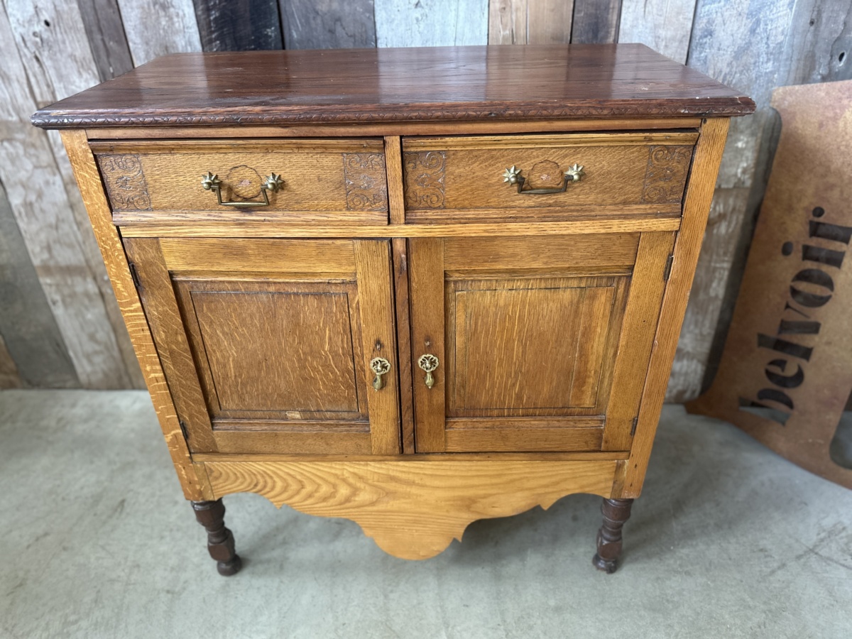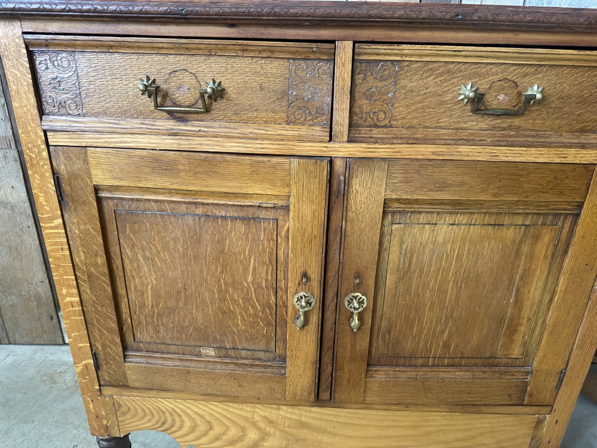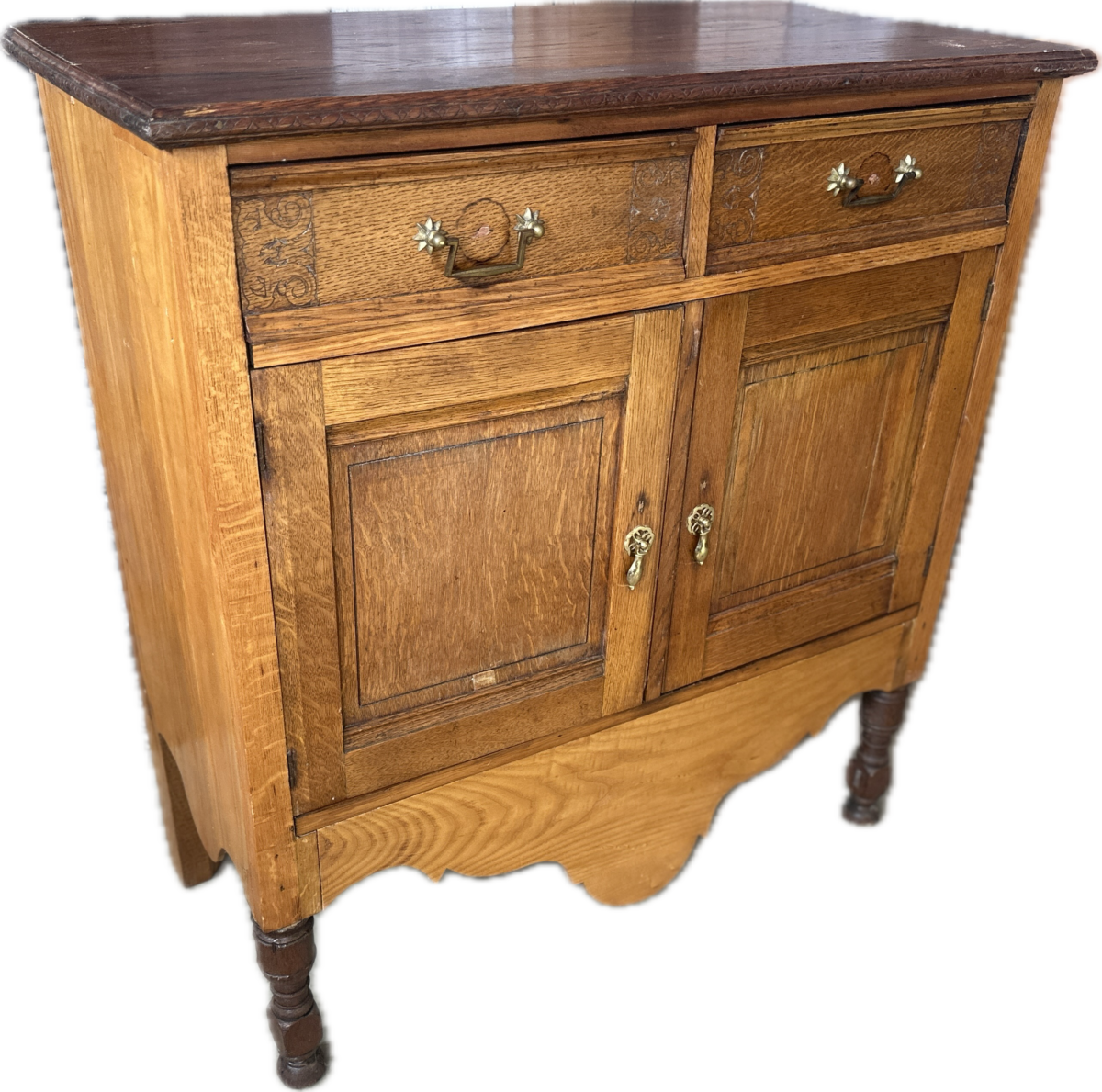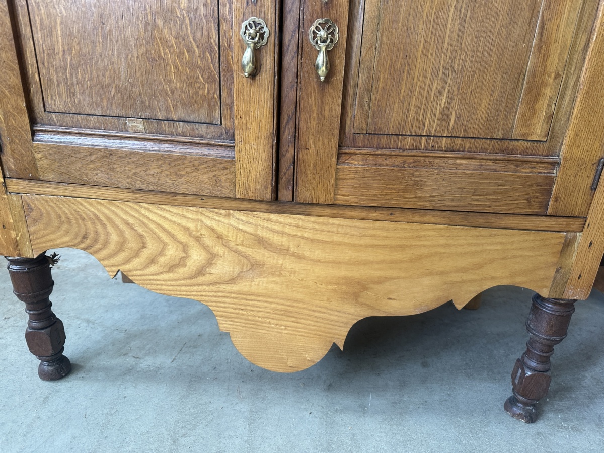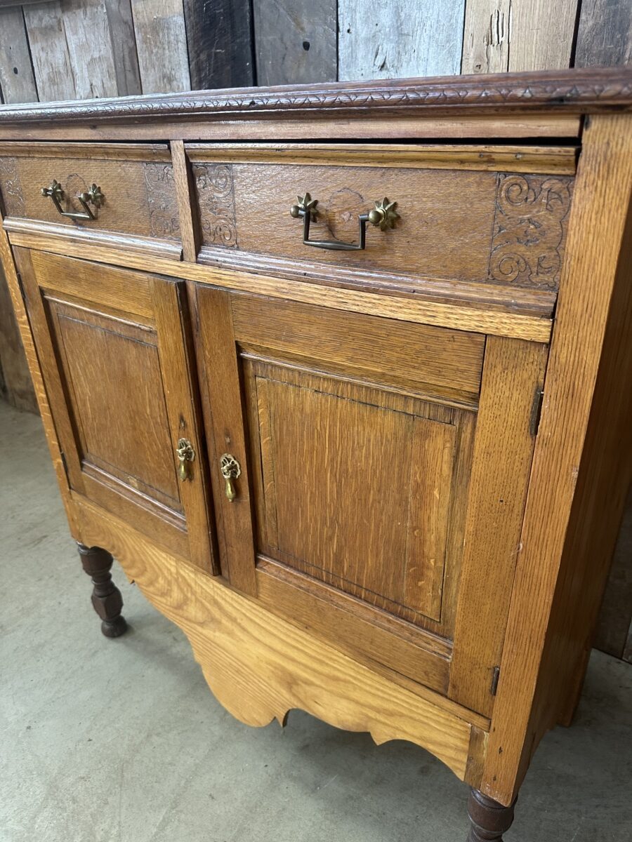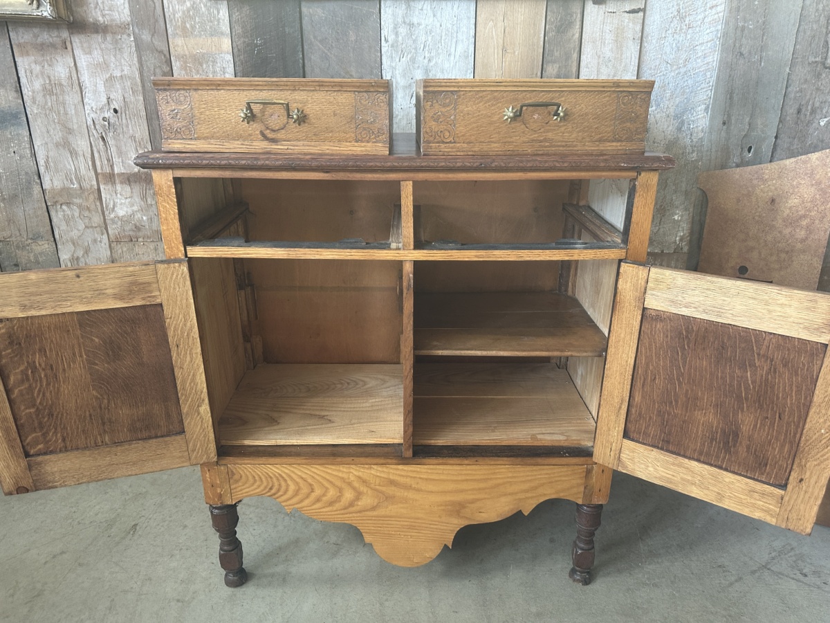 A neatly proportioned solid oak Edwardian hall larder cupboard, dating from nearly 1900’s. Plank top with carved chamfered edging. Two frieze drawers, over double panelled cupboard doors. The interior of each benefiting with fitted shelves and open cupboard space. Shaped apron. Turned legs. Brass handles.