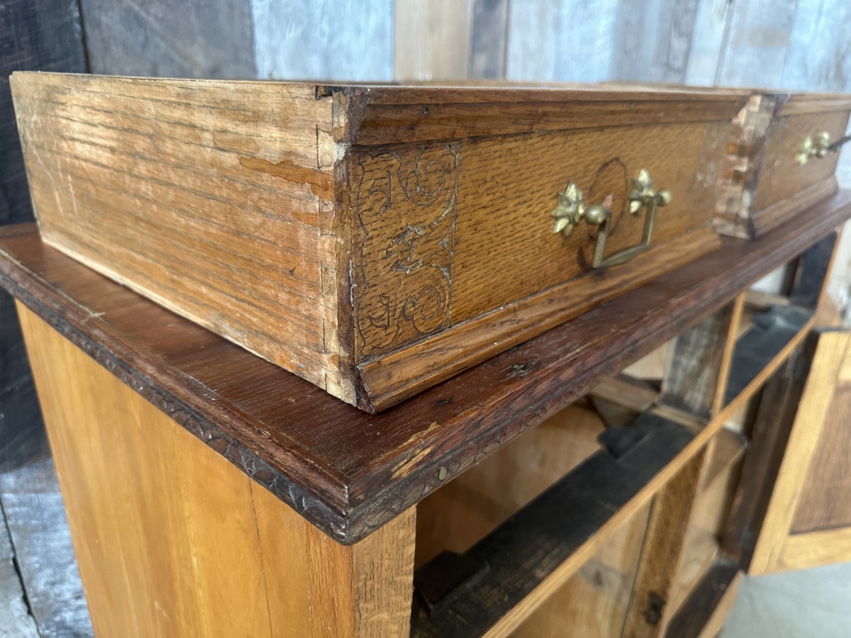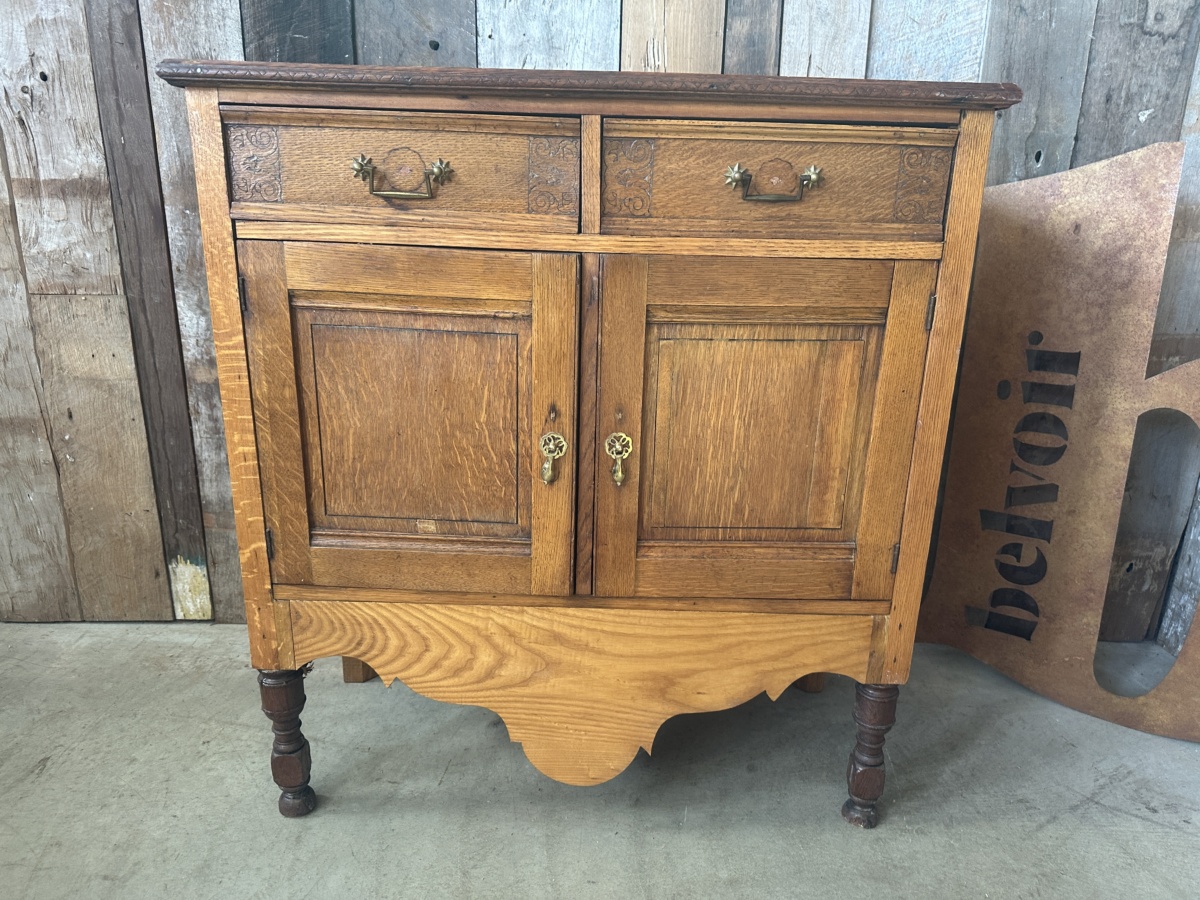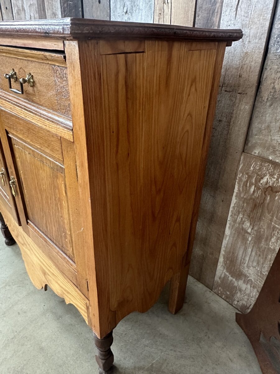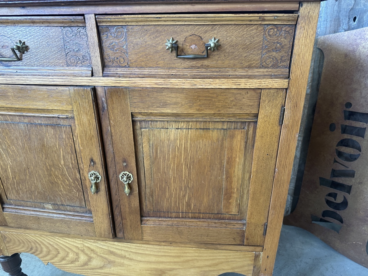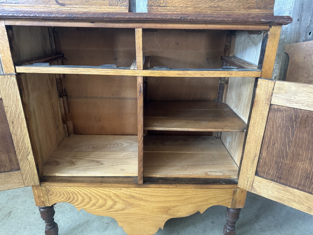 A neatly proportioned solid oak Edwardian hall larder cupboard, dating from nearly 1900’s. Plank top with carved chamfered edging. Two frieze drawers, over double panelled cupboard doors. The interior of each benefiting with fitted shelves and open cupboard space. Shaped apron. Turned legs. Brass handles.