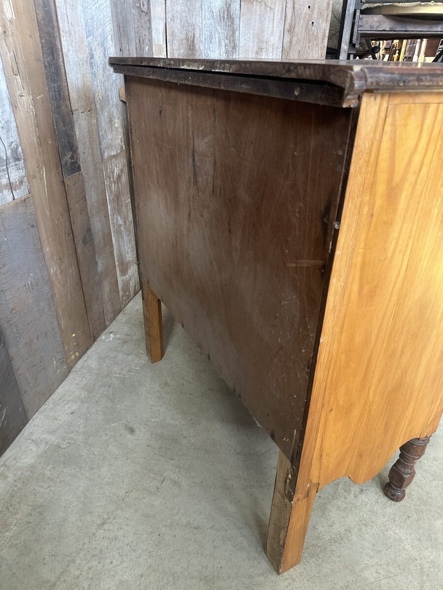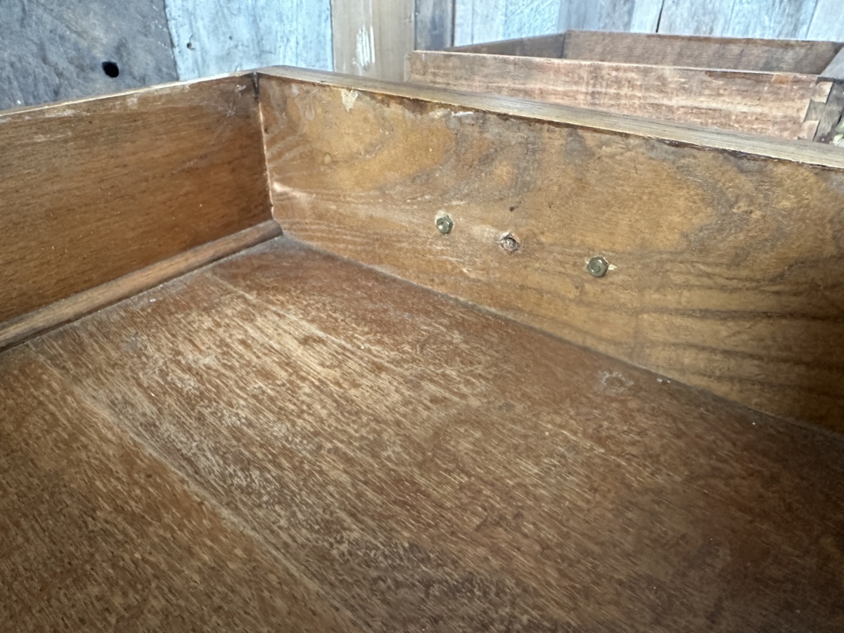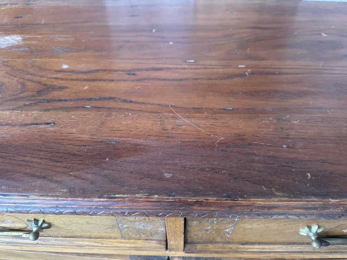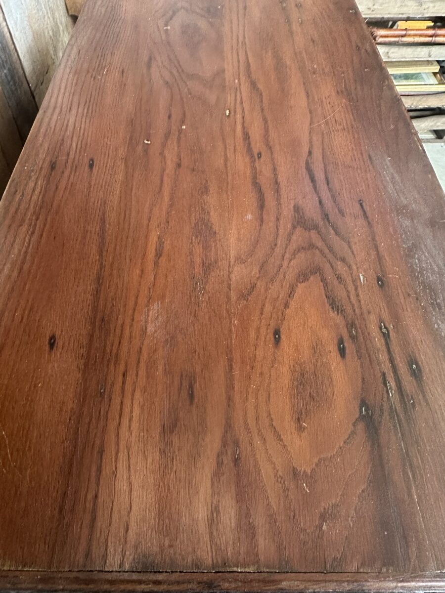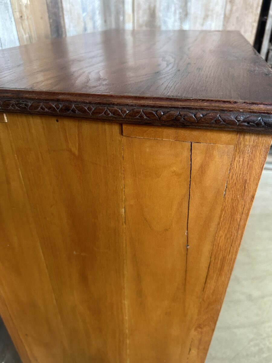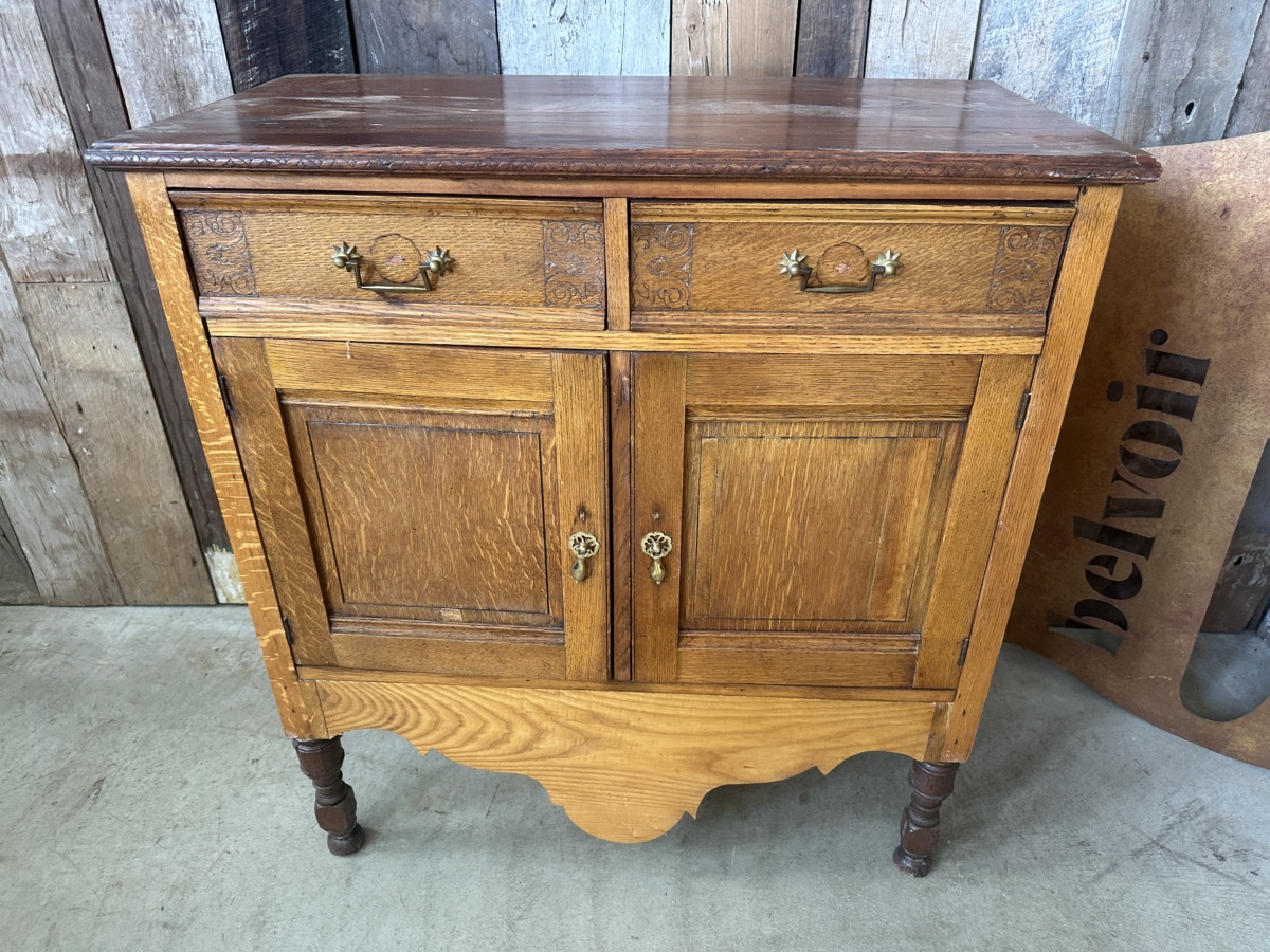 A neatly proportioned solid oak Edwardian hall larder cupboard, dating from nearly 1900’s. Plank top with carved chamfered edging. Two frieze drawers, over double panelled cupboard doors. The interior of each benefiting with fitted shelves and open cupboard space. Shaped apron. Turned legs. Brass handles.