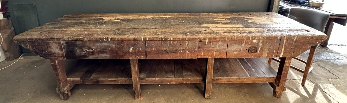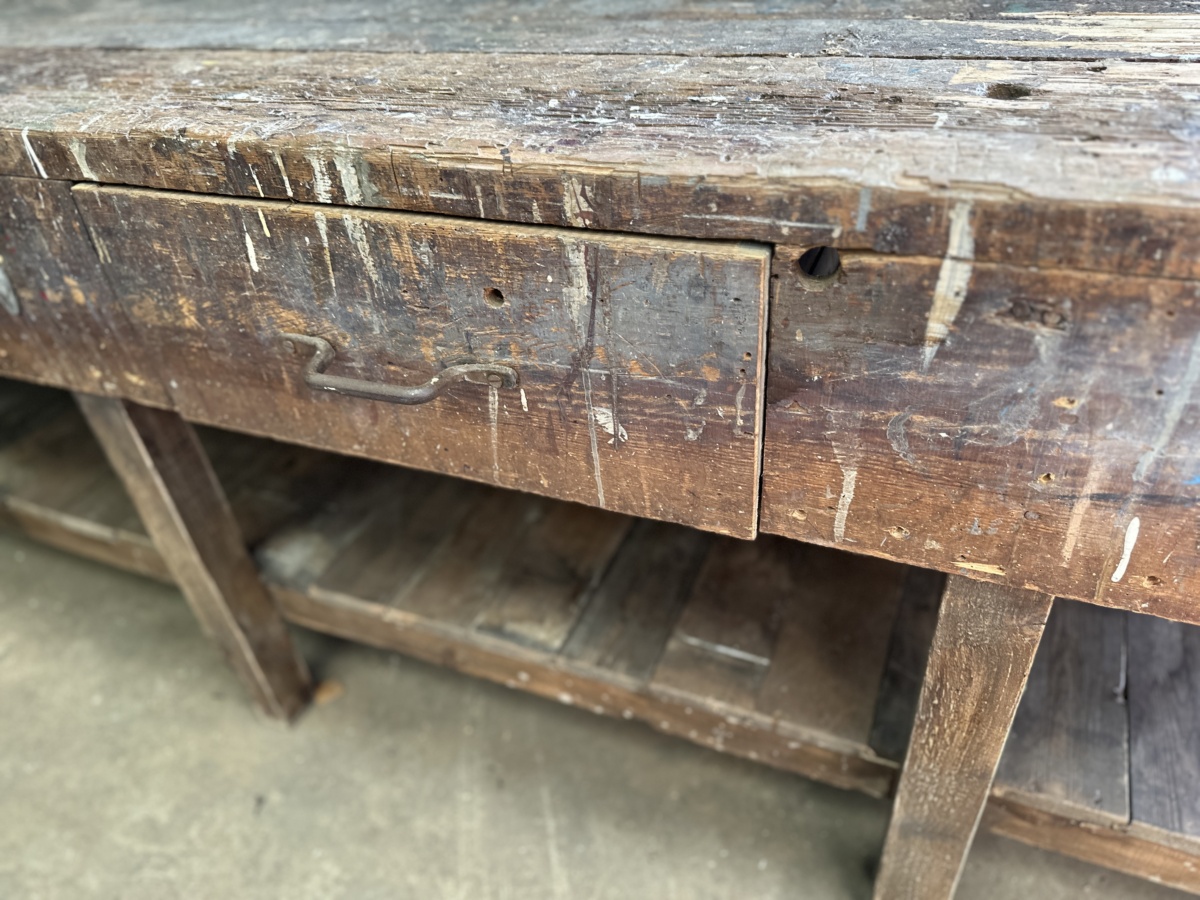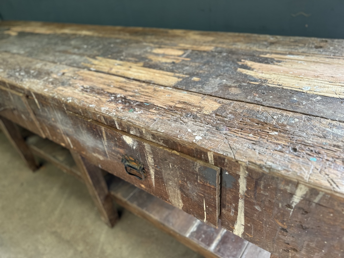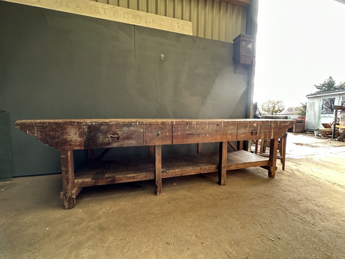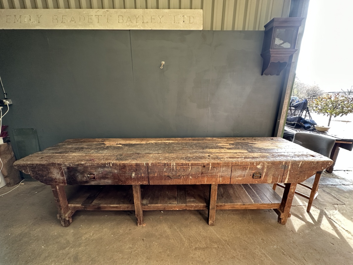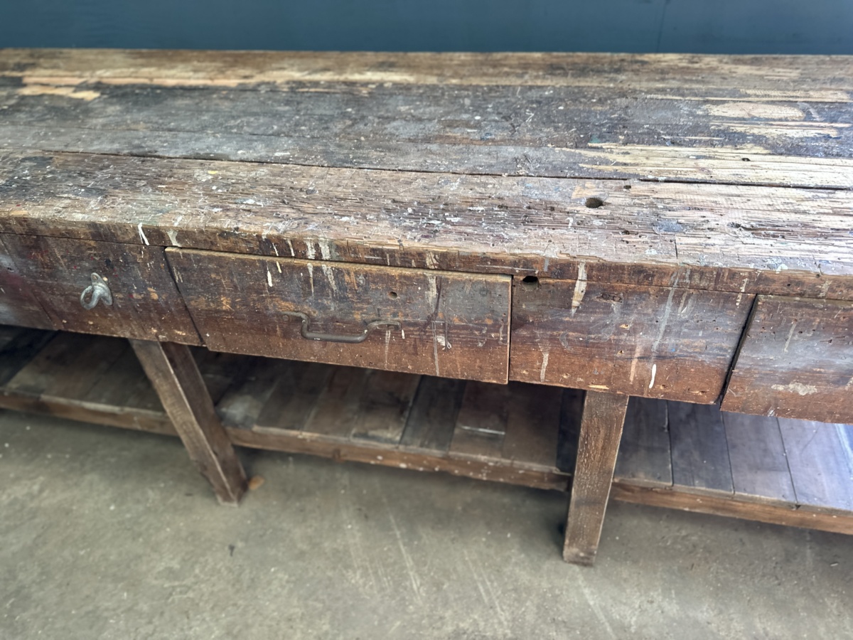 Superb example of a Victorian period Workbench Island, in solid pine. Bearing wonderful signs of craft and workmanship. Thick plank top over row of three deep frieze drawers. Iron handles and hook. Under-shelf section. Excellent colour and patination throughout.