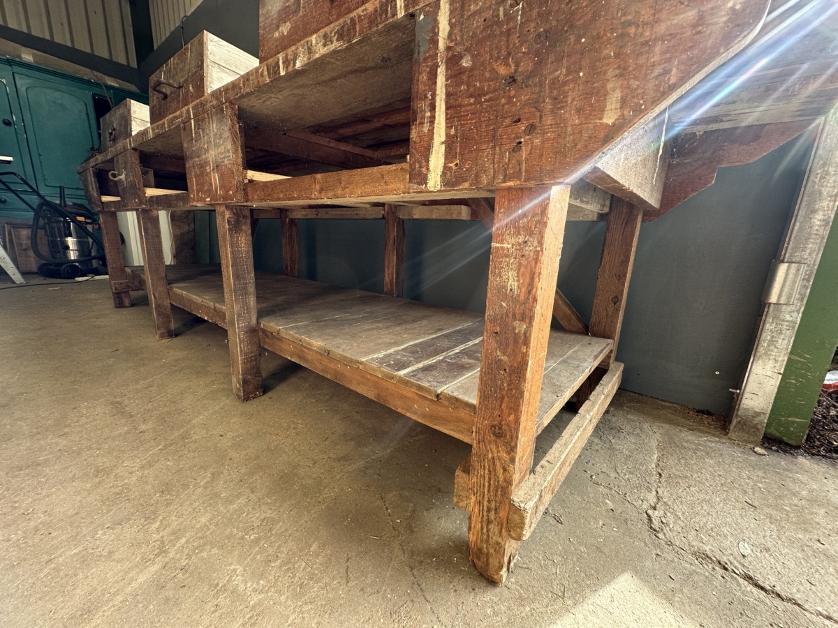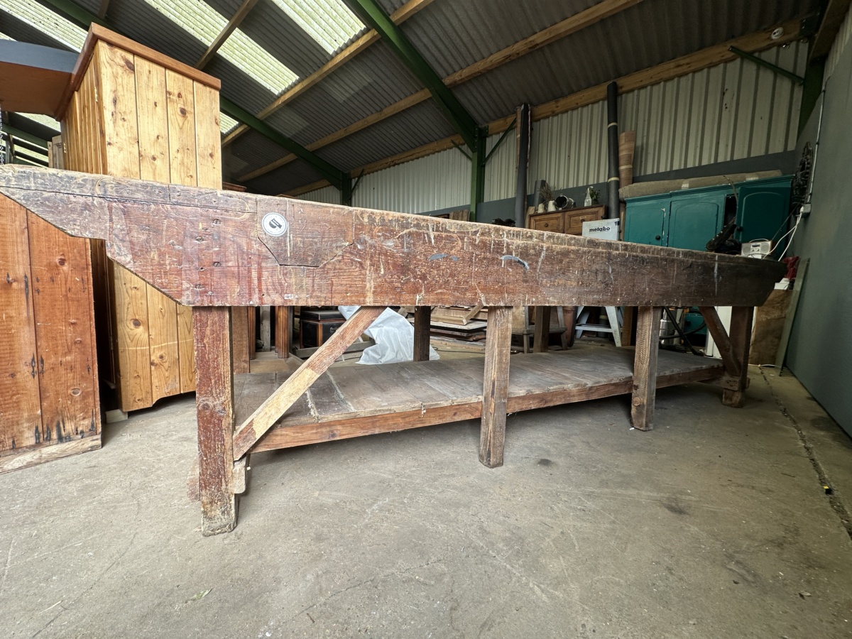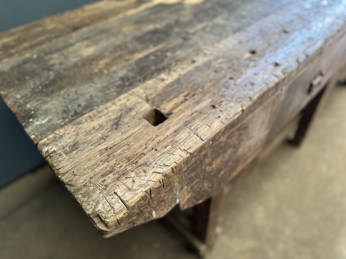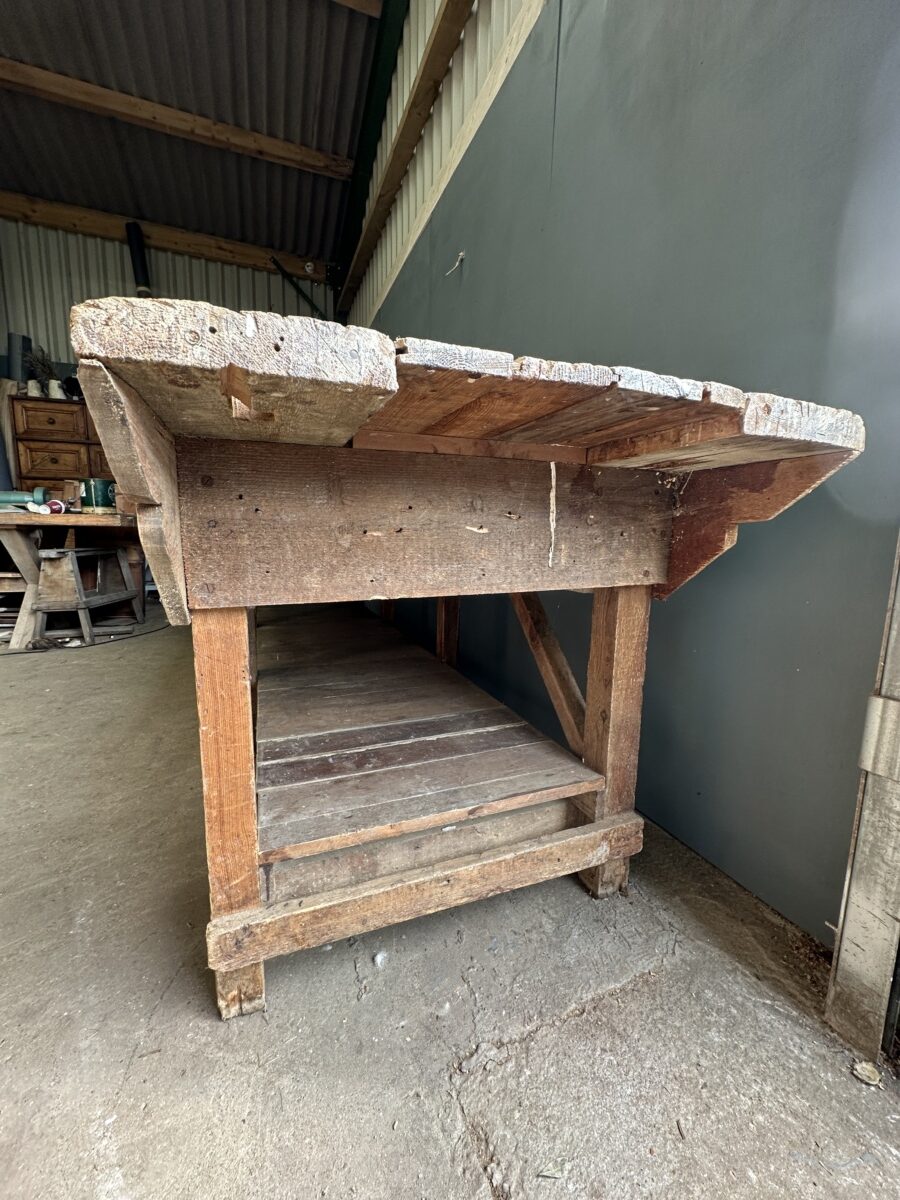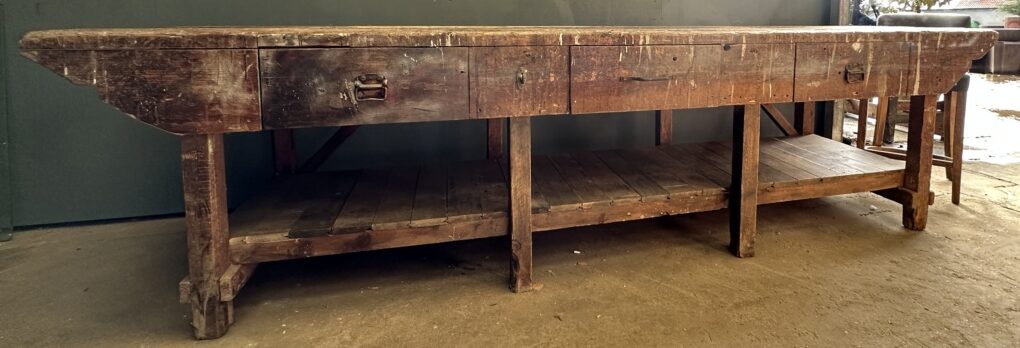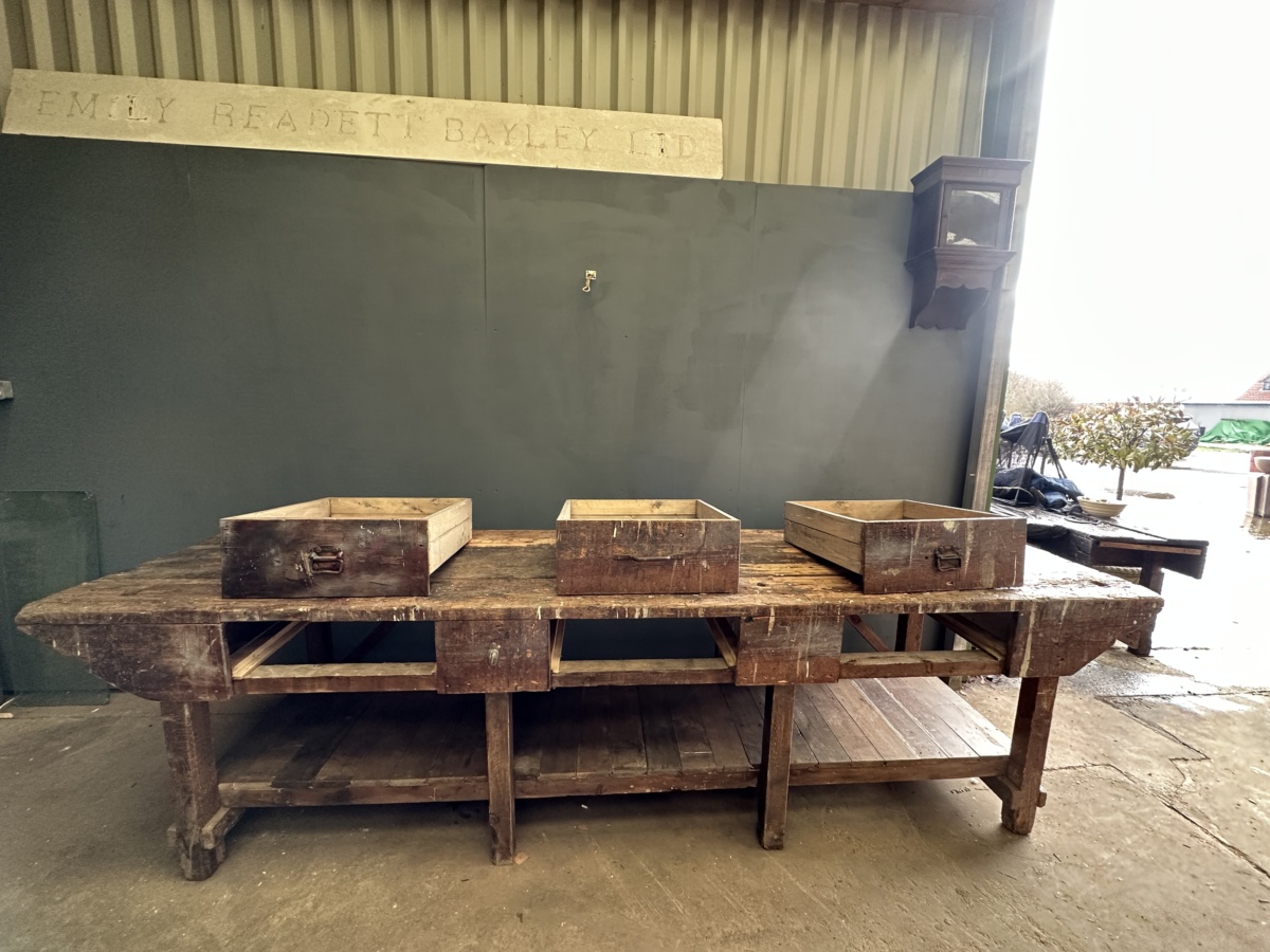 Superb example of a Victorian period Workbench Island, in solid pine. Bearing wonderful signs of craft and workmanship. Thick plank top over row of three deep frieze drawers. Iron handles and hook. Under-shelf section. Excellent colour and patination throughout.
