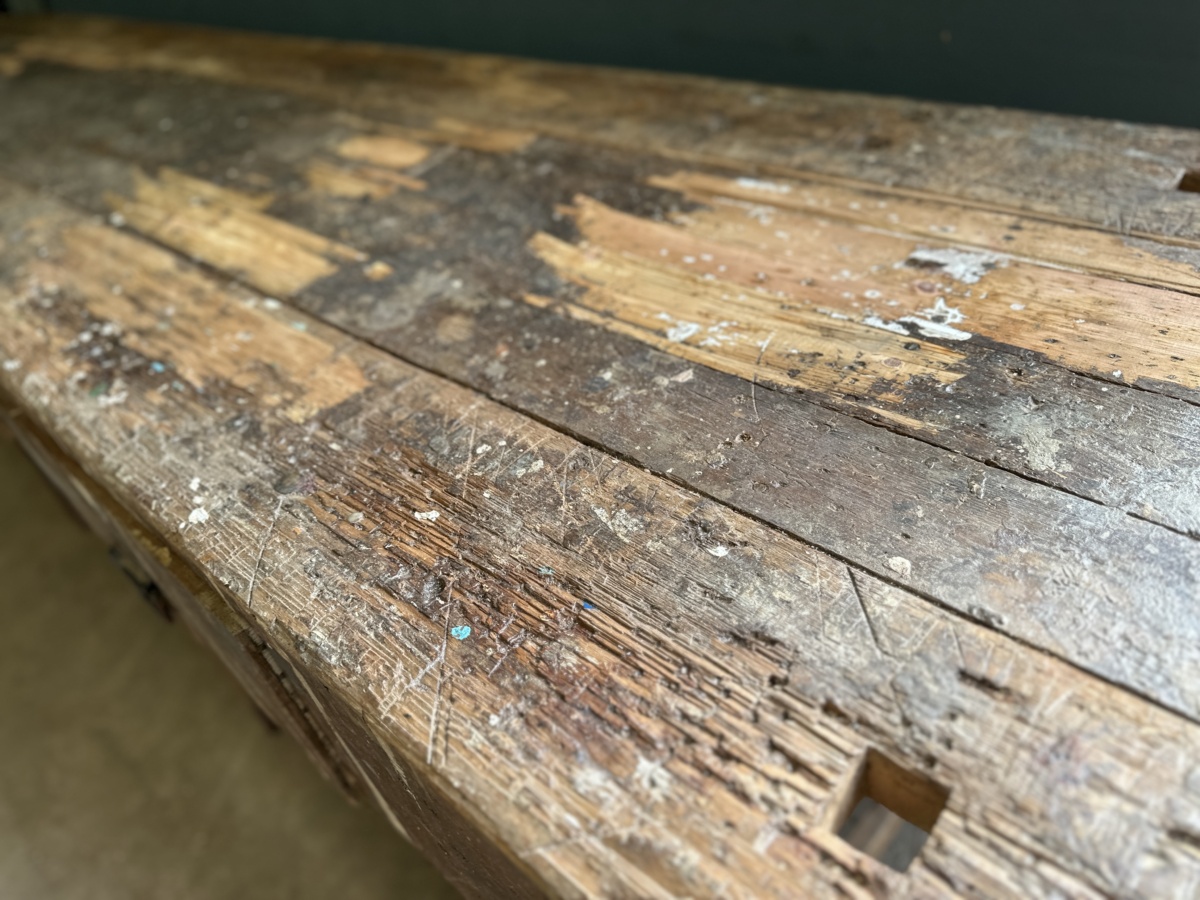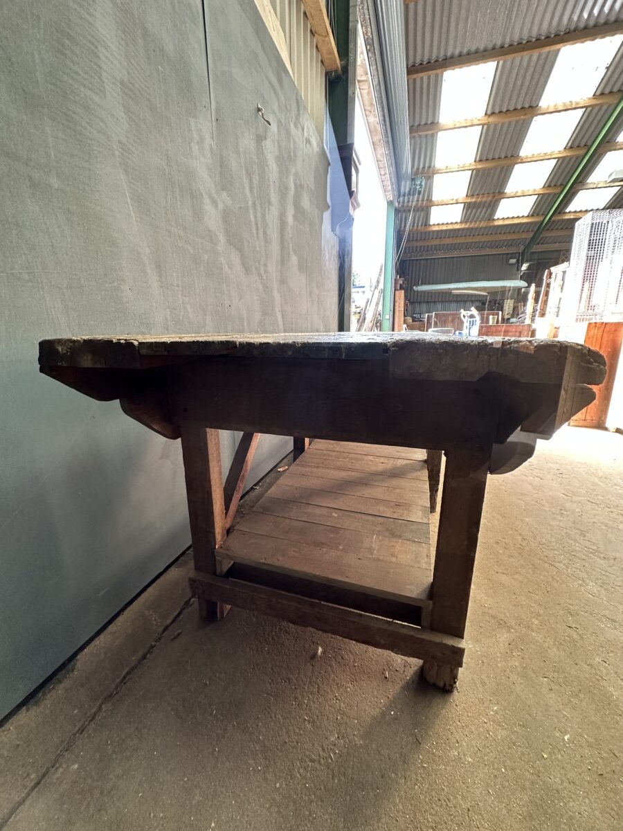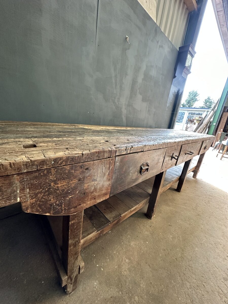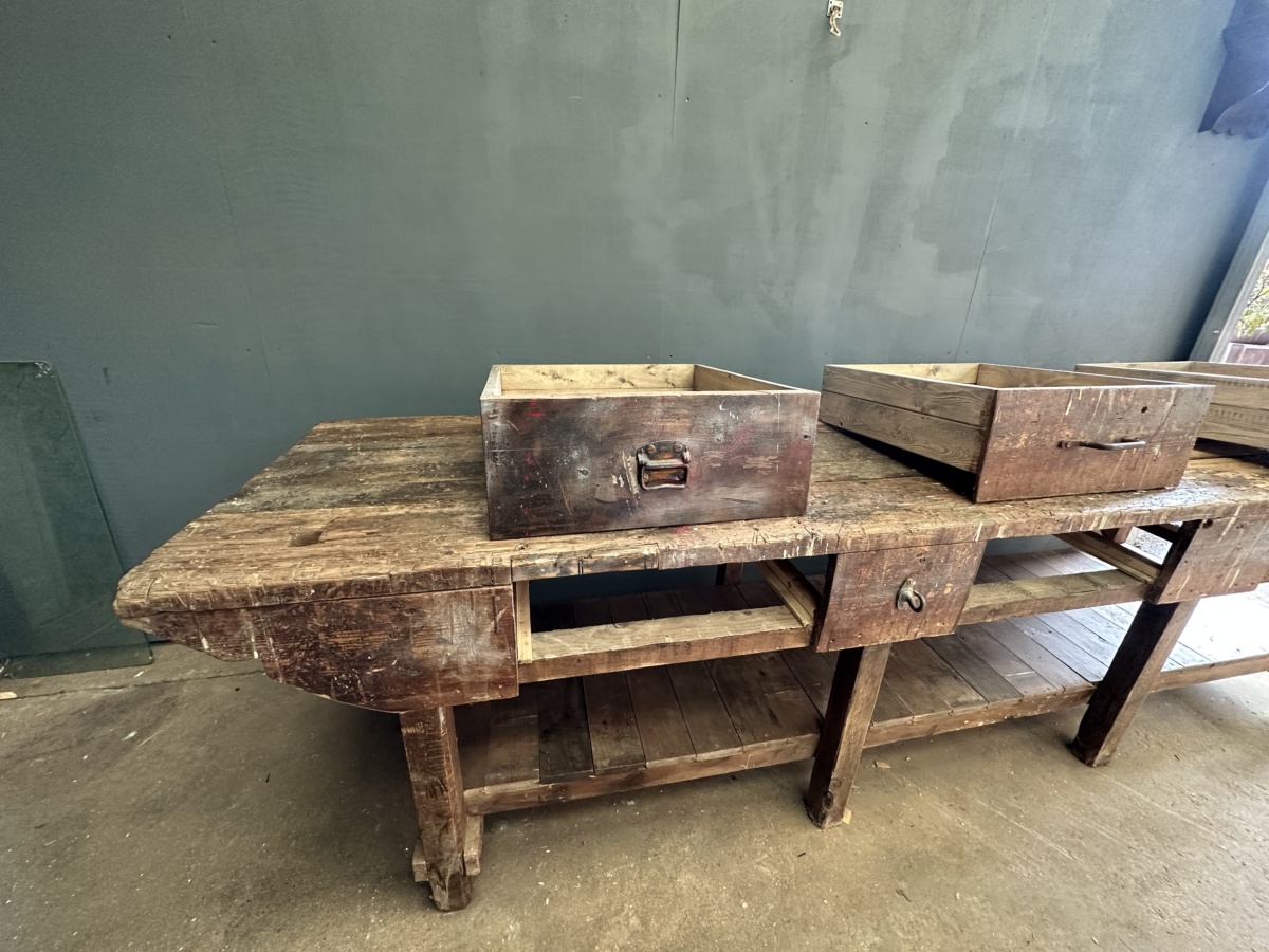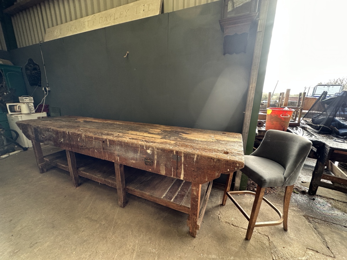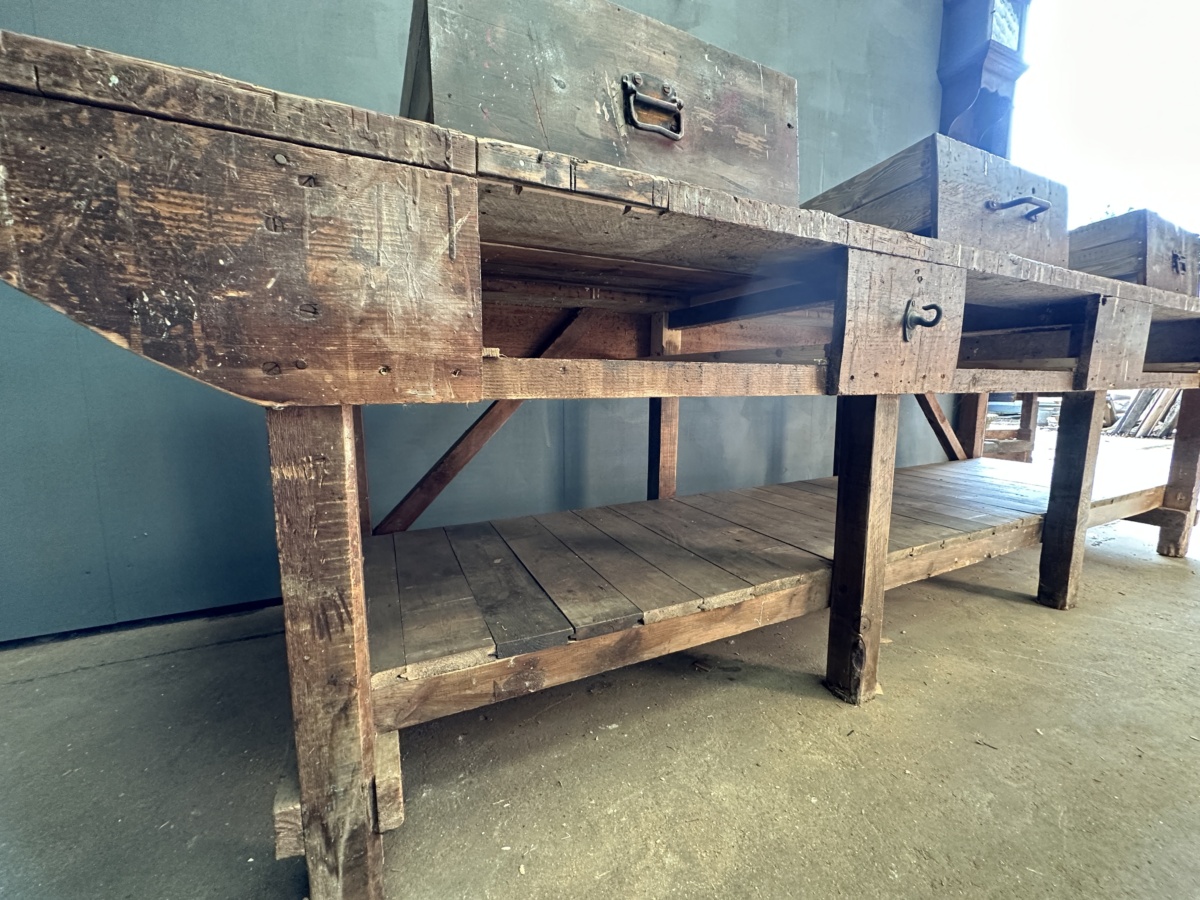 Superb example of a Victorian period Workbench Island, in solid pine. Bearing wonderful signs of craft and workmanship. Thick plank top over row of three deep frieze drawers. Iron handles and hook. Under-shelf section. Excellent colour and patination throughout.