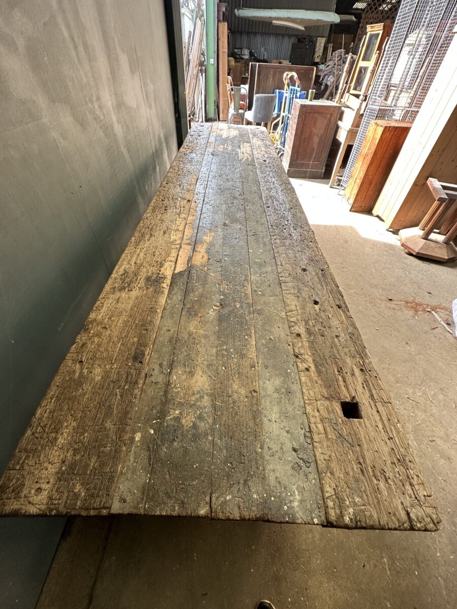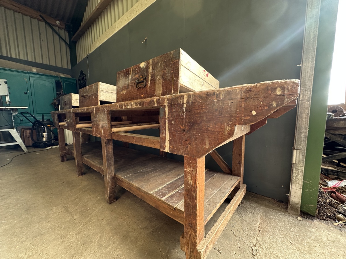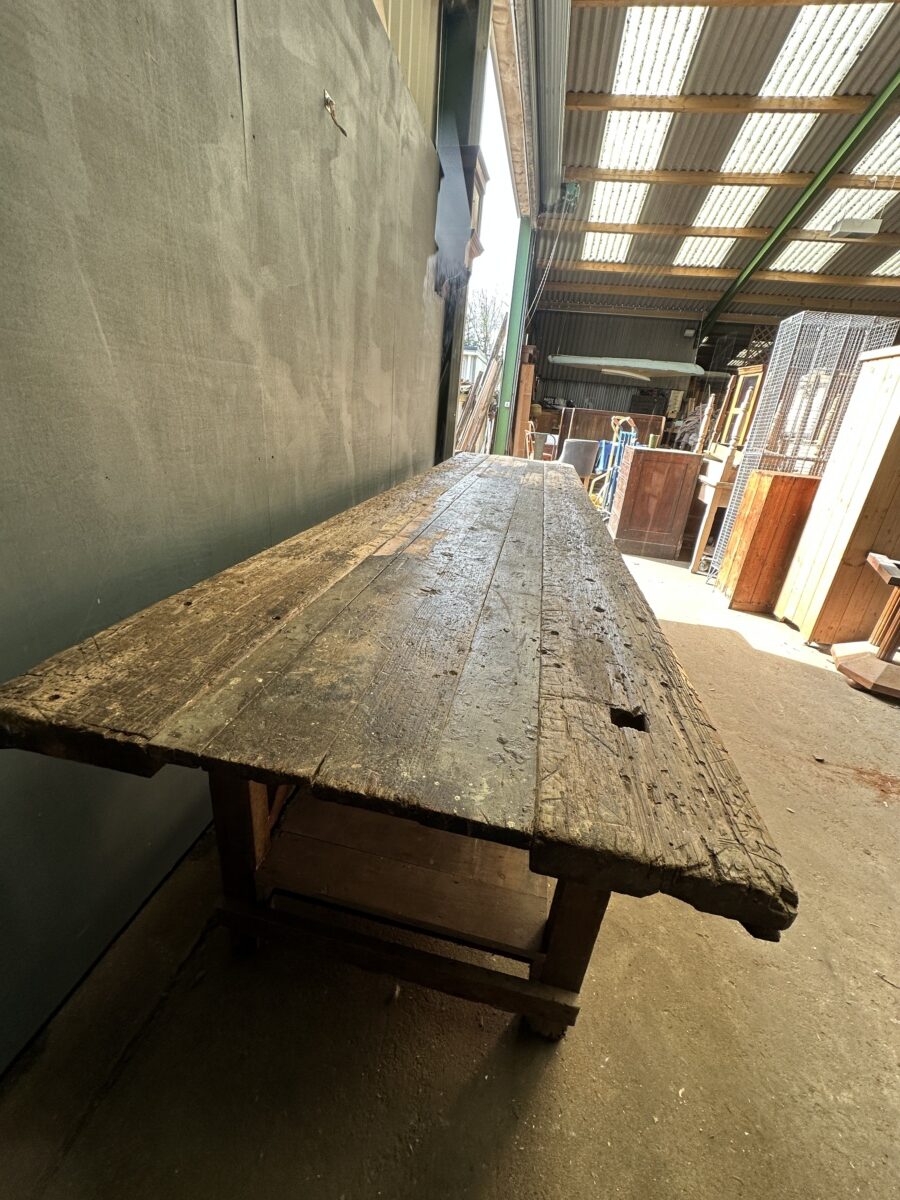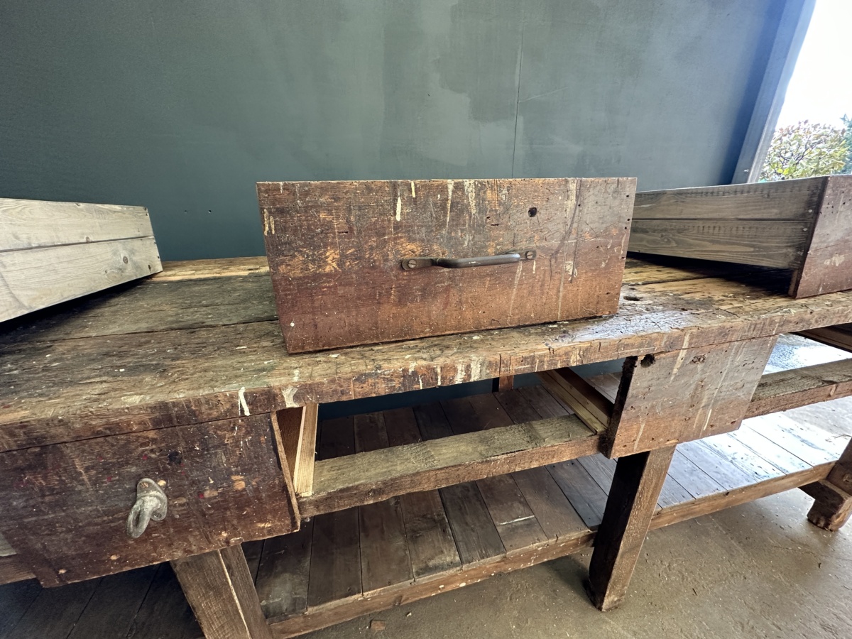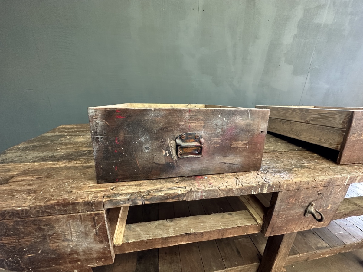 Superb example of a Victorian period Workbench Island, in solid pine. Bearing wonderful signs of craft and workmanship. Thick plank top over row of three deep frieze drawers. Iron handles and hook. Under-shelf section. Excellent colour and patination throughout.