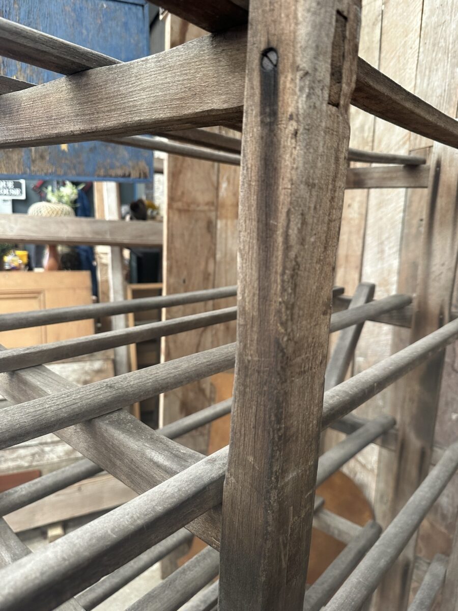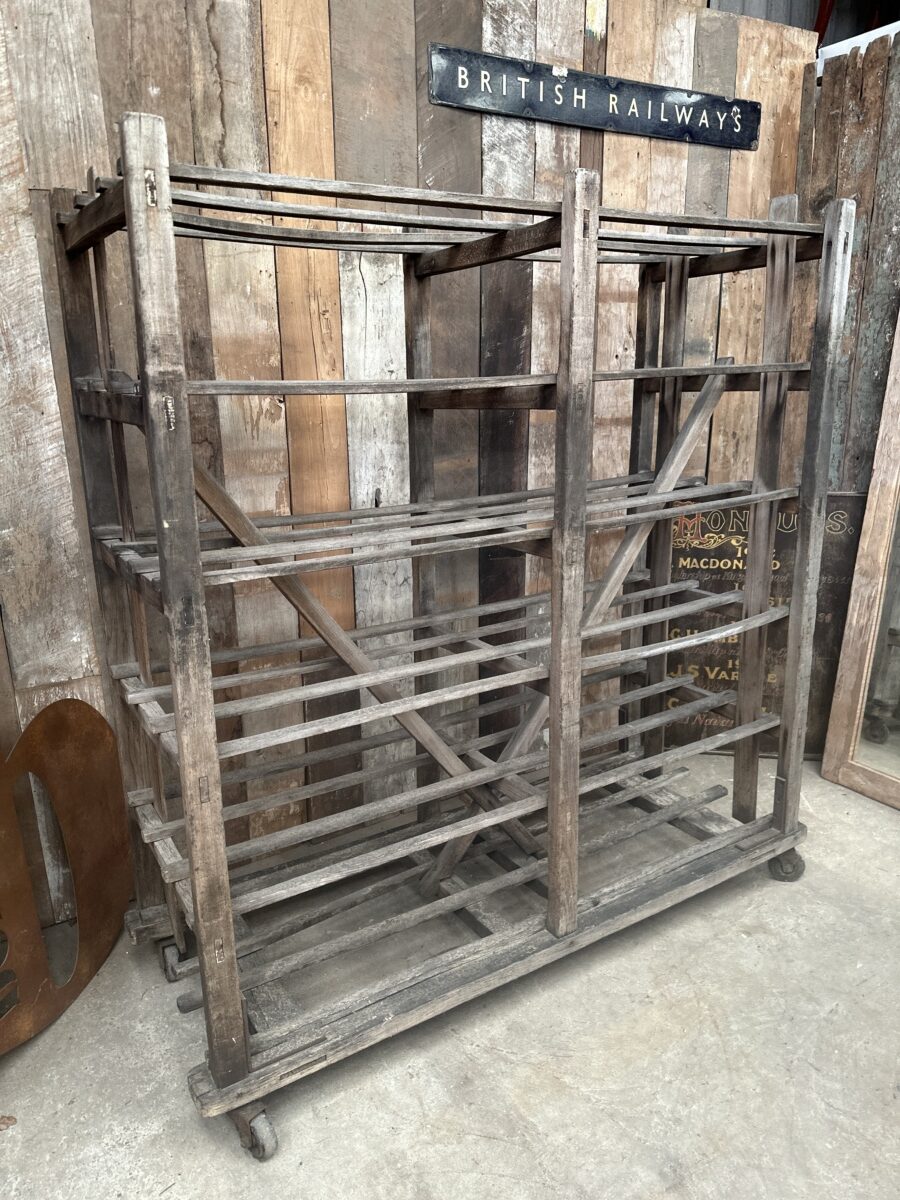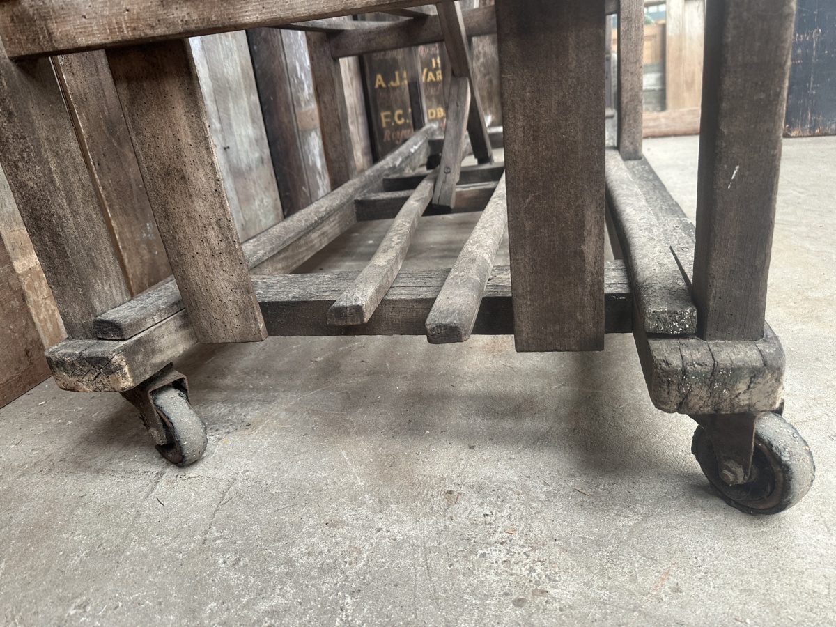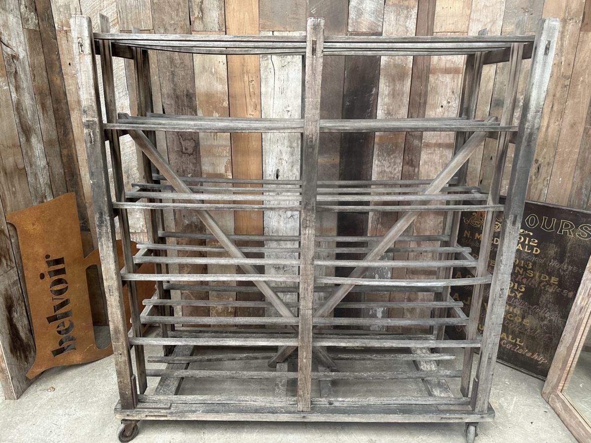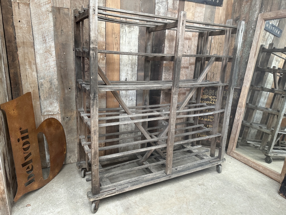 Antique French Large Pine Baker’s Rack, dating from the early 1900s. Six spaced shelves, iron brackets, rubber wheels, great solid condition. Ideal as a retail installation or in large country kitchen space/partition. All intact.