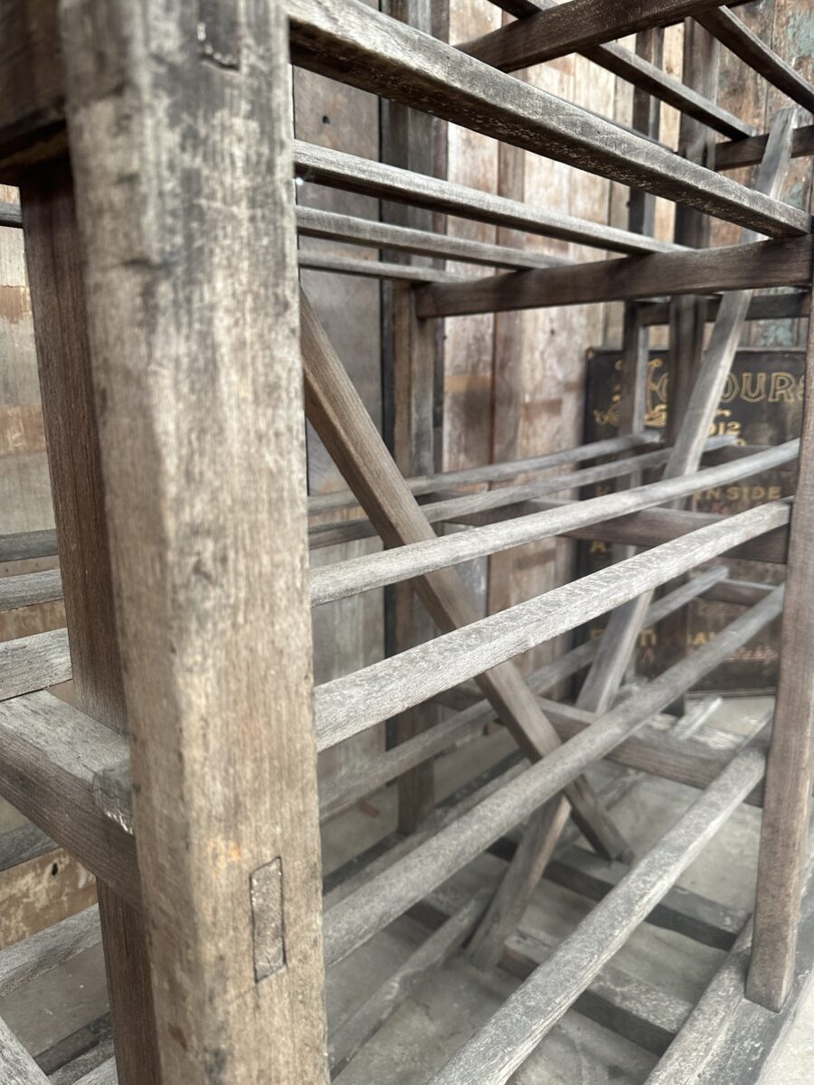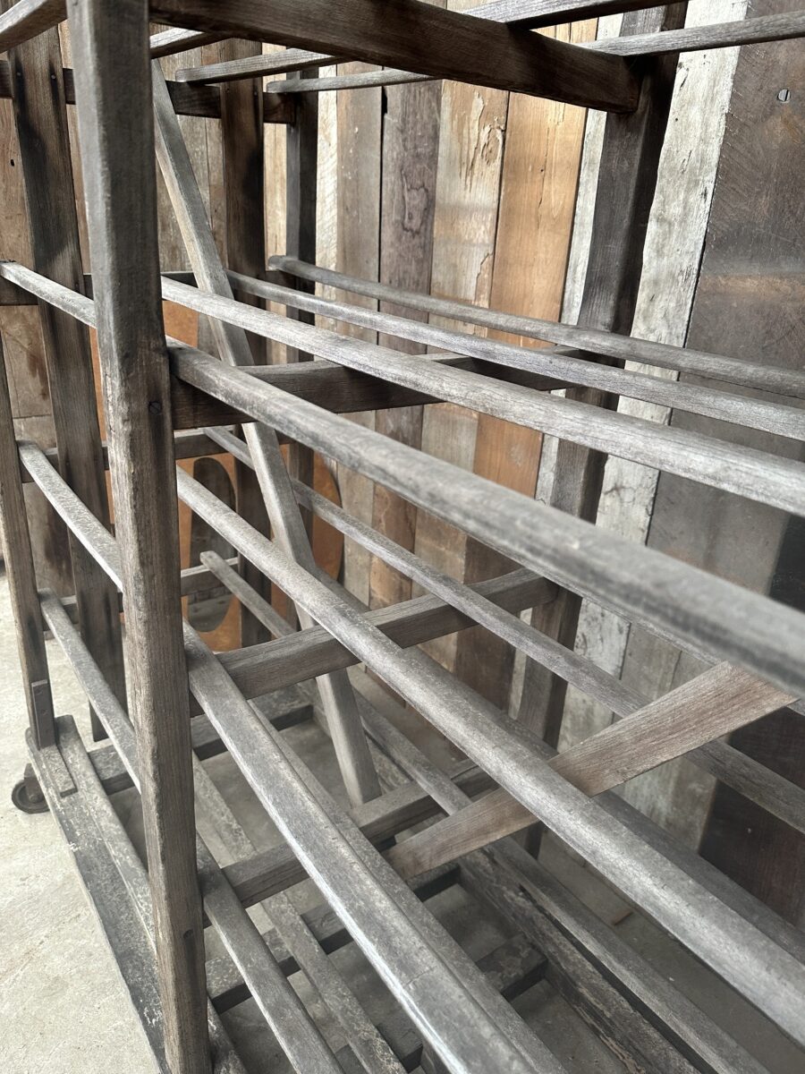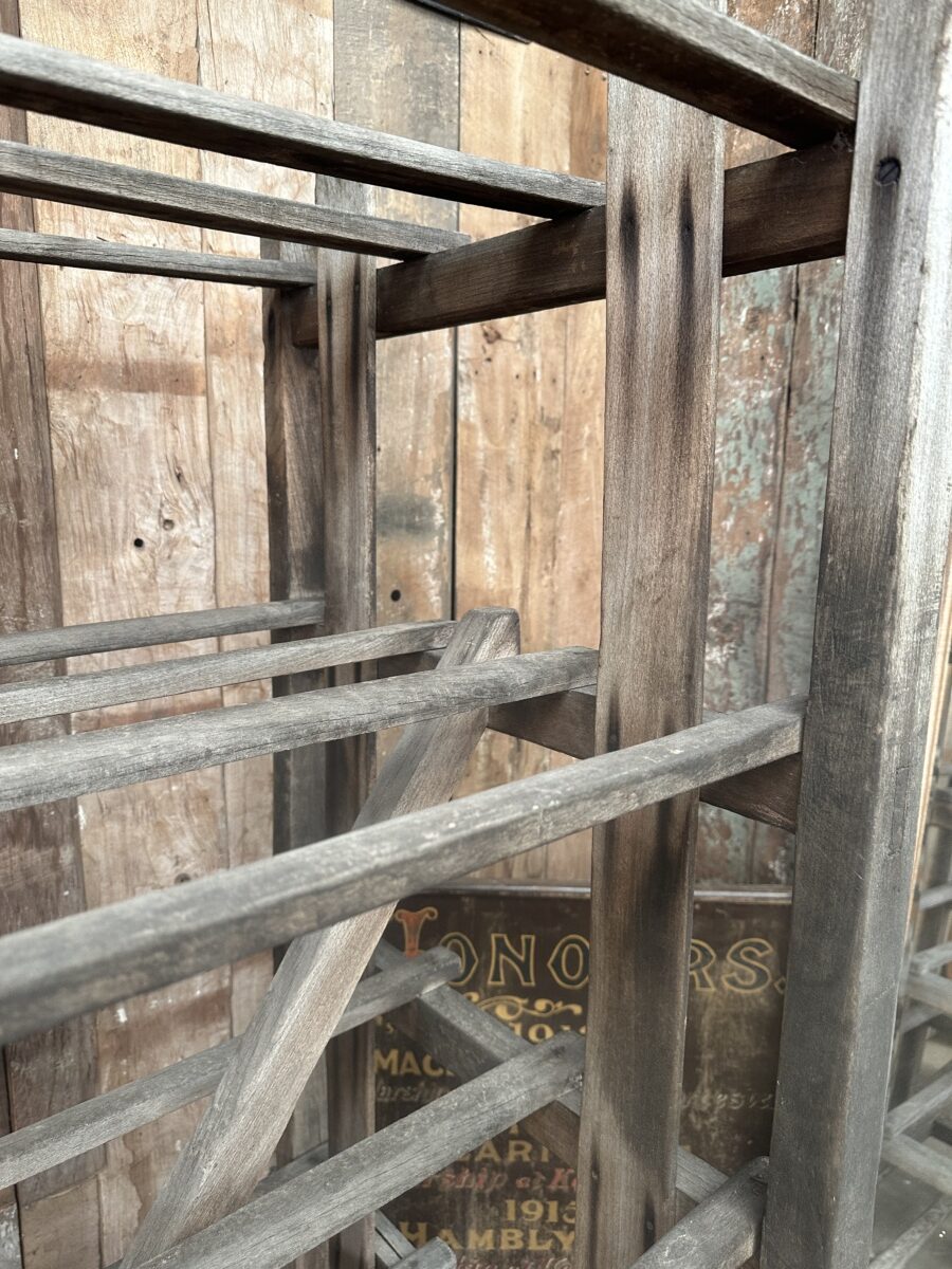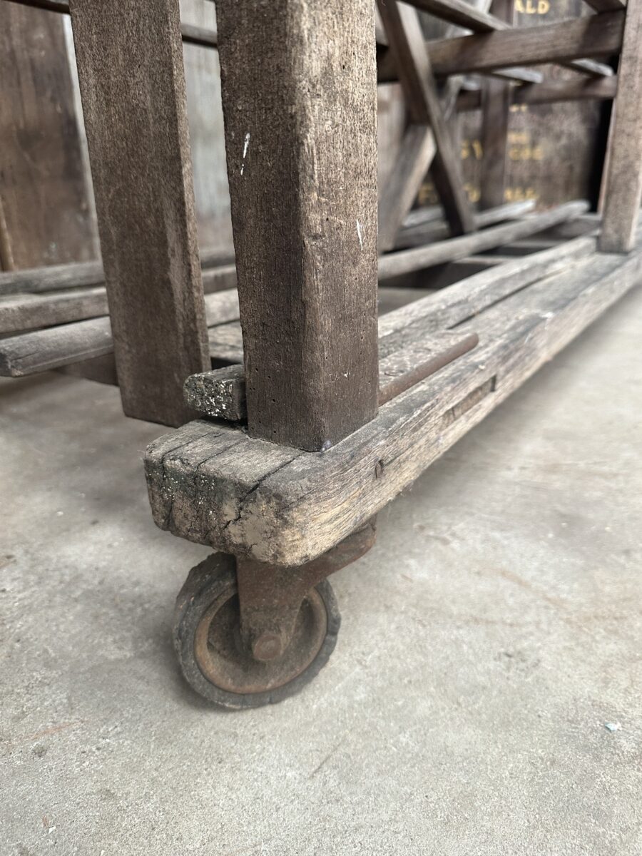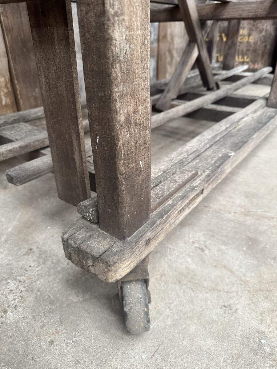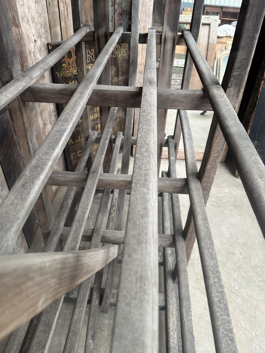 Antique French Large Pine Baker’s Rack, dating from the early 1900s. Six spaced shelves, iron brackets, rubber wheels, great solid condition. Ideal as a retail installation or in large country kitchen space/partition. All intact.