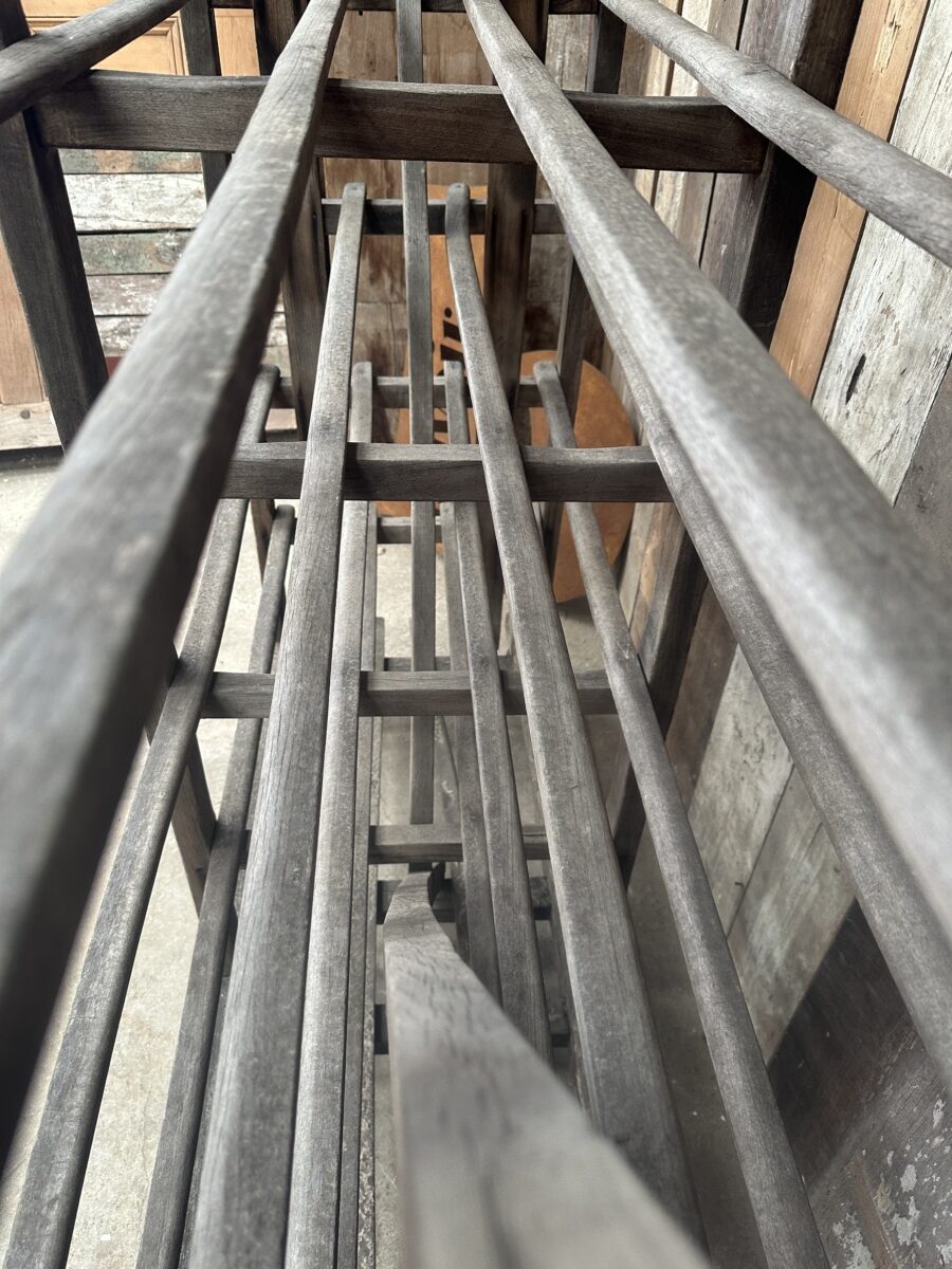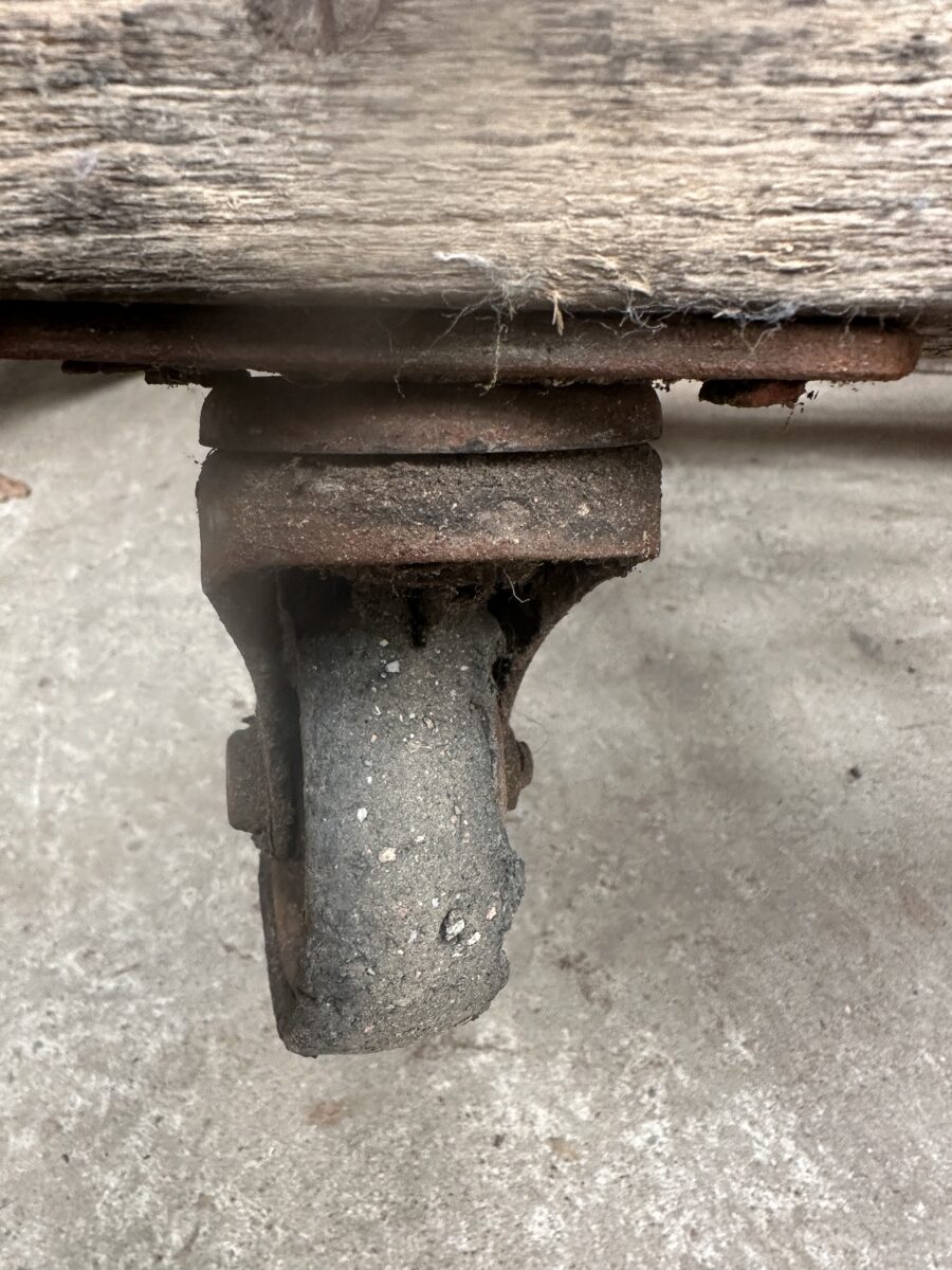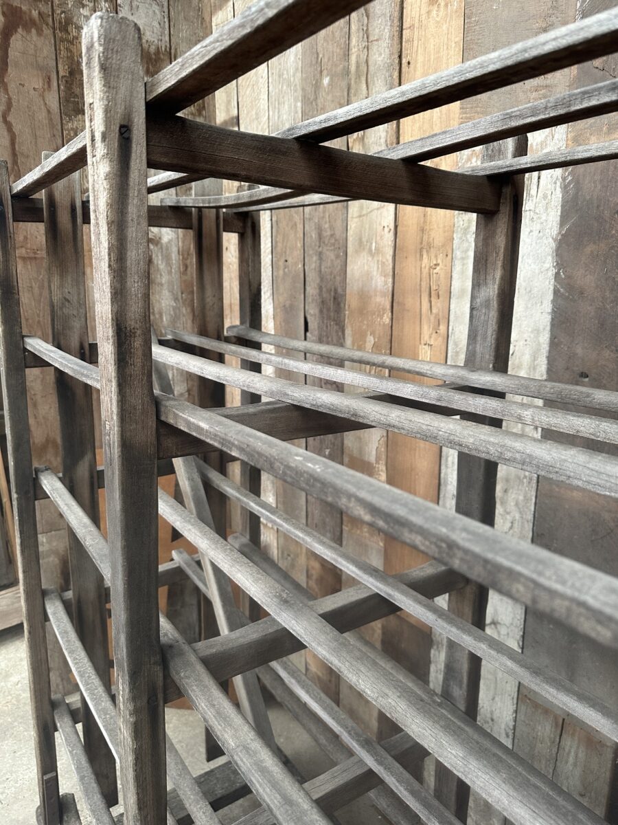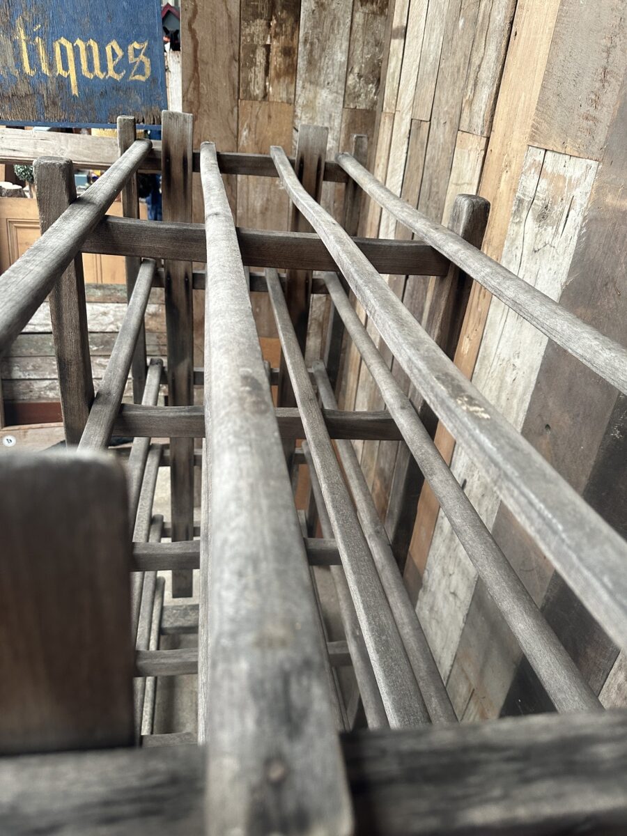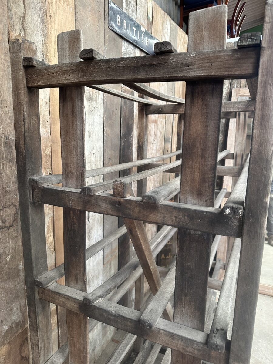 Antique French Large Pine Baker’s Rack, dating from the early 1900s. Six spaced shelves, iron brackets, rubber wheels, great solid condition. Ideal as a retail installation or in large country kitchen space/partition. All intact.