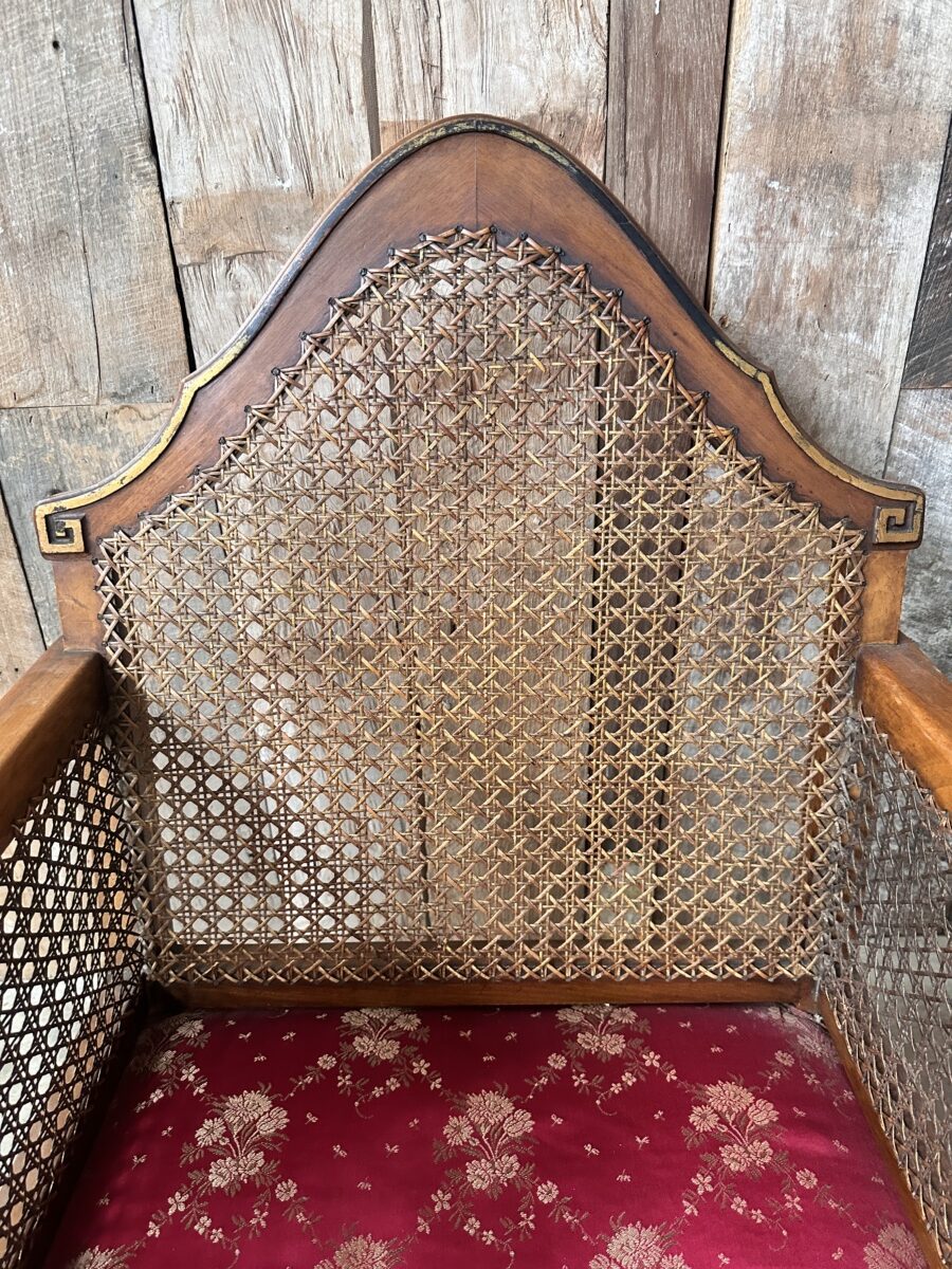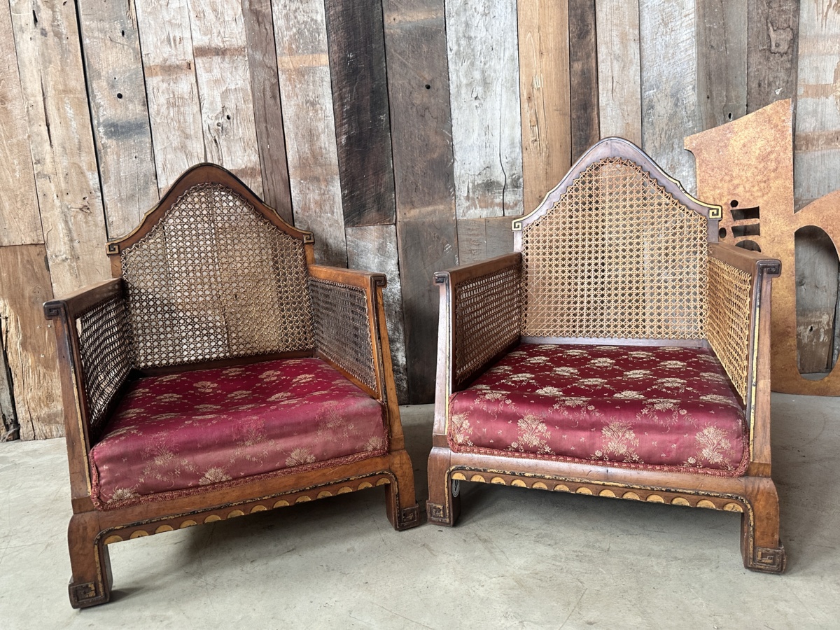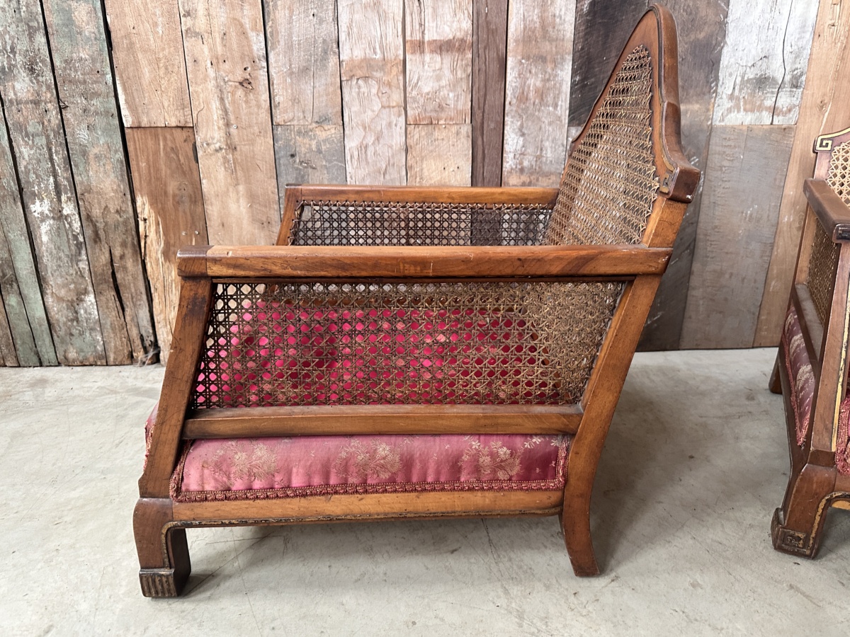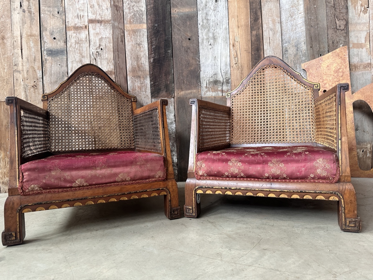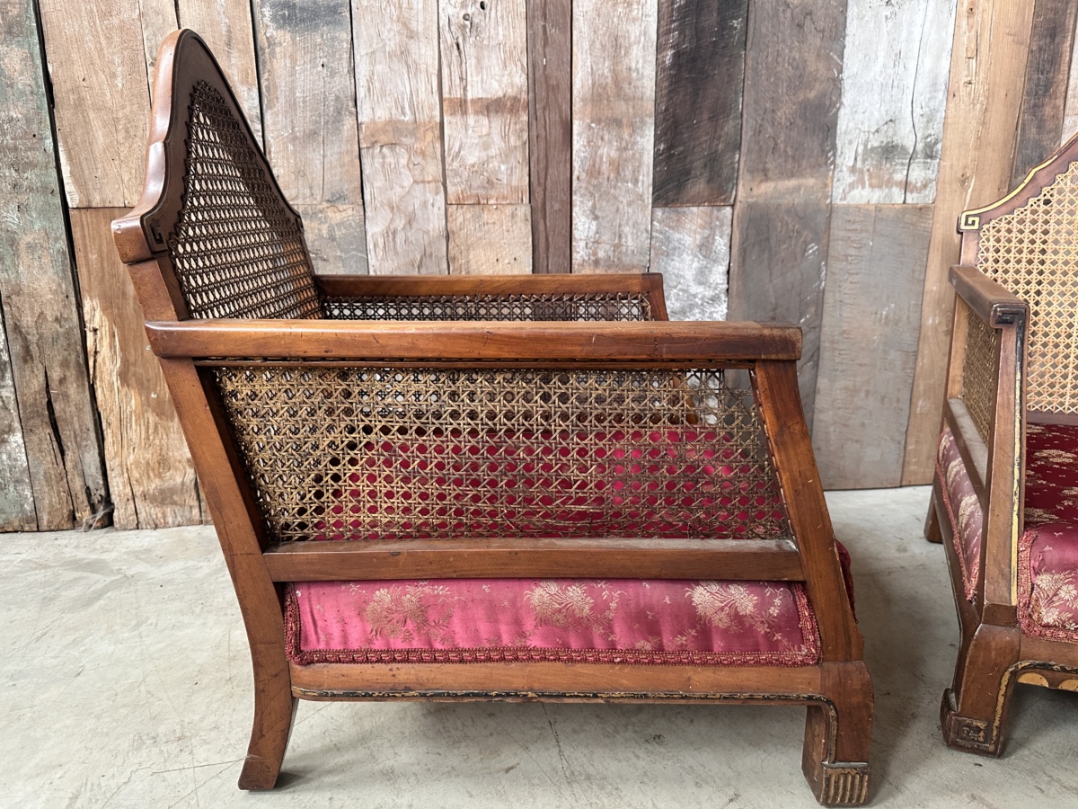An excellent original matching pair of Anglo Indian Colonial armchairs, dating from the early 19th century. Exquisite original gilt painted greek tooth decoration. Bergere cane in good order all round. Silk floral red upholstery. Lovely examples of Anglo Indian colonial furniture.