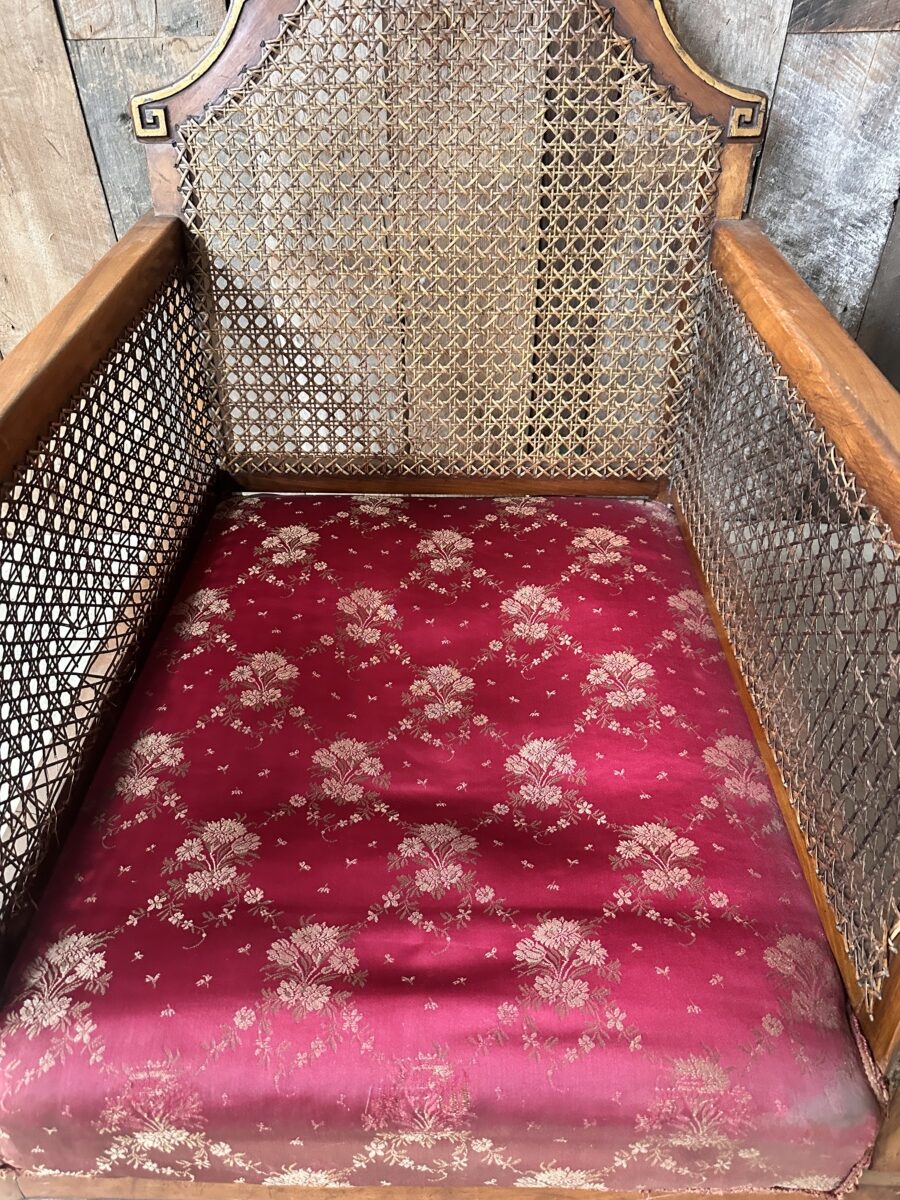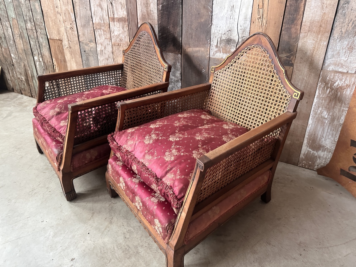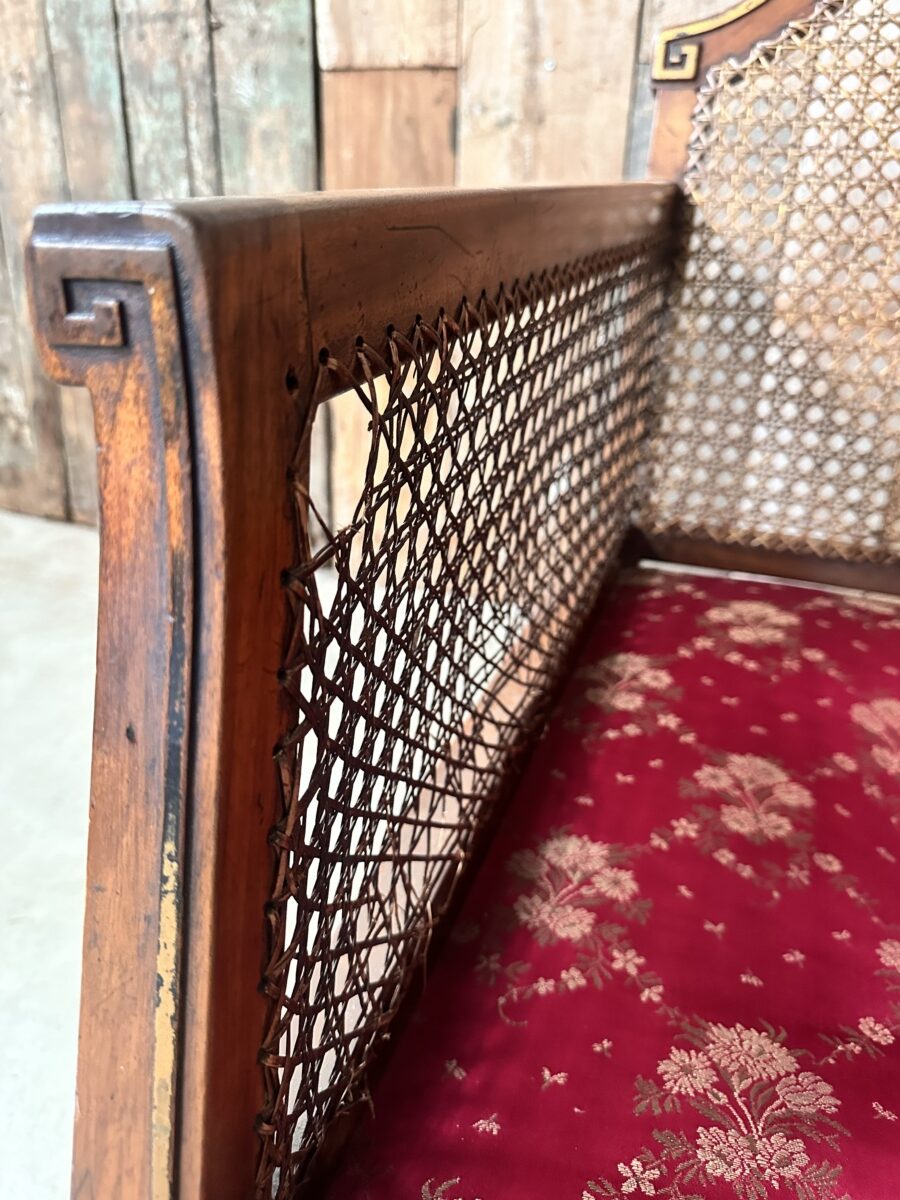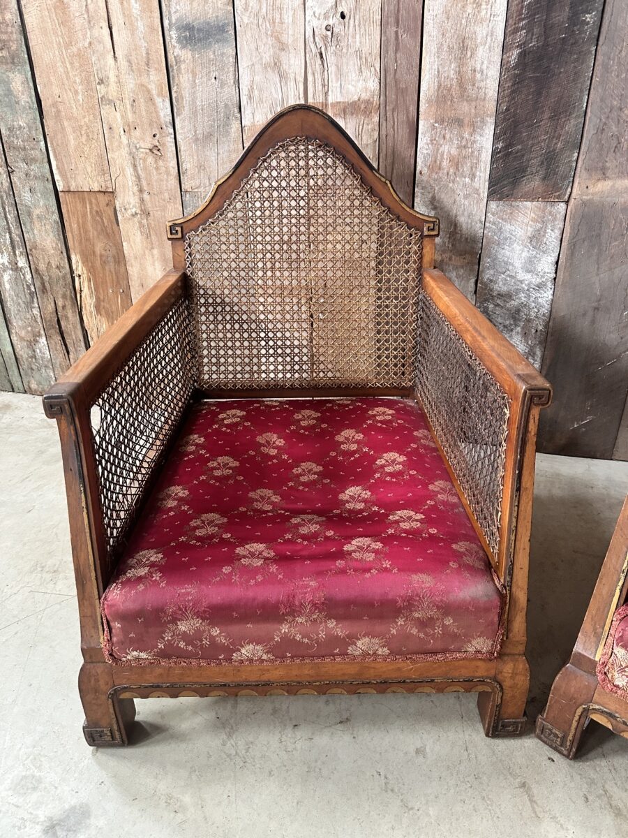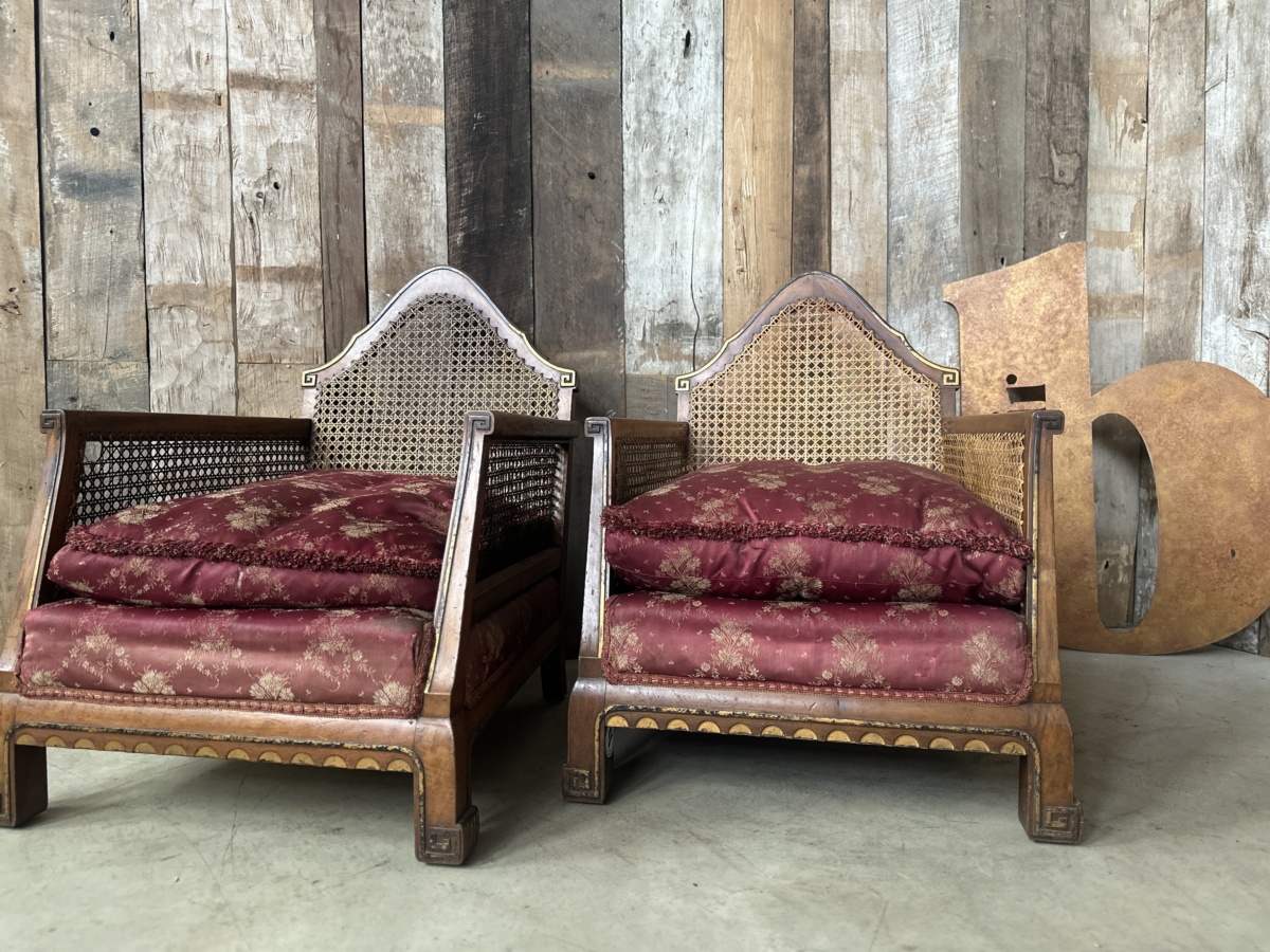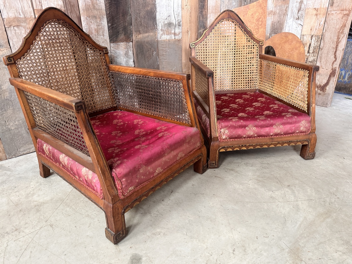An excellent original matching pair of Anglo Indian Colonial armchairs, dating from the early 19th century. Exquisite original gilt painted greek tooth decoration. Bergere cane in good order all round. Silk floral red upholstery. Lovely examples of Anglo Indian colonial furniture.