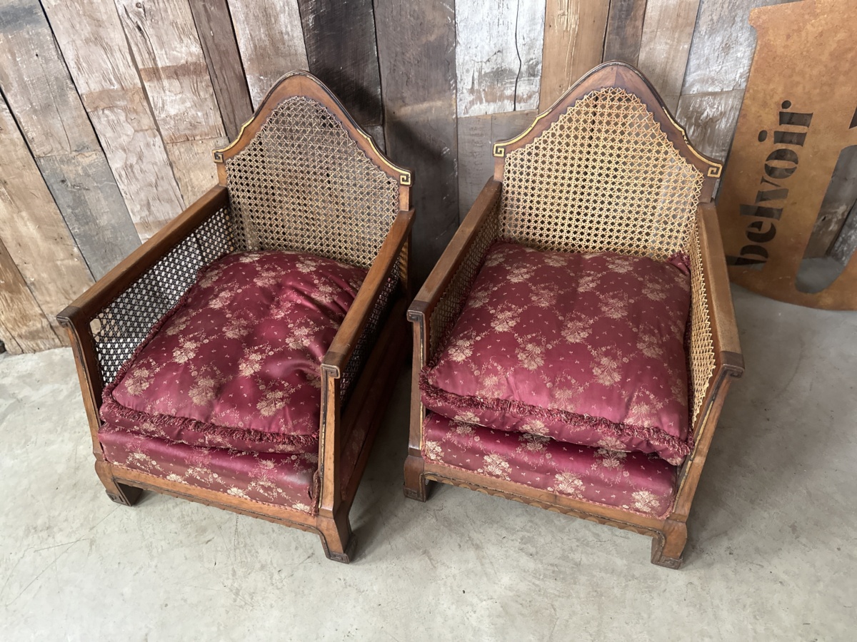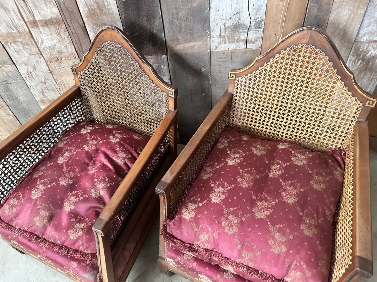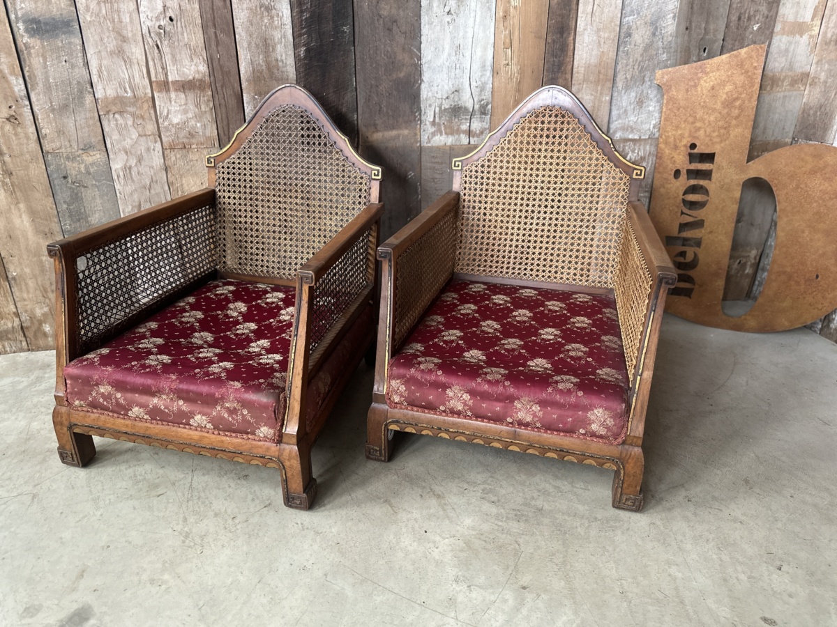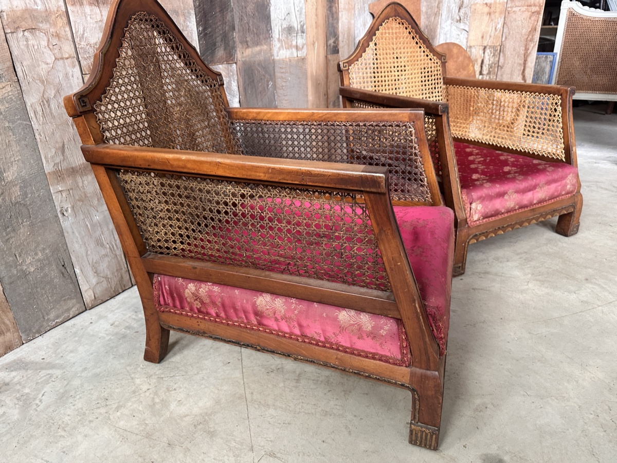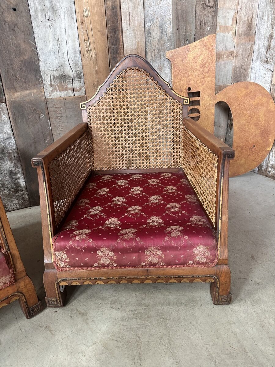 An excellent original matching pair of Anglo Indian Colonial armchairs, dating from the early 19th century. Exquisite original gilt painted greek tooth decoration. Bergere cane in good order all round. Silk floral red upholstery. Lovely examples of Anglo Indian colonial furniture.