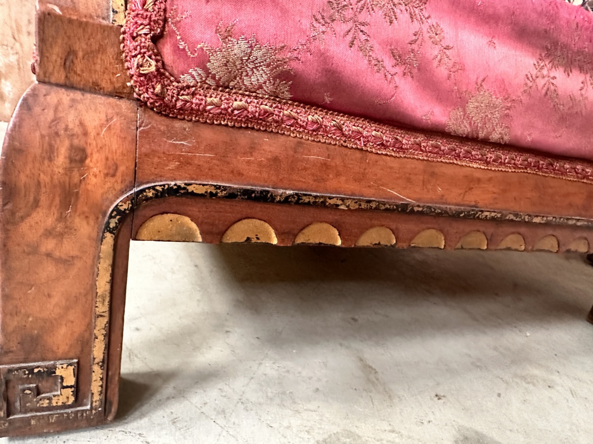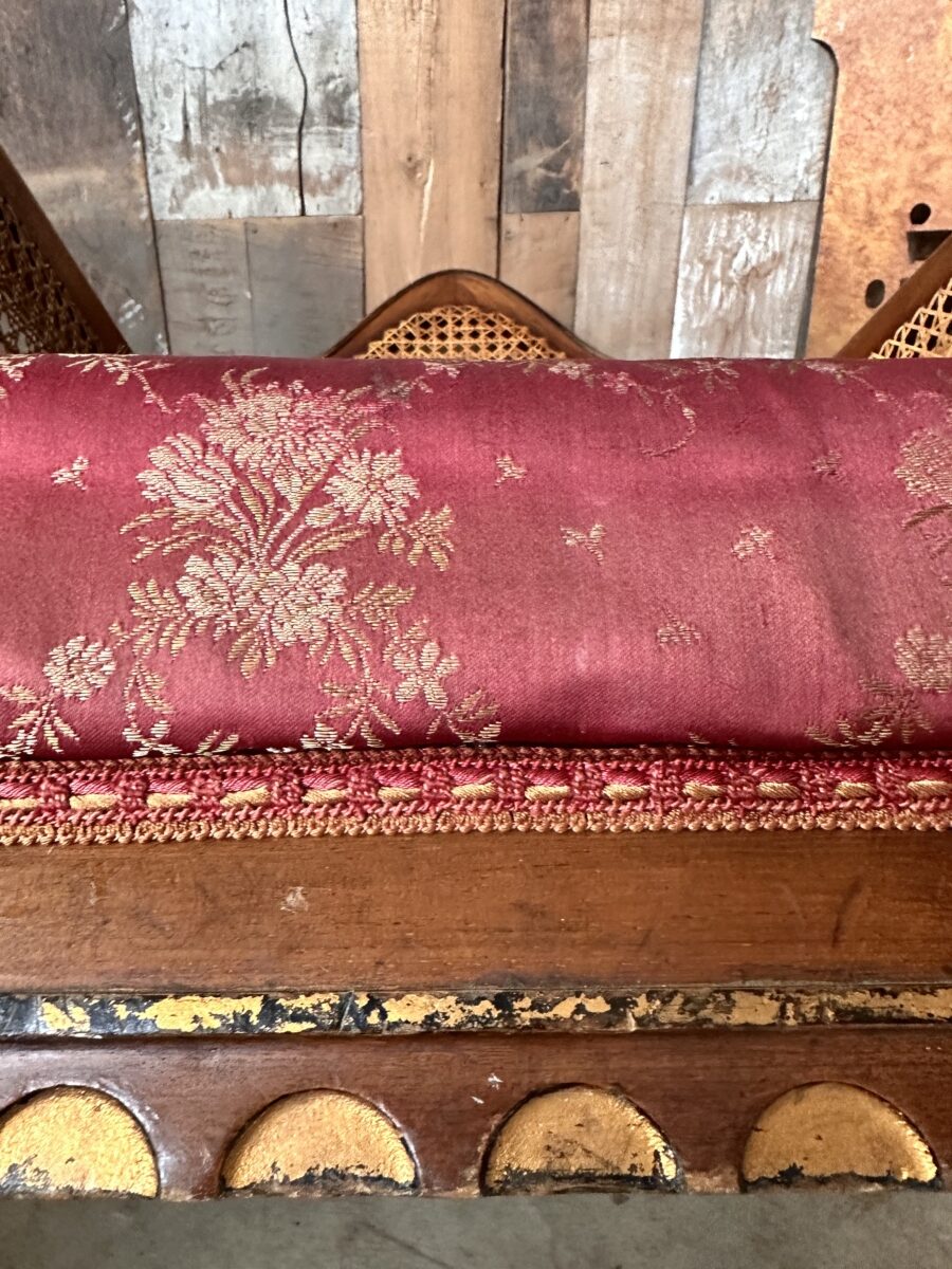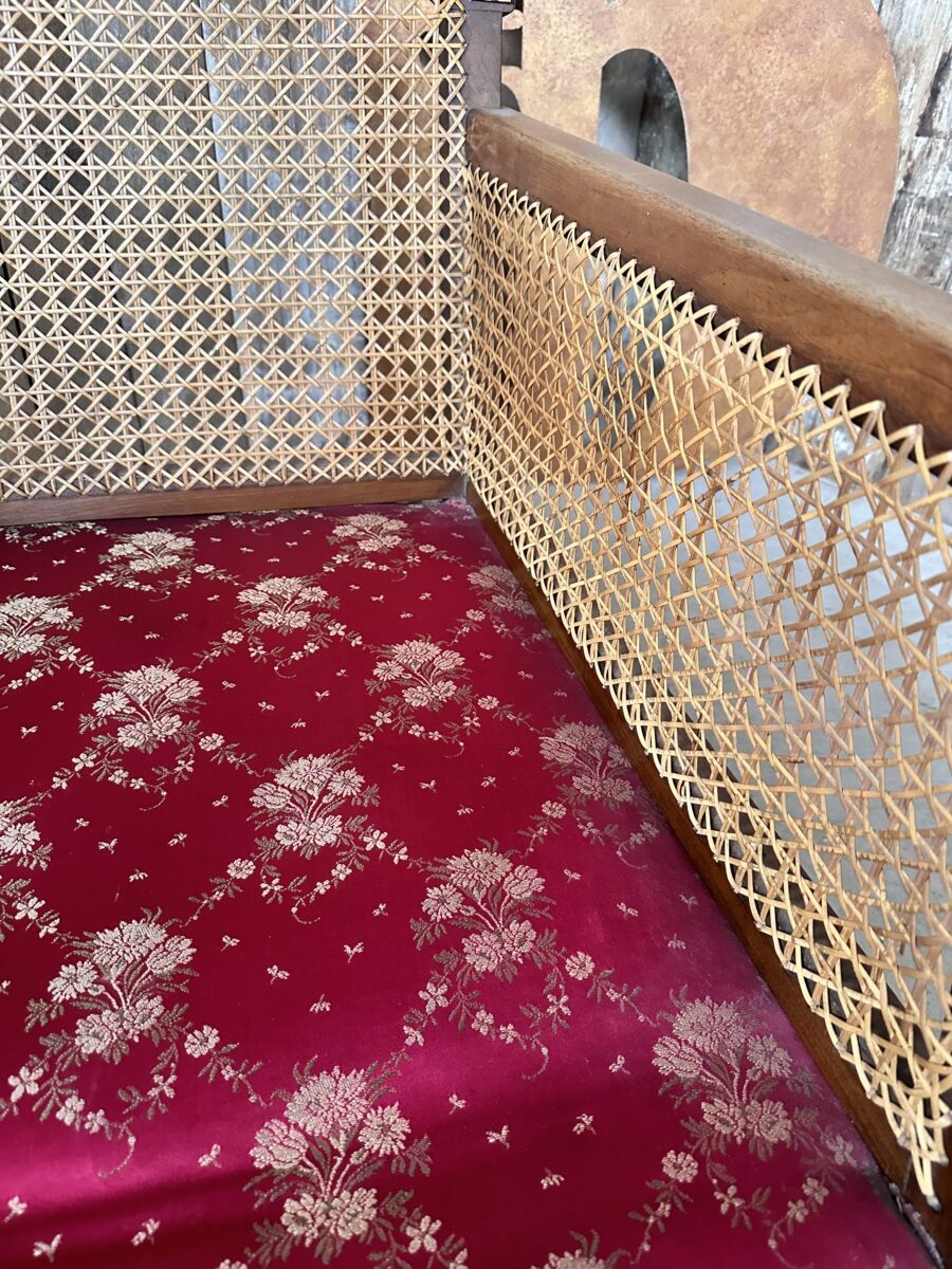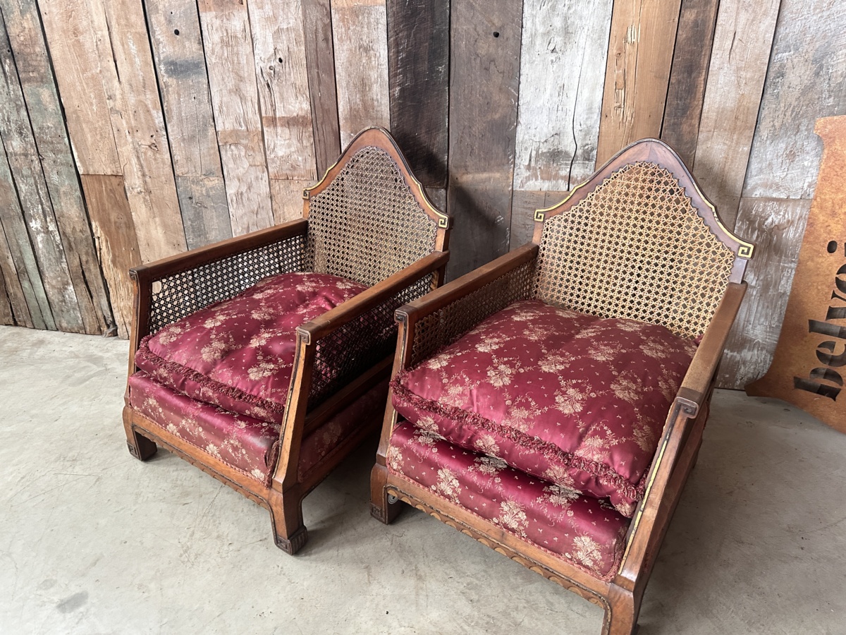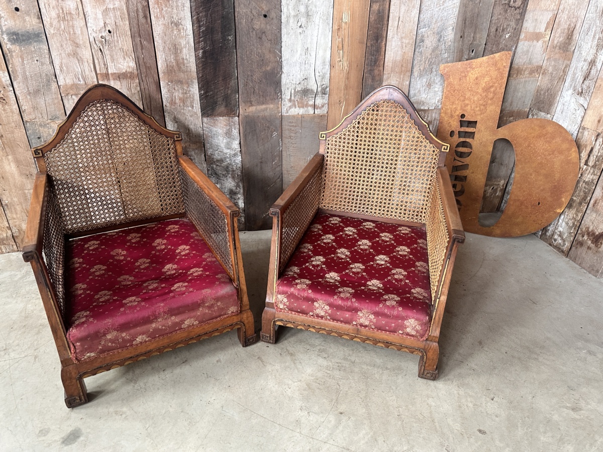 An excellent original matching pair of Anglo Indian Colonial armchairs, dating from the early 19th century. Exquisite original gilt painted greek tooth decoration. Bergere cane in good order all round. Silk floral red upholstery. Lovely examples of Anglo Indian colonial furniture.