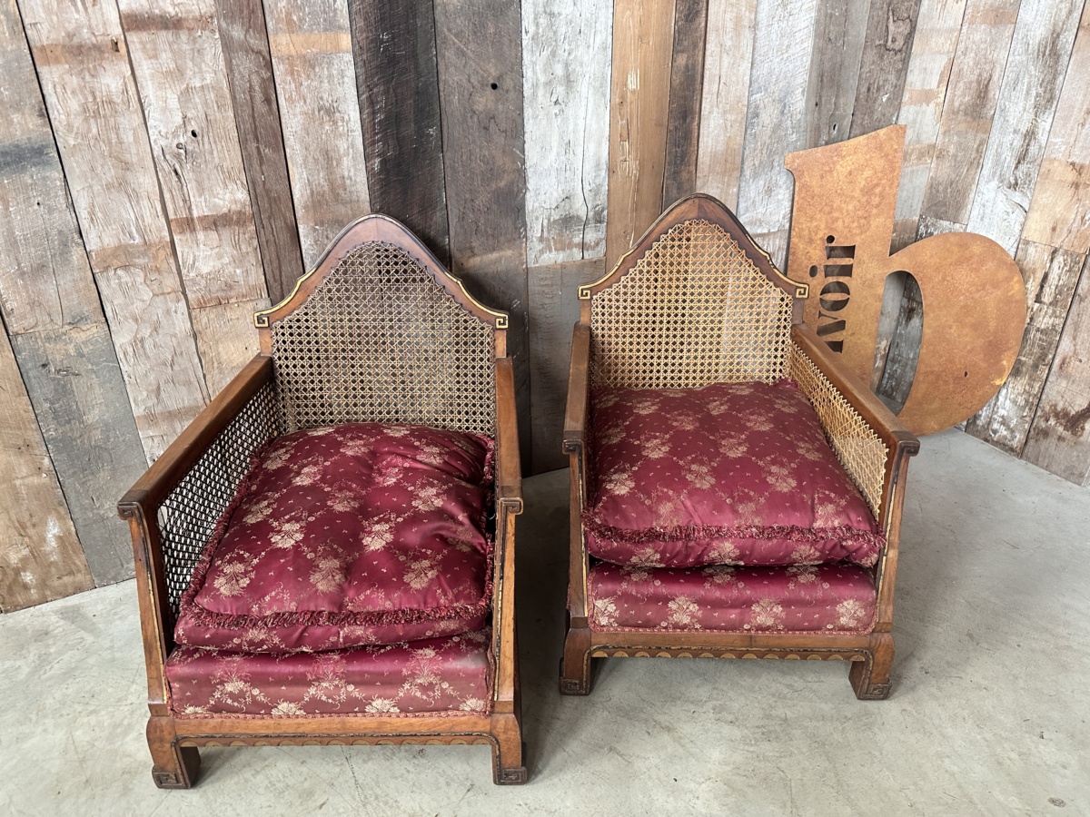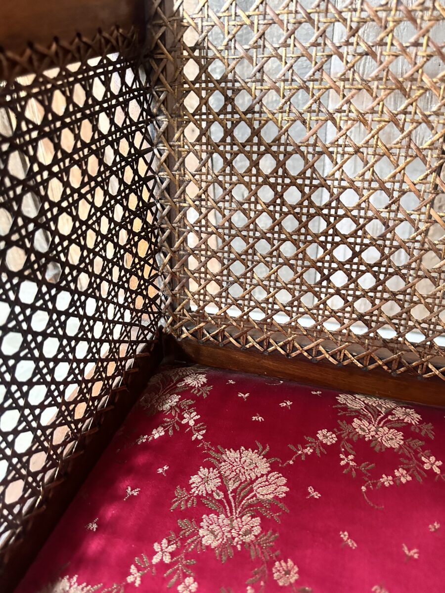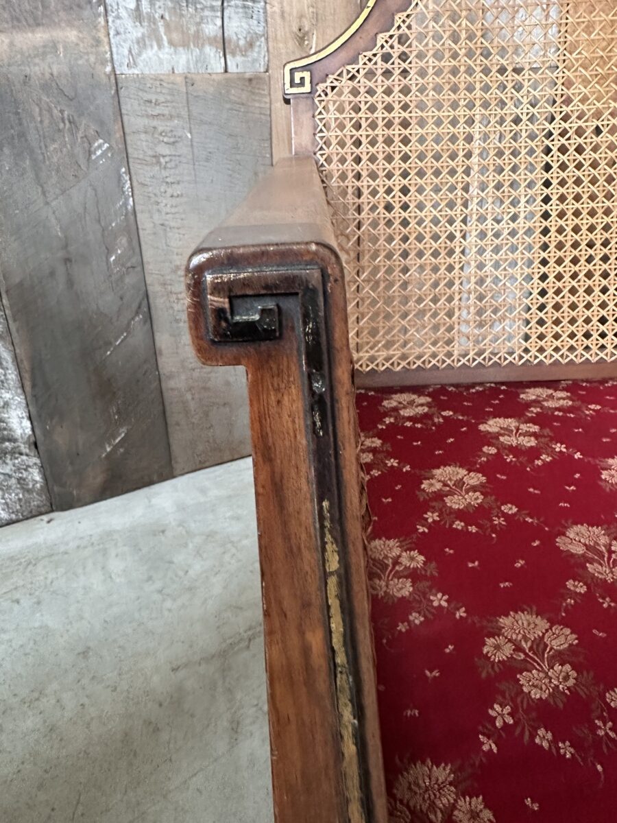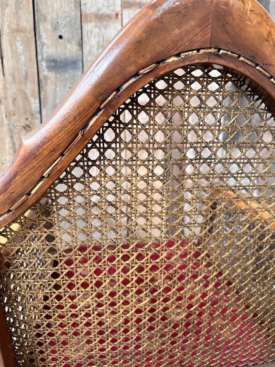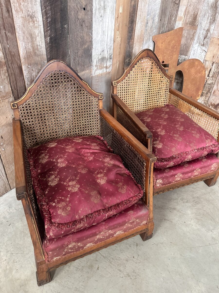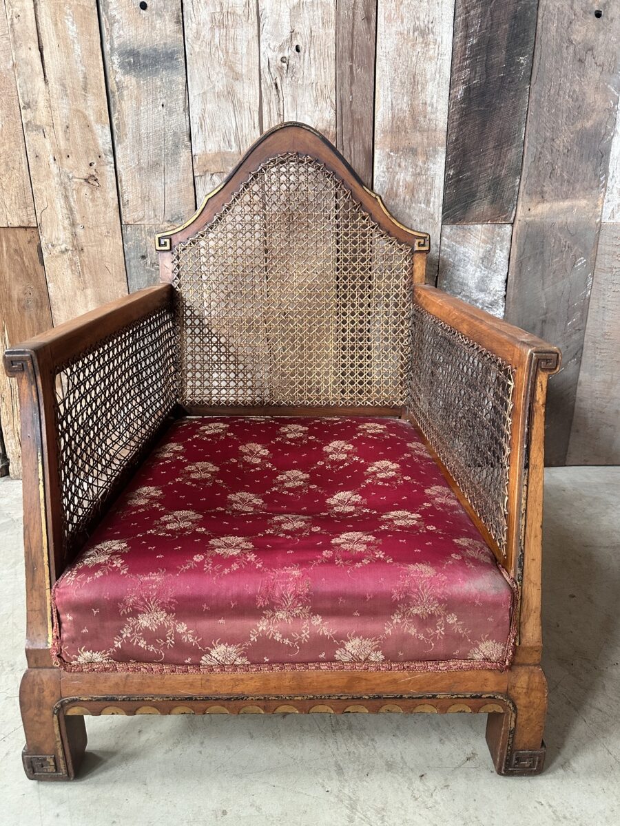An excellent original matching pair of Anglo Indian Colonial armchairs, dating from the early 19th century. Exquisite original gilt painted greek tooth decoration. Bergere cane in good order all round. Silk floral red upholstery. Lovely examples of Anglo Indian colonial furniture.