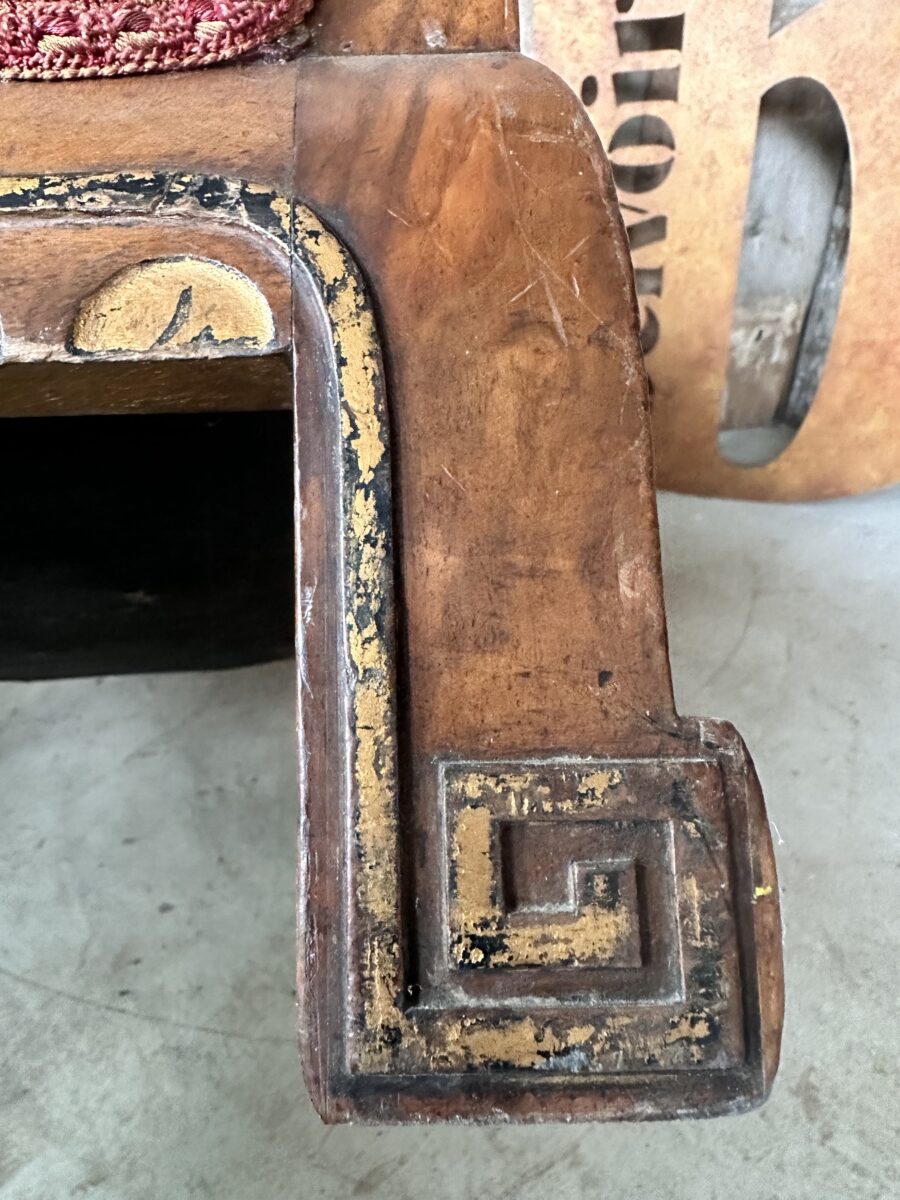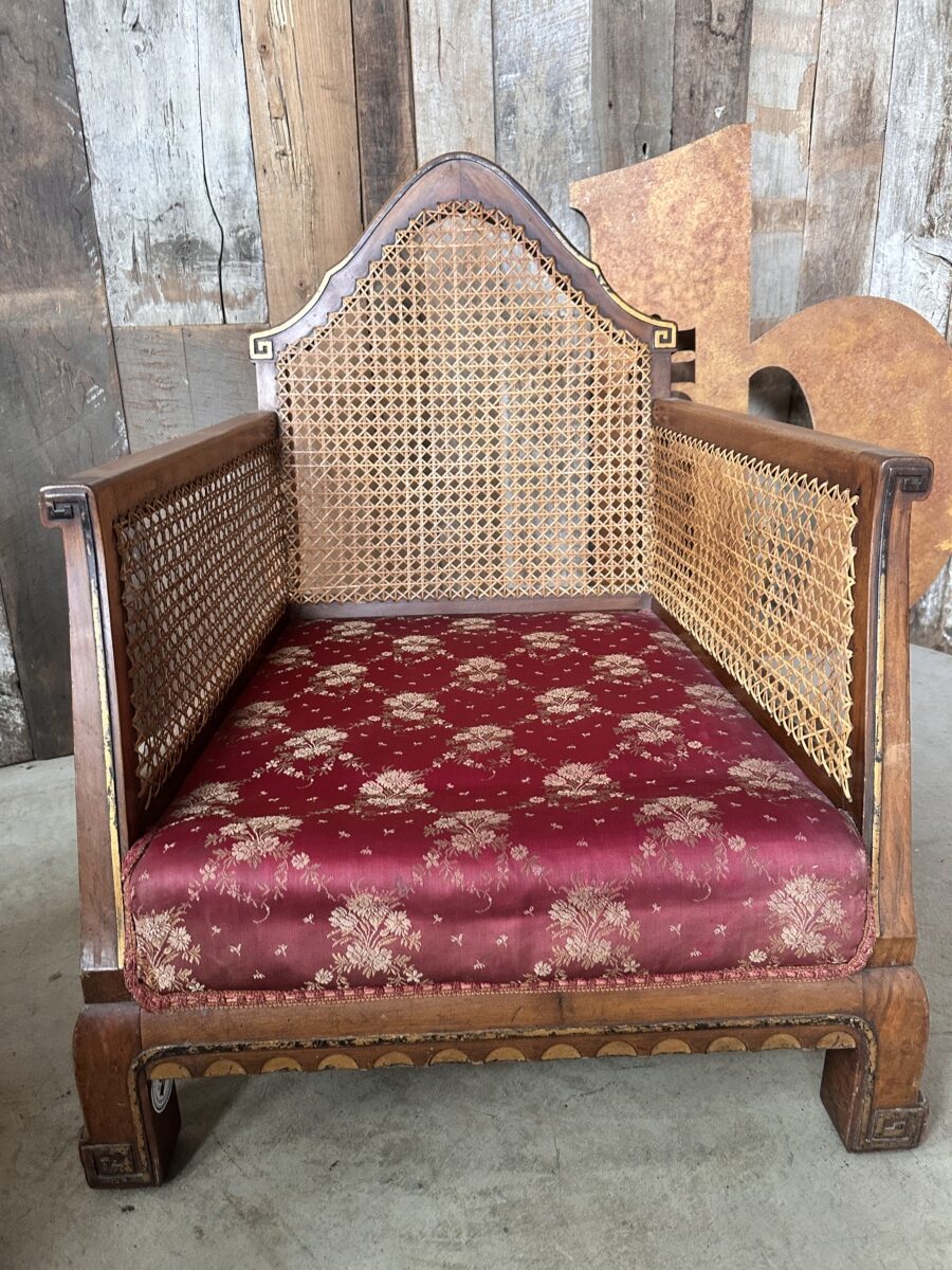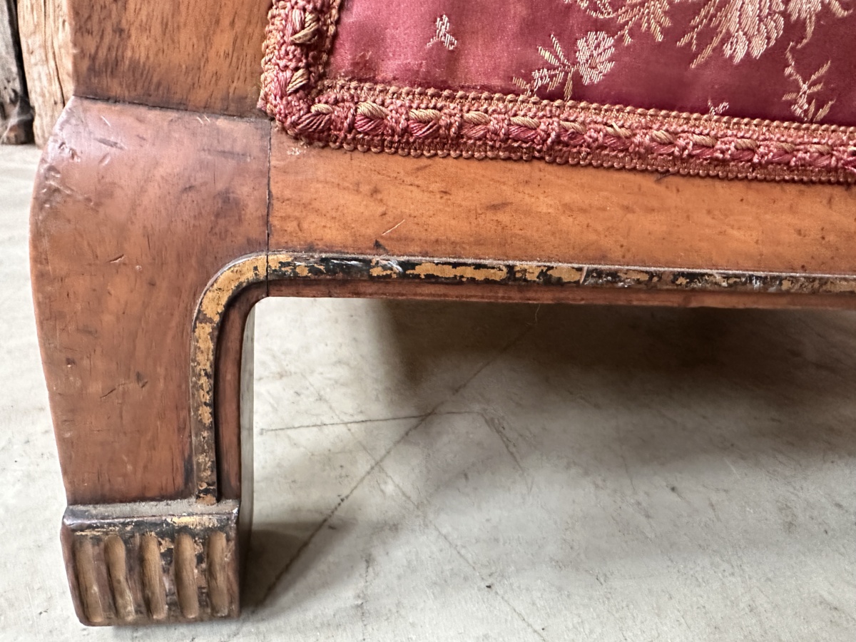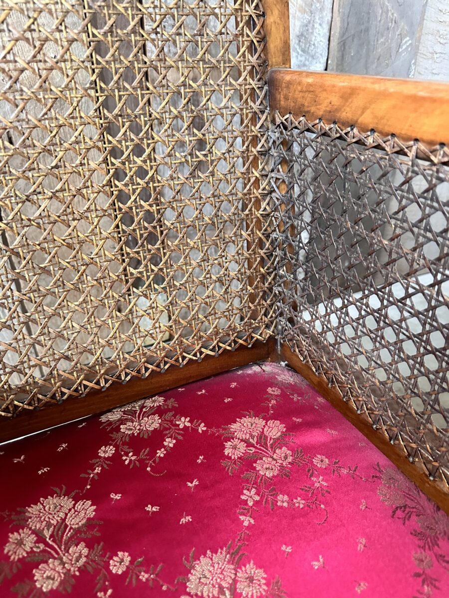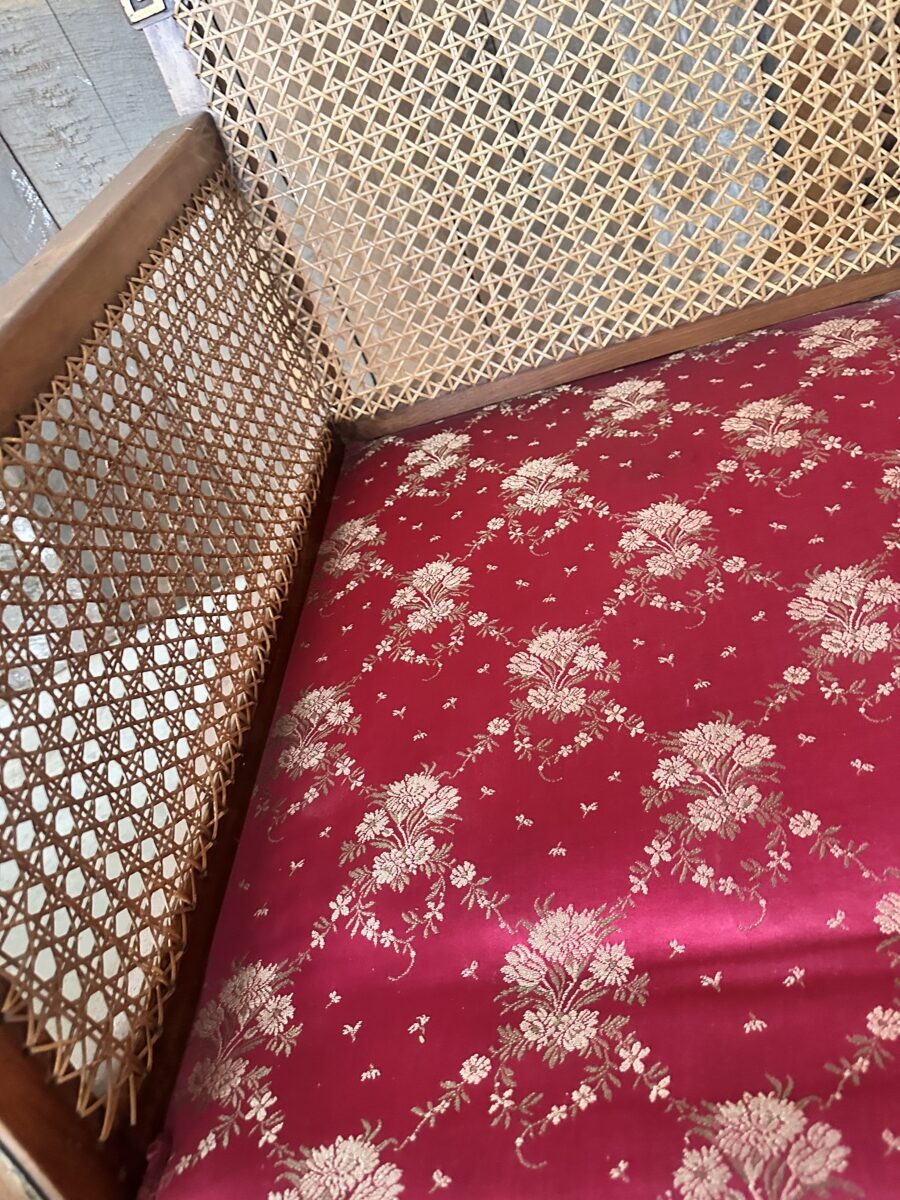 An excellent original matching pair of Anglo Indian Colonial armchairs, dating from the early 19th century. Exquisite original gilt painted greek tooth decoration. Bergere cane in good order all round. Silk floral red upholstery. Lovely examples of Anglo Indian colonial furniture.