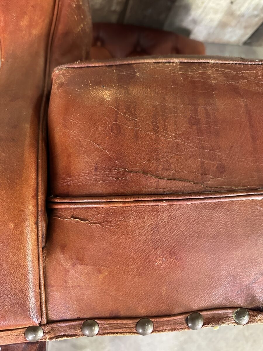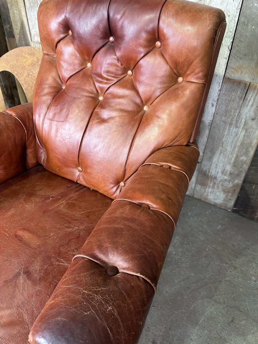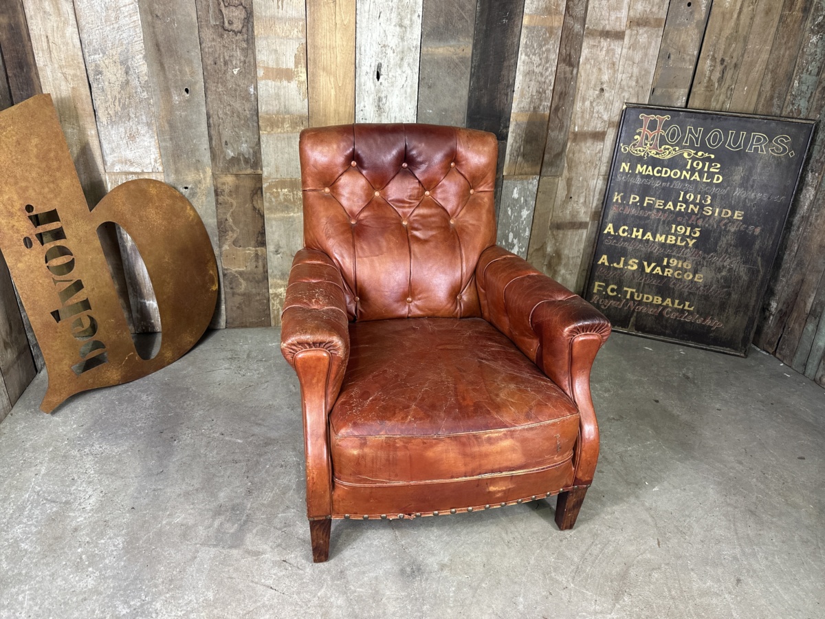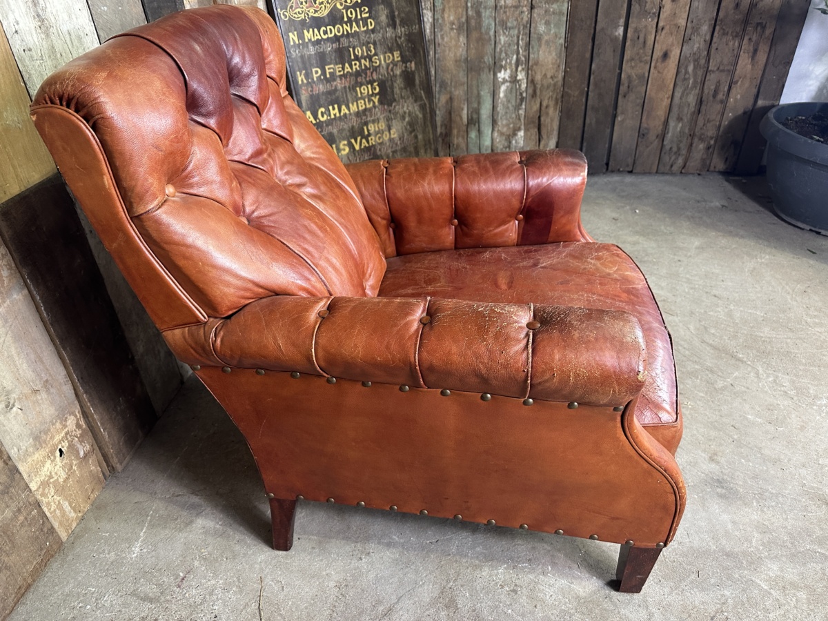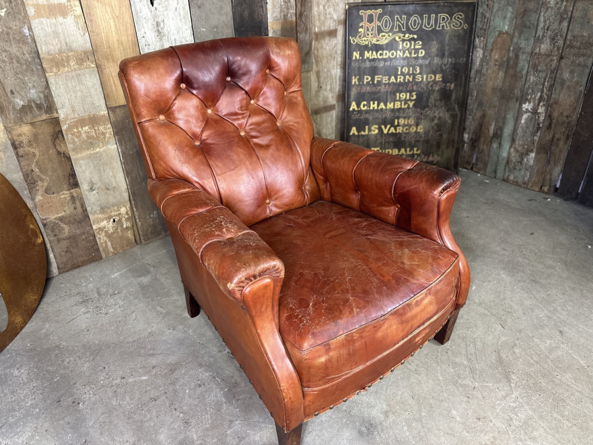 An original French brown leather club chair armchair, mid century. Original red/brown hide, button back, lumbar and arms. Deep seated cushion seat. Stile legs. Good original patination and signs of wear, commensurate with age.