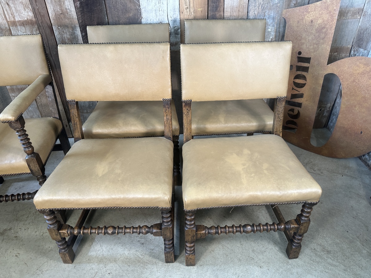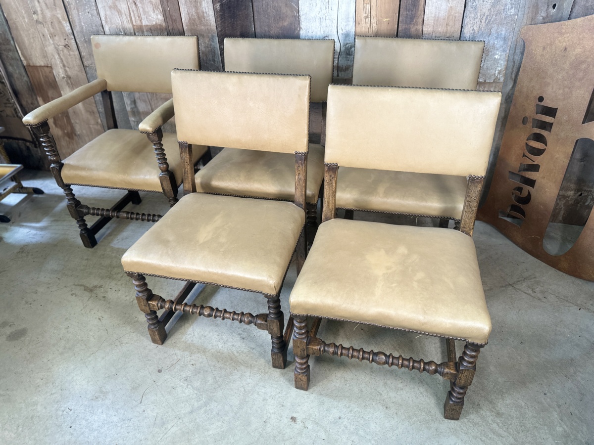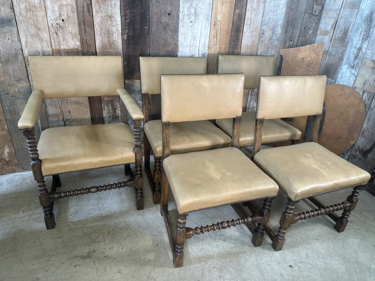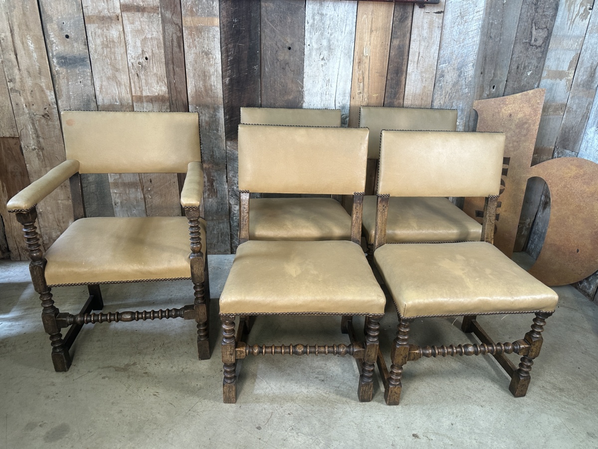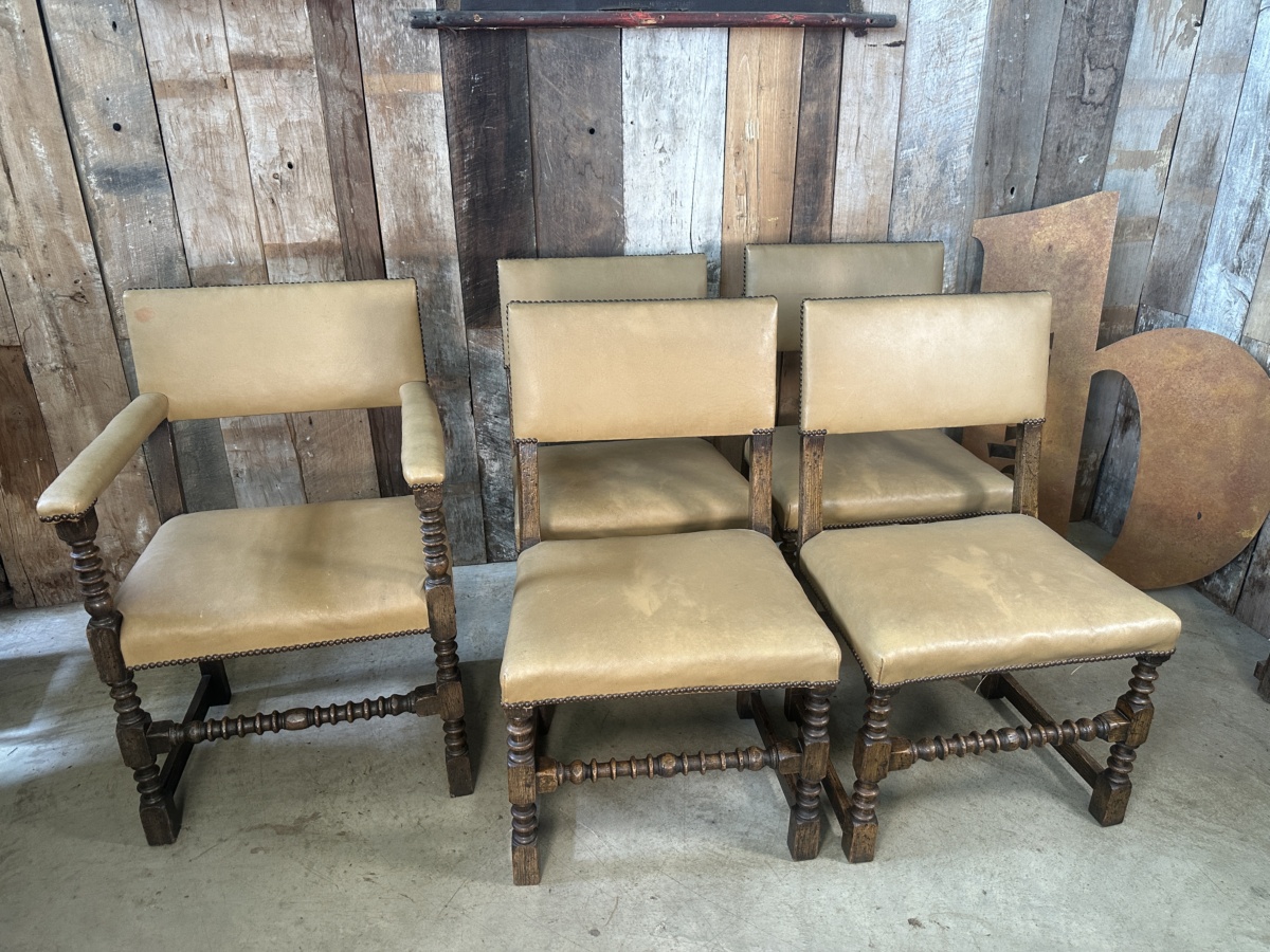 Antique Set Five Oak Leather Dining Cromwellian Chairs, c 1920