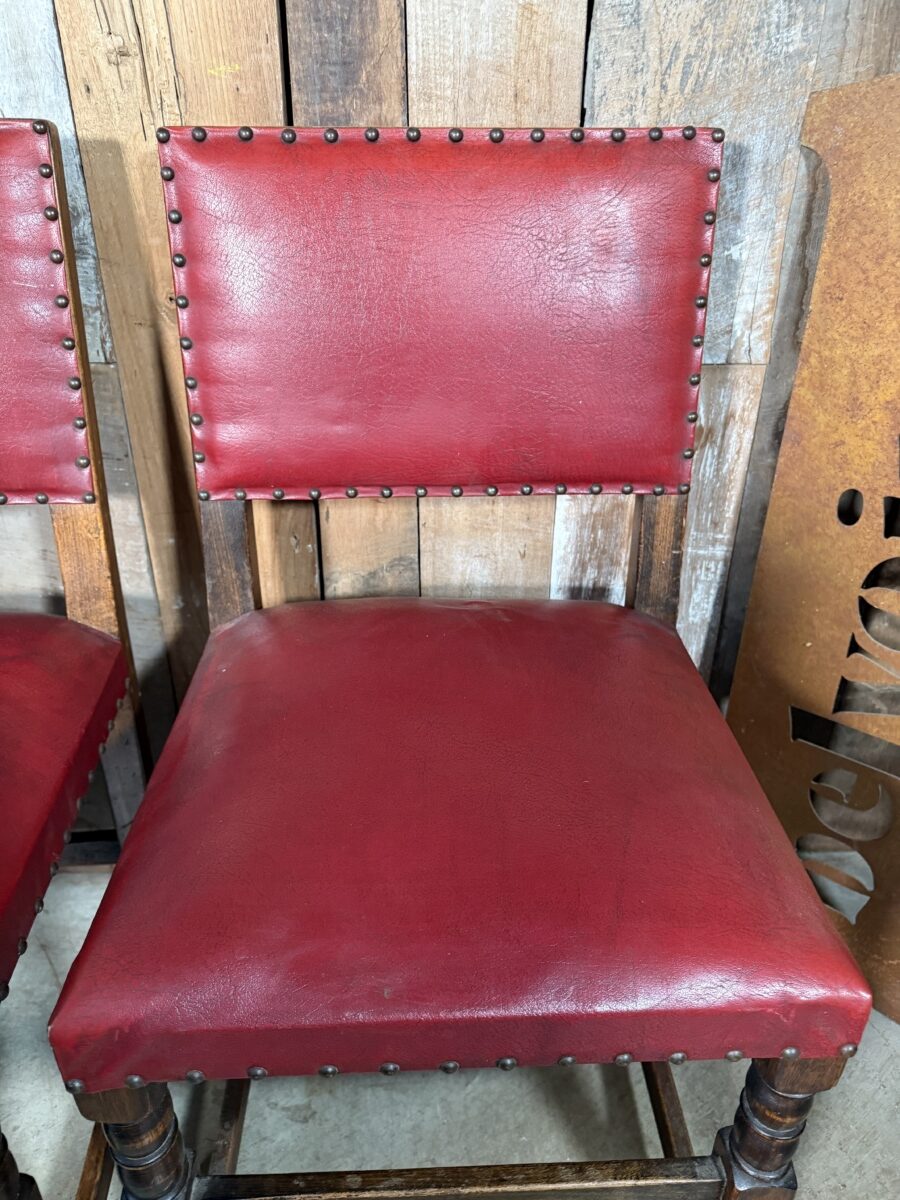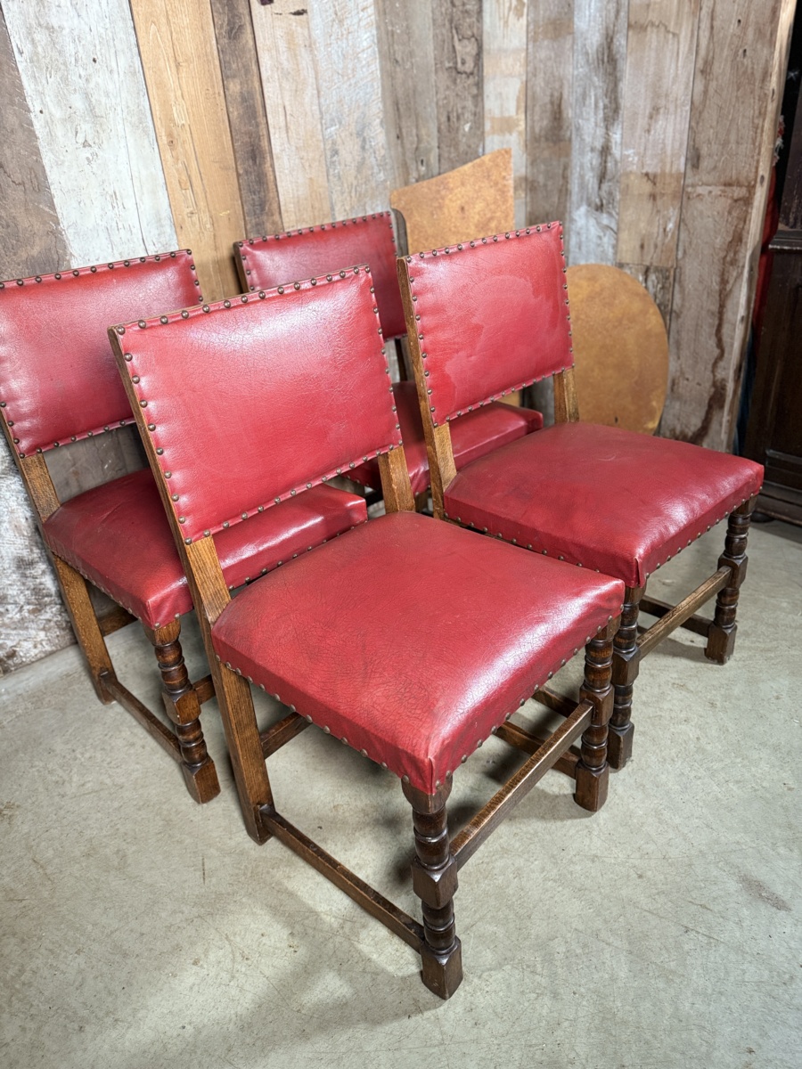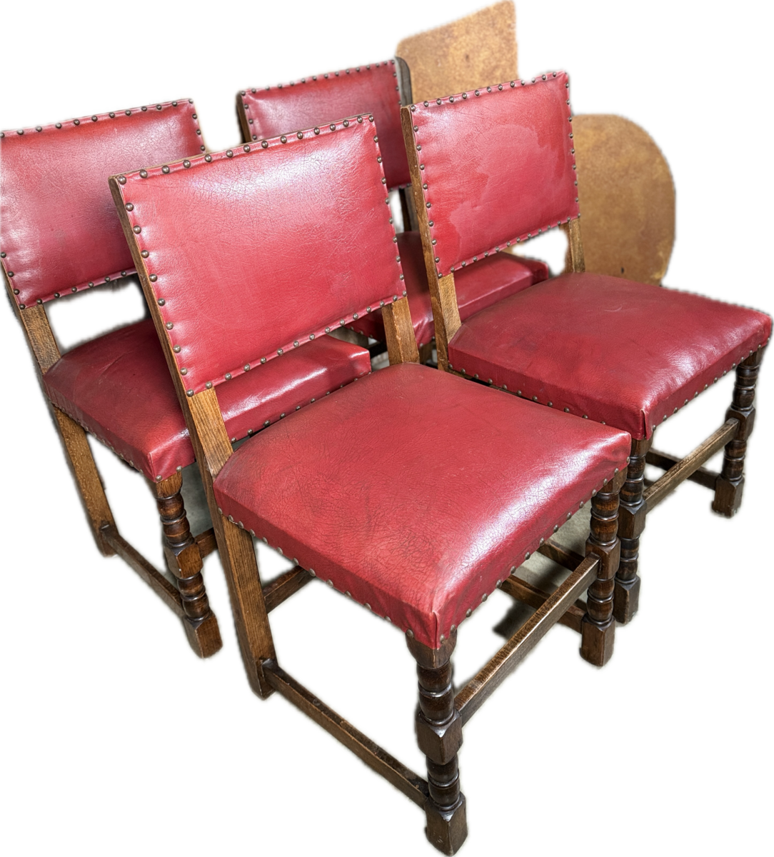 Antique Set Four Oak Cromwellian Revival Old English Dining Chairs Red, c1940