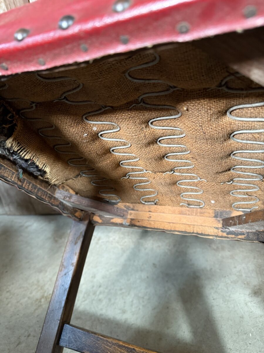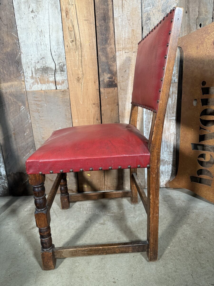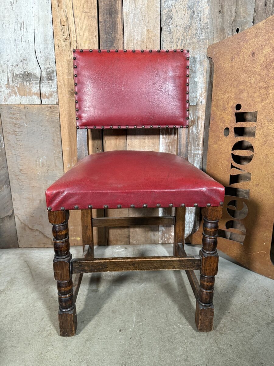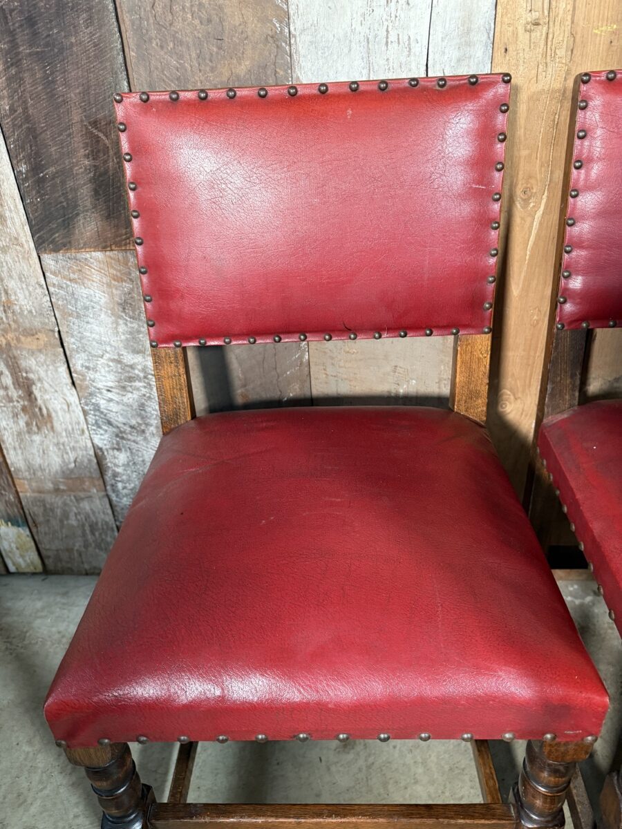 Antique Set Four Oak Cromwellian Revival Old English Dining Chairs Red, c1940