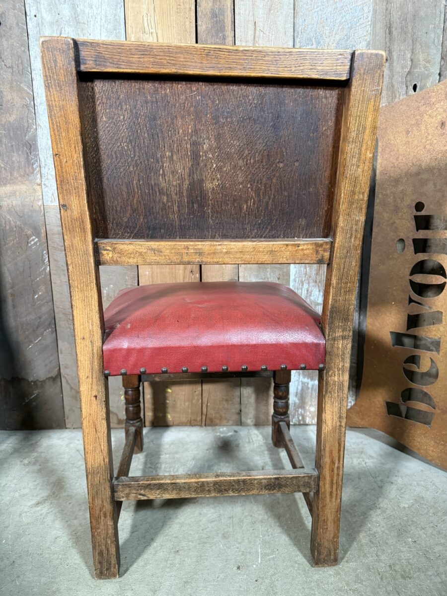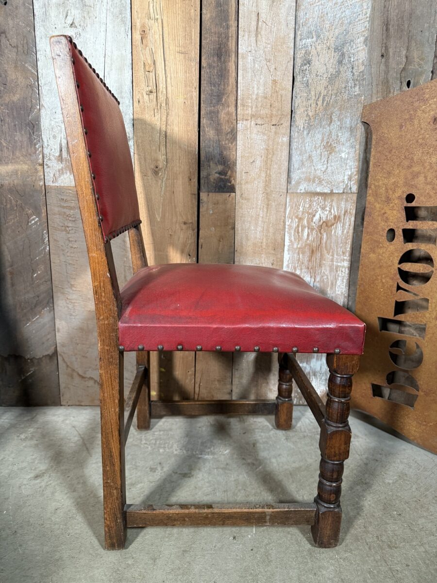 A good matching set of four solid oak Cromwell revival dining chairs, dating from the mid twentieth century. Original red leatherette seats. Good solid order. throughout.