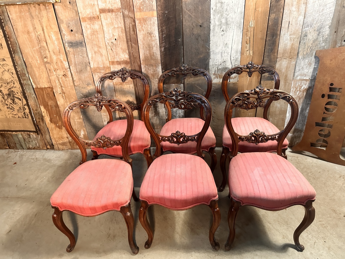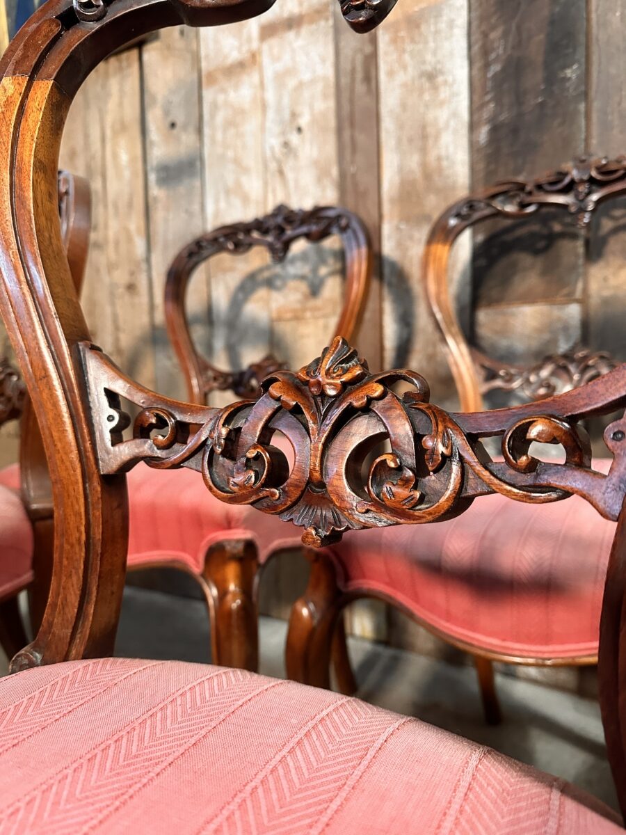 A very good set of solid walnut balloon back dining chairs, dating from the early 19th century. Extensive foliate carved detail throughout. Cabriole legs. Upholstered in a pink heavy gauge fabric.
