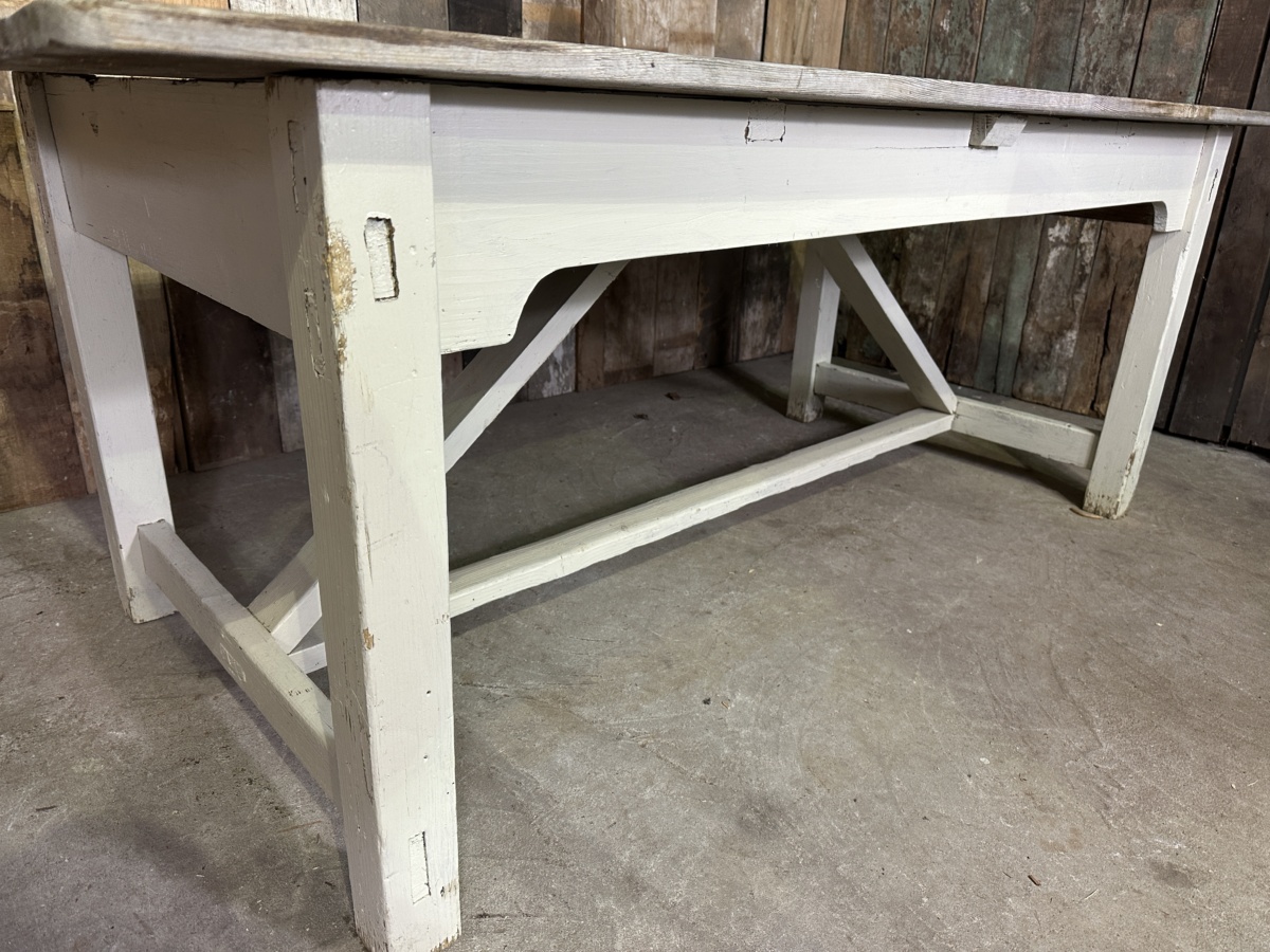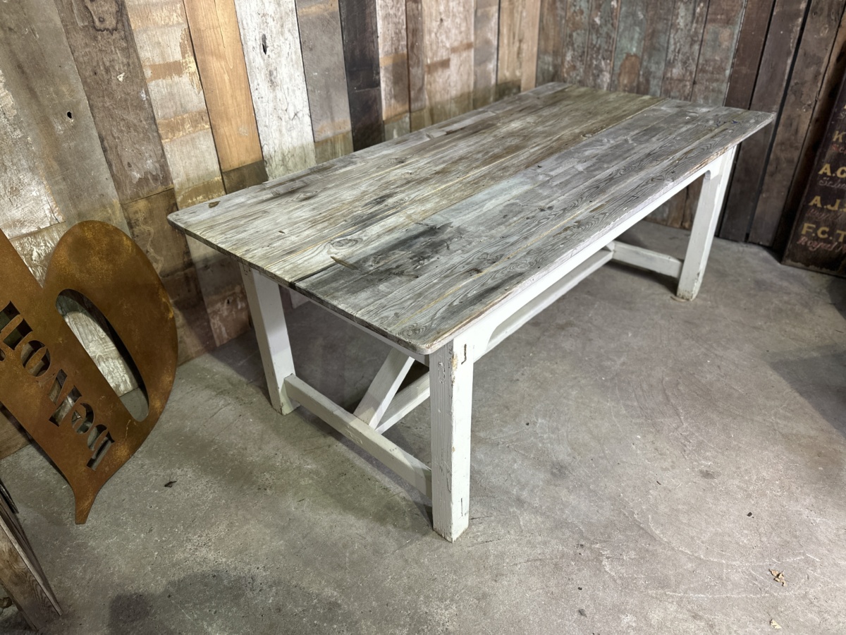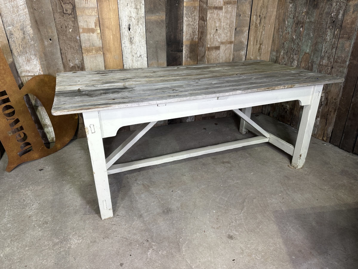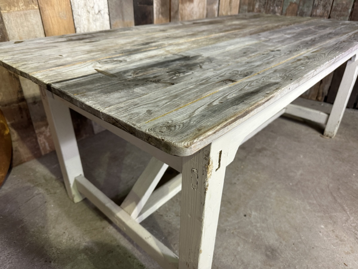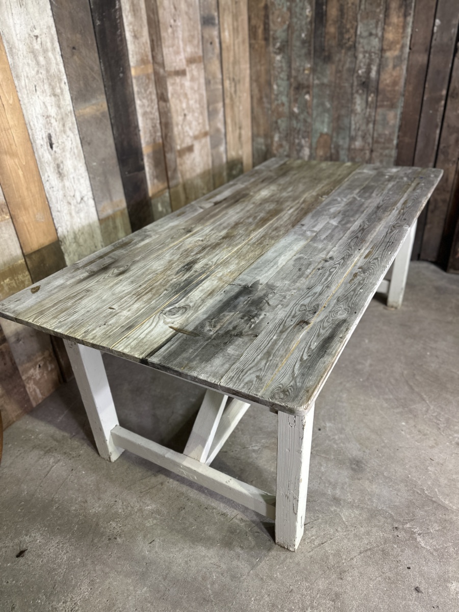 A well proportioned vintage pine trestle kitchen table, dating from the mid 20th century. Good silvering colour to the plank top, over painted trestle base. Very solid and sturdy piece.