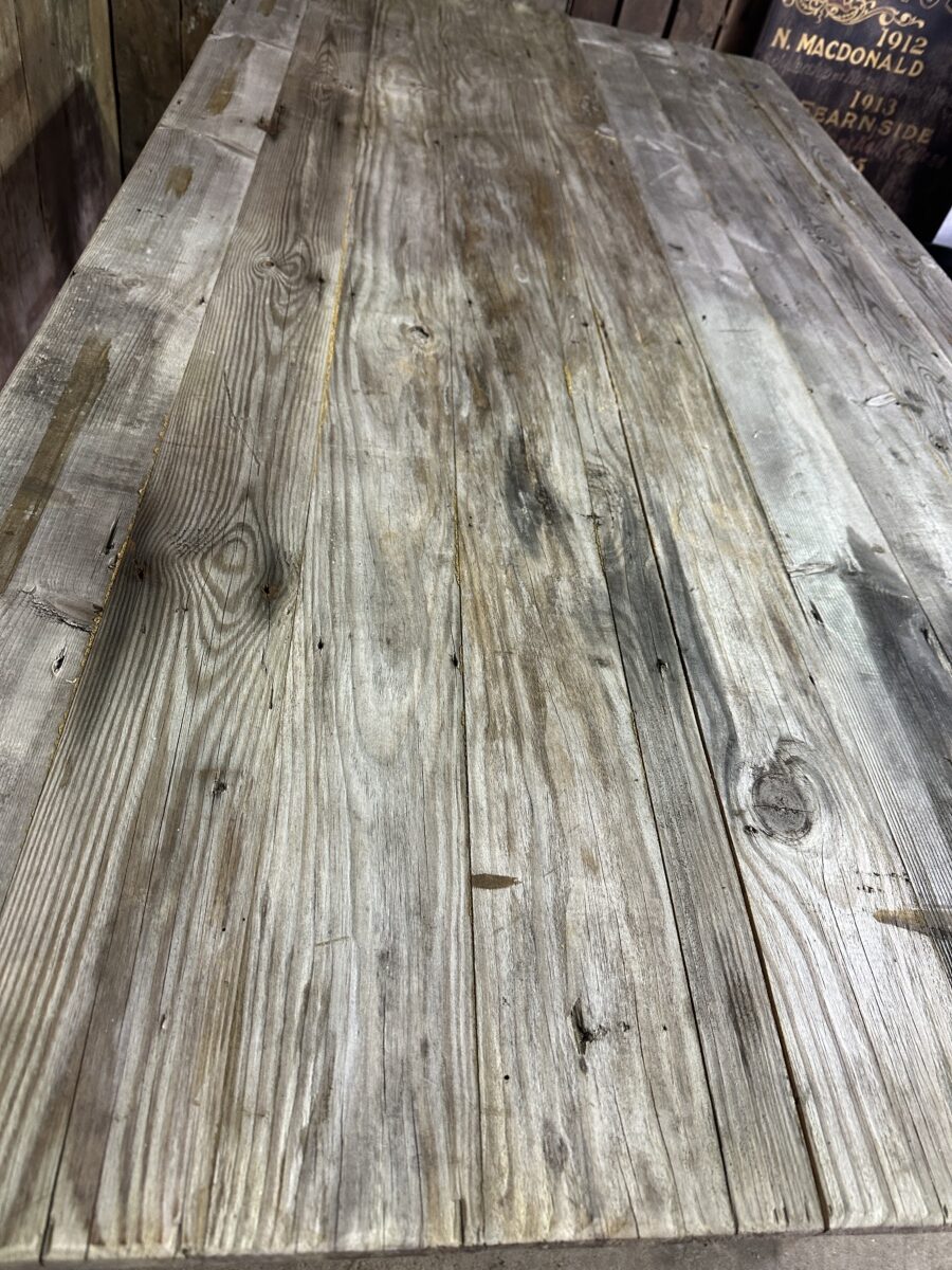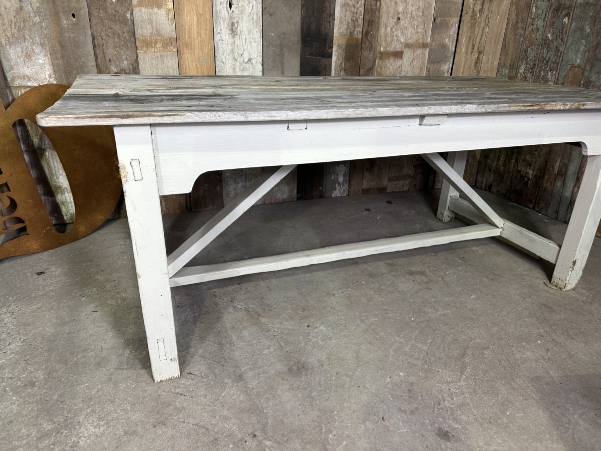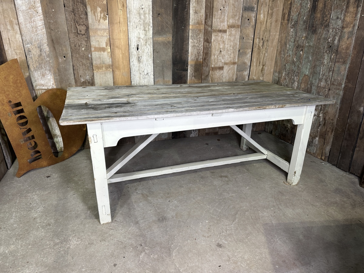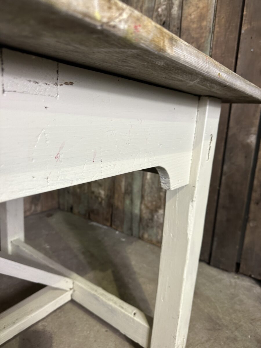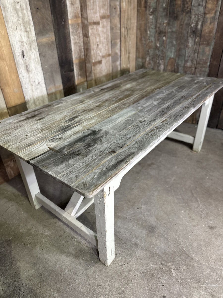 A well proportioned vintage pine trestle kitchen table, dating from the mid 20th century. Good silvering colour to the plank top, over painted trestle base. Very solid and sturdy piece.