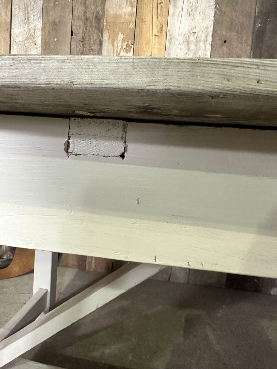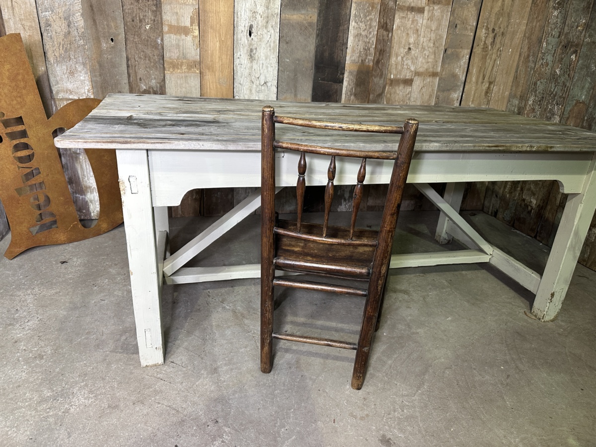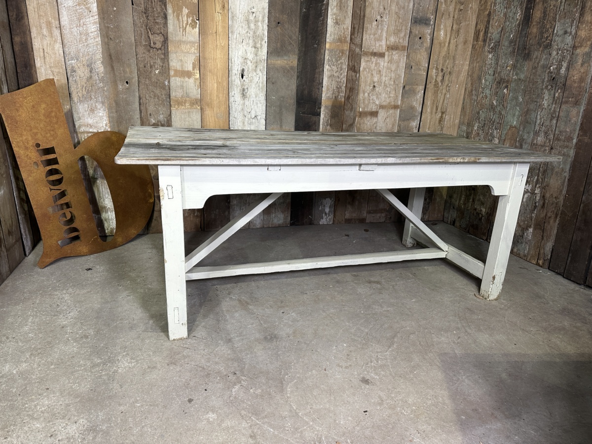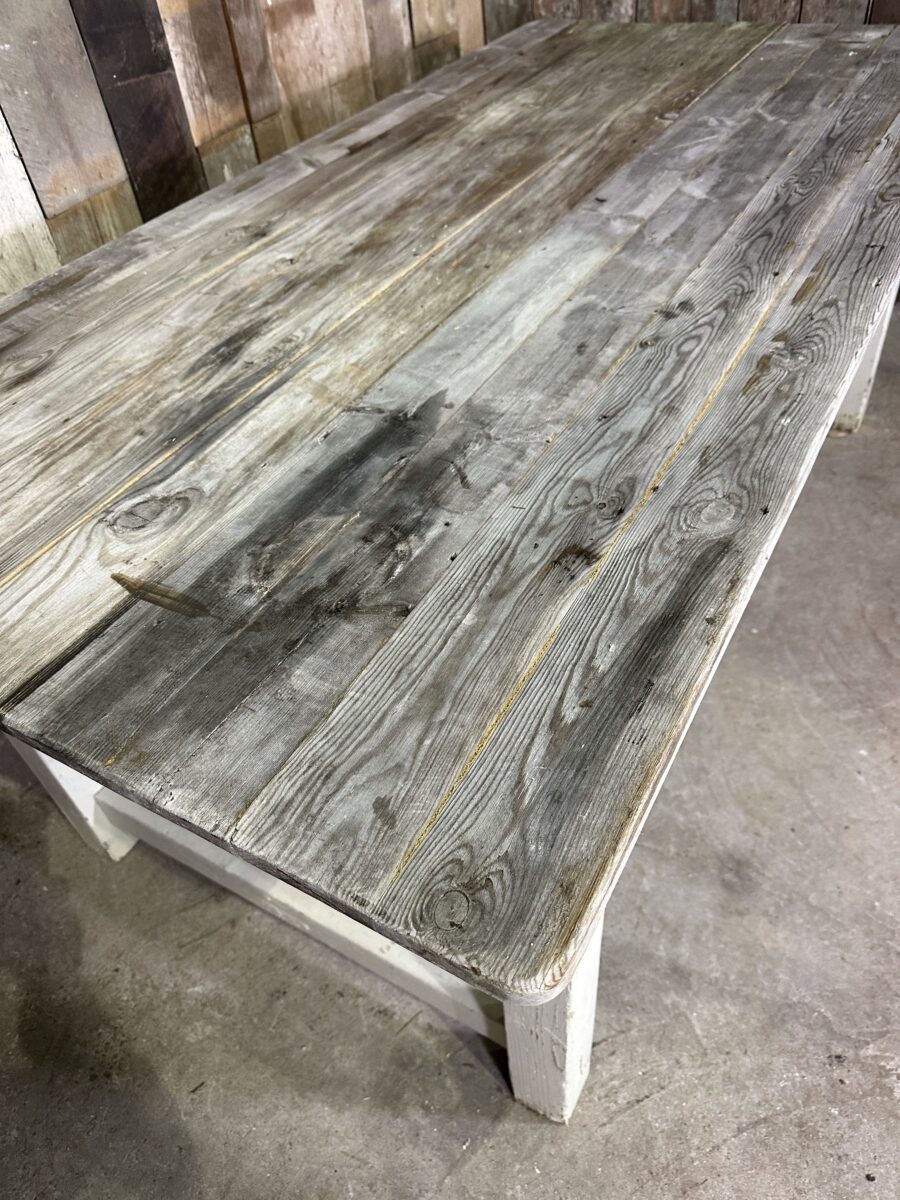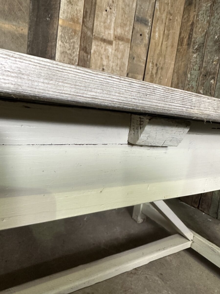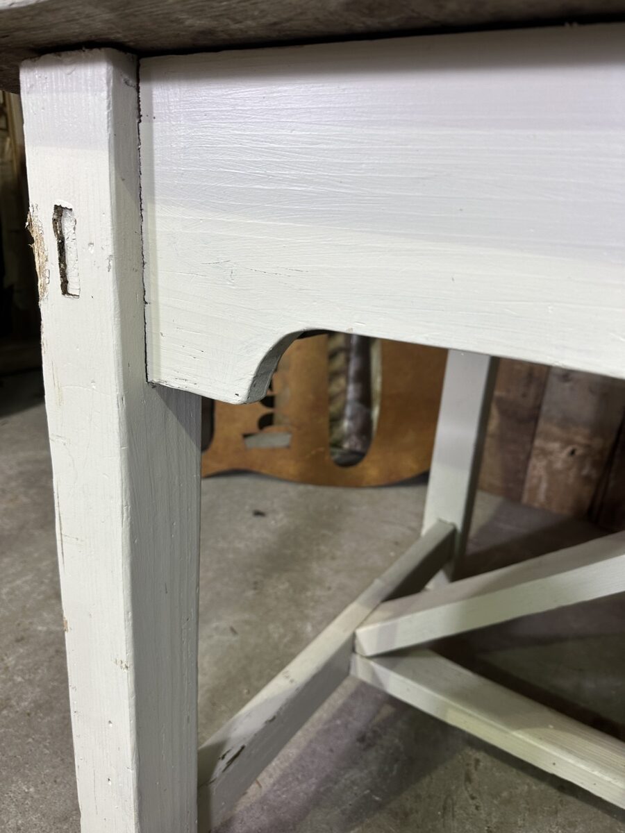 A well proportioned vintage pine trestle kitchen table, dating from the mid 20th century. Good silvering colour to the plank top, over painted trestle base. Very solid and sturdy piece.