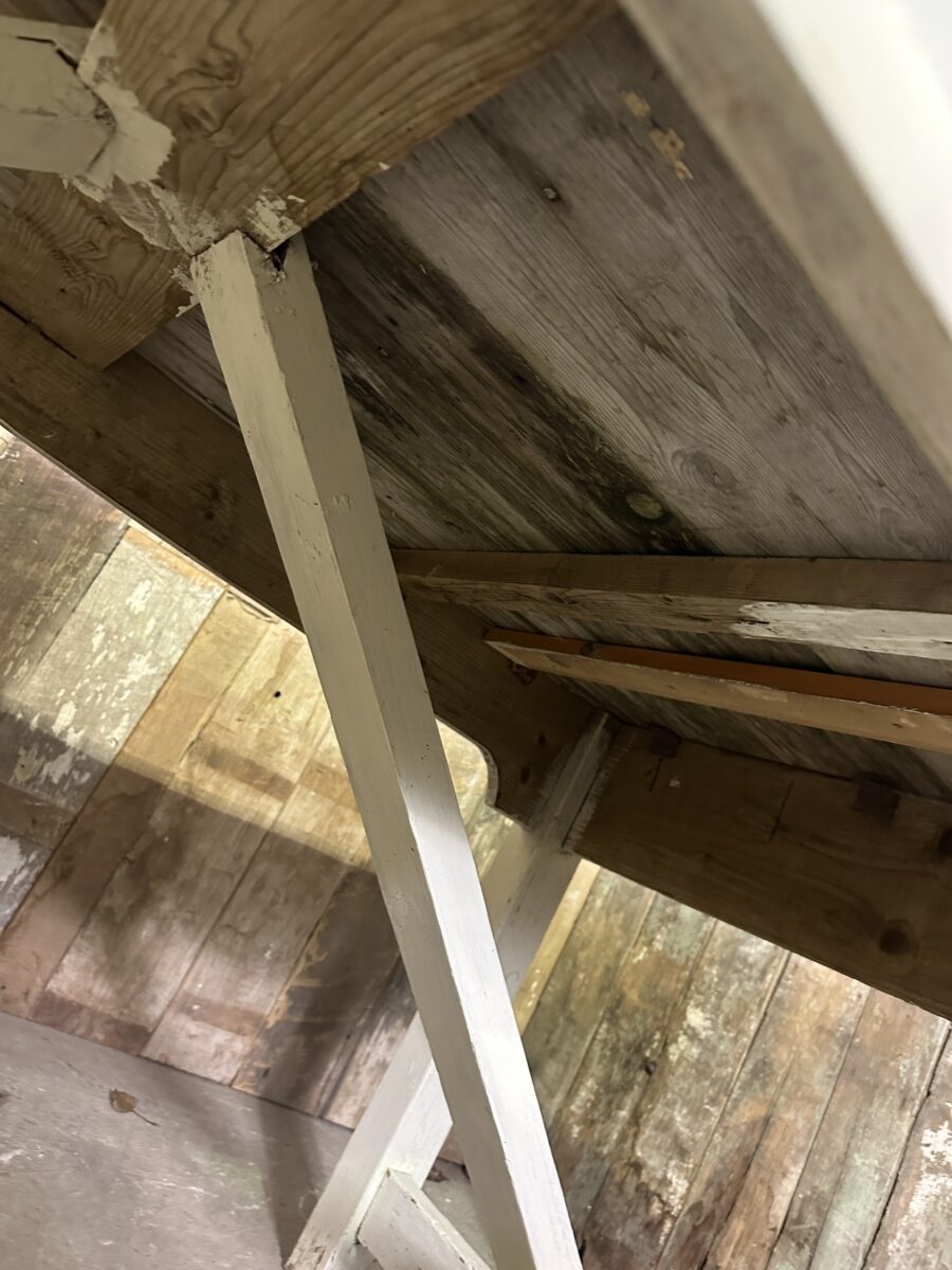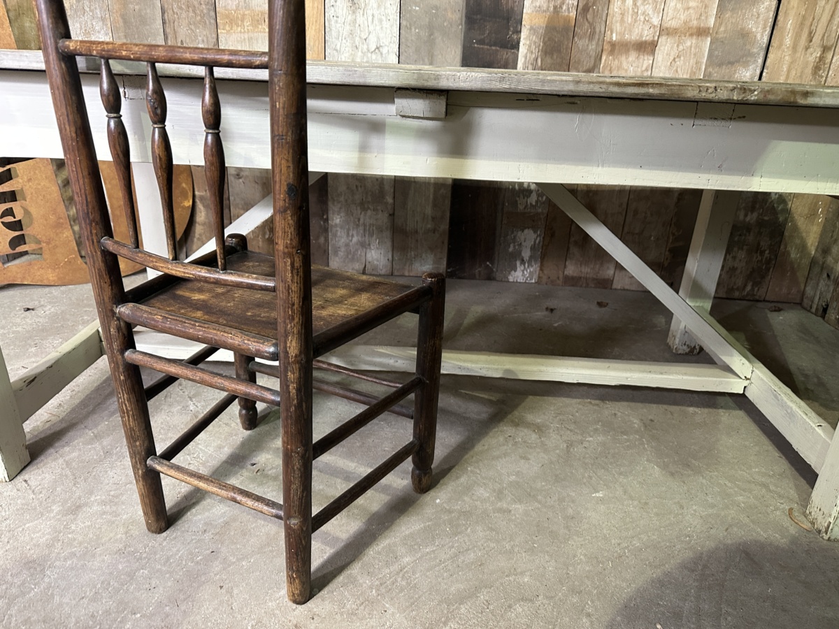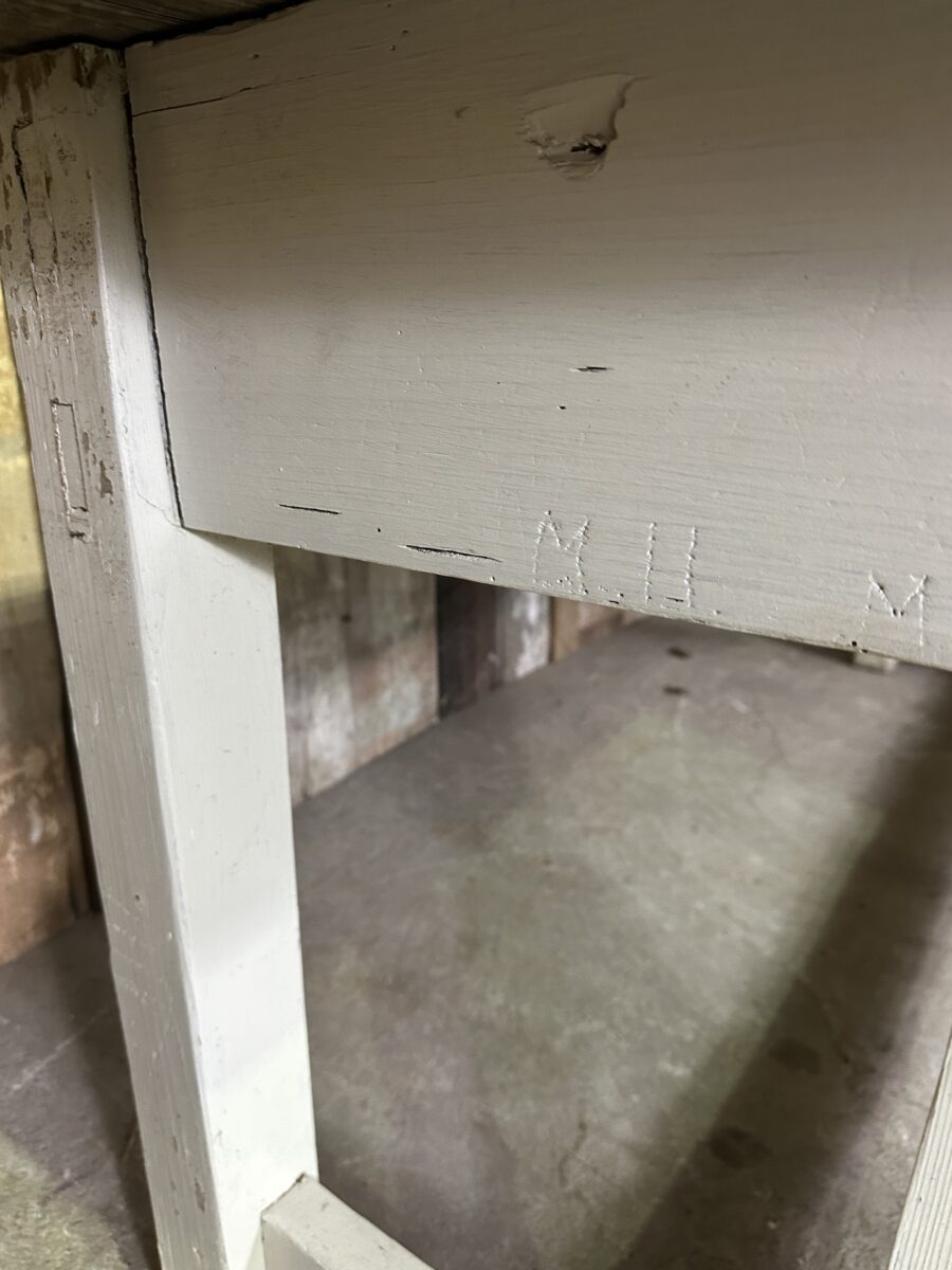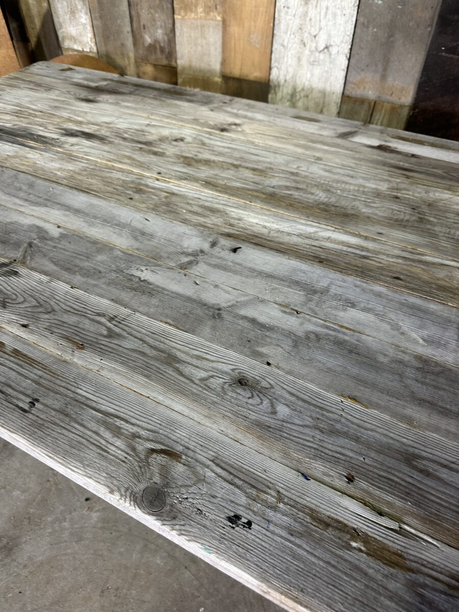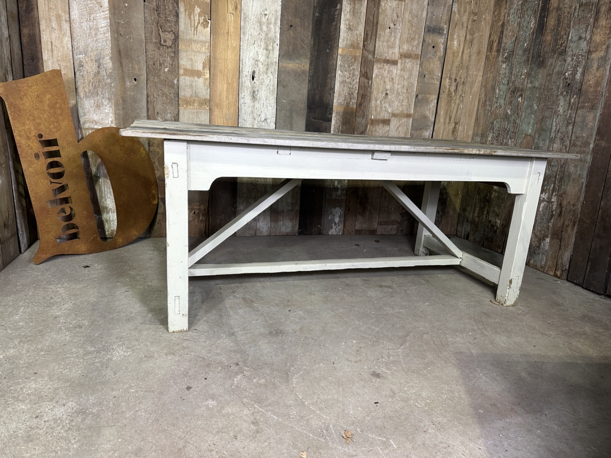 A well proportioned vintage pine trestle kitchen table, dating from the mid 20th century. Good silvering colour to the plank top, over painted trestle base. Very solid and sturdy piece.