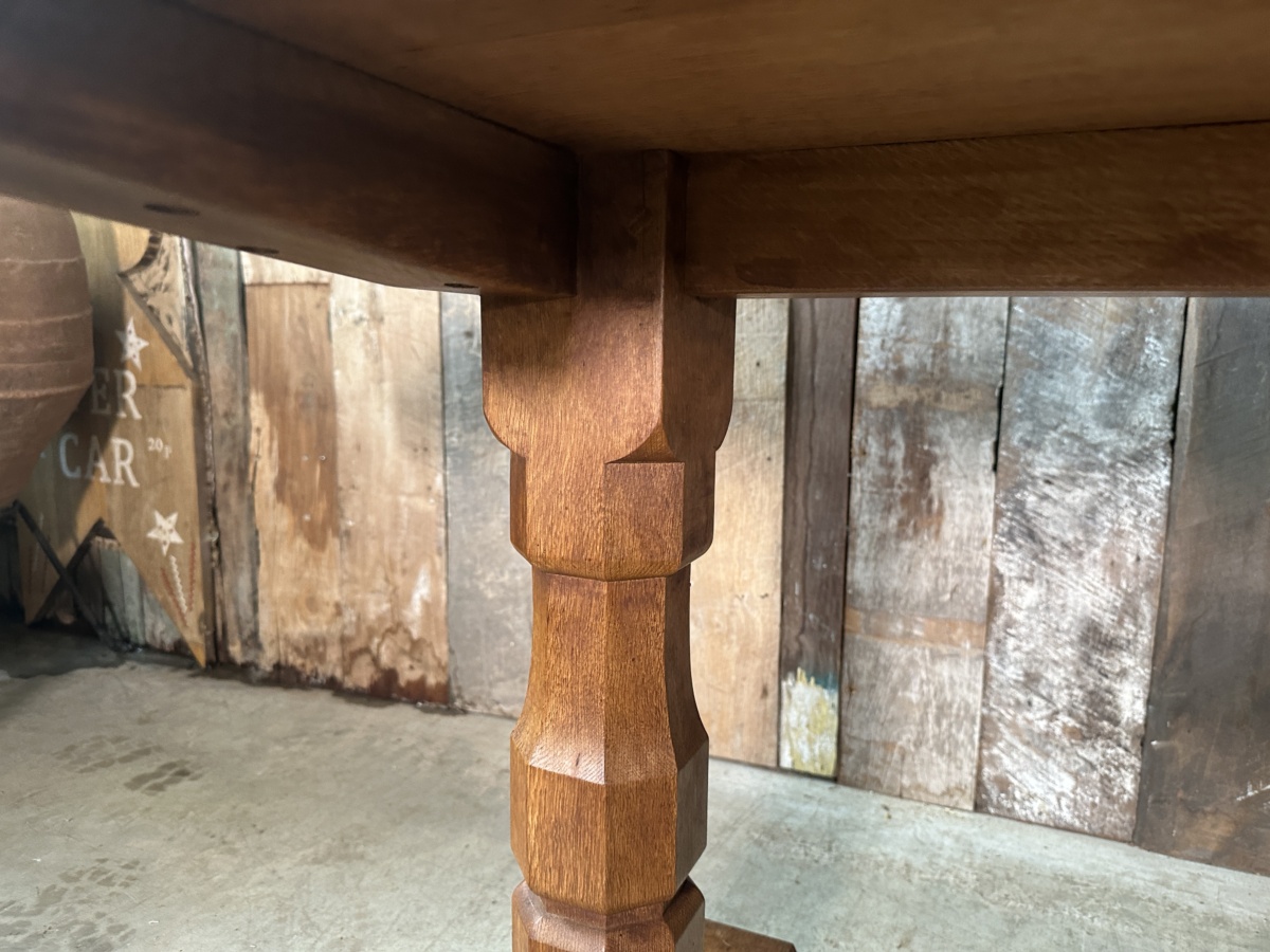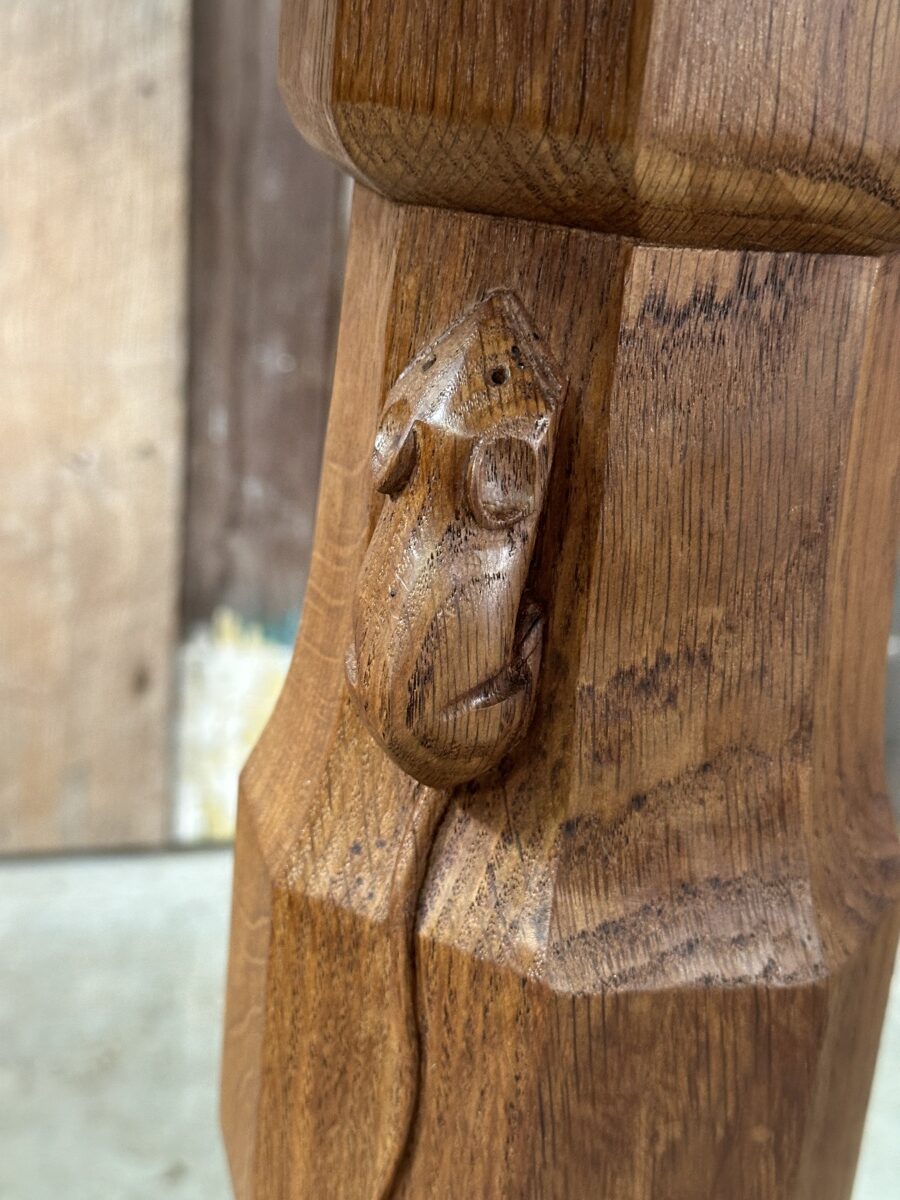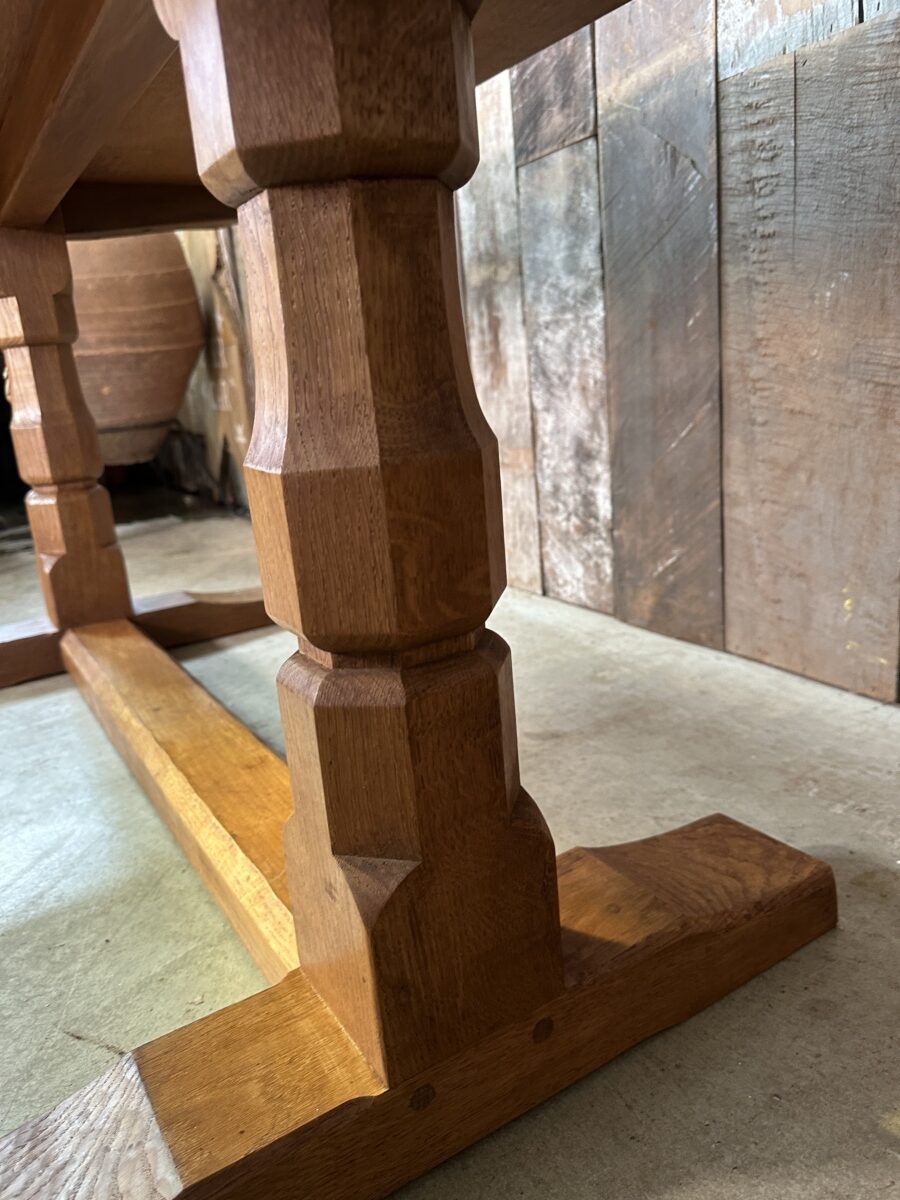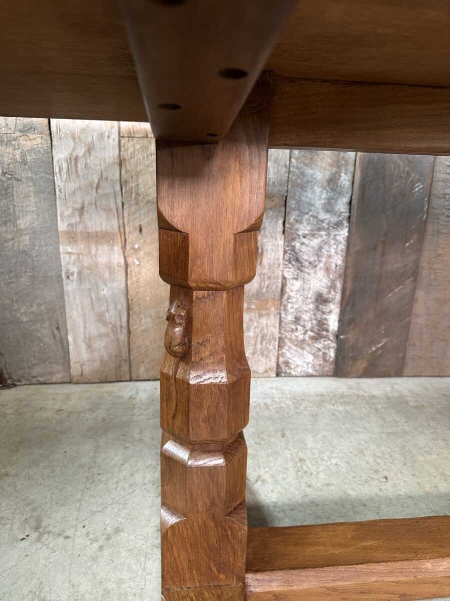 Stunning solid oak refectory dining table with a four-plank adzed top. Two beautifully hand carved faceted balusters supports, one with signature carved  mouse. Joined by a chamfered and adzed floor stretcher. A superb investment piece.