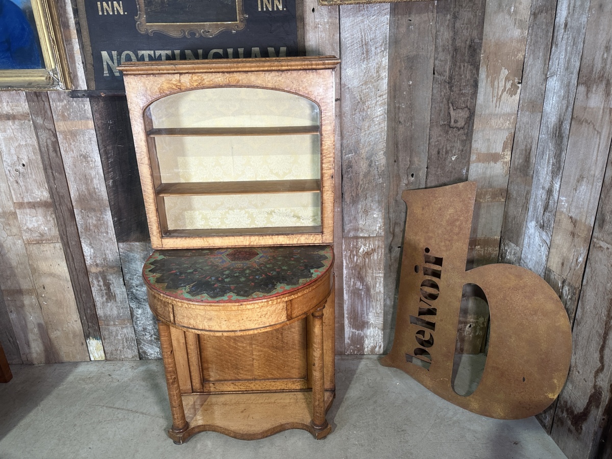 An exceptional French side cabinet dressing table, dating from the mid 19th century. Decorated in Burr Maple, the top with glazed sliding door enclosing fitted shelves, over painted slate surface with floral and scrolled designs, above a single fitted frieze drawer. Pair of turned column supports. Solid panelled sliding door to base, revealing further fitted shelving area. Raised on shaped platform base with bun feet. A really beautiful piece.